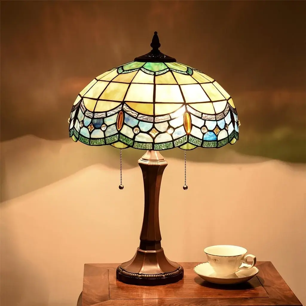 Tiffany Table Lamp Stained Glass Victorian Style Bedside Lamp Blue Baroque Reading Desk Light 16X16X23 Inches Decor Nightstand Bedroom Living Room Home Office 【Classic Design】 This Tiffany table lamp features a stained glass shade vase base body, a dark bronze resin base with two light sockets and pull chains, and blue Tiffany-style lampshade. The combination of these elements creates an antique Victorian aesthetic. When the antique table lamp is turned on, it produces a crystal-clear lamp body and a pearlescent light effect that adds a romantic ambiance to the room. 【Hand-crafted Stained Glass Shade】 The vintage tiffany lampshade is made of real stained glass, ensuring the glass color will never fade. Tiffany stain glass lamp is a hand-crafted work of art, with skilled craftsmanship involved in every step, from glass cutting and wrapping copper foil to welding. The size of the bedside table lamp is 16 inches wide and 23 inches in height. 【Compatible Bulbs】 This Victorian Tiffany-style table lamp is compatible with two standard E26 medium base bulbs, such as LED, CFL, or incandescent bulbs, with a maximum wattage of 60 watts (bulbs not included). The double lamp head is designed in an S-shape, providing uniform and soft lighting. The retro pull-chain design adds to its practicality. Different bulbs will get different looking, our Stained Lamps photos took with warm Light Bulbs. 【Gift Decor Tiffany Lamps】 This unique Tiffany bedside table lamp emits a soft and warm glow when lit on, making it suitable for various rooms in your home, including living rooms, dining rooms, bedrooms, bathrooms, home offices, and more. This Tiffany style lamps can be placed on side tables, shelves, mantels, buffets, or even in windows. The colorful glass shades and antique finishing bases add a touch of sophistication and elegance to any space, making it a great gift or decorative item. 【UL Listed&Warranty】 Our Tiffany Lamps are UL listed. We offer a 3-year warranty for quality and free returns and refunds on this bedroom desk lamps in new condition. They also provide customer support for inquiries, consultation, and assistance with lamp design, quality, installation, and maintenance. 24-hour customer service to address any potential accidents or issues..