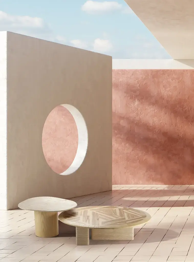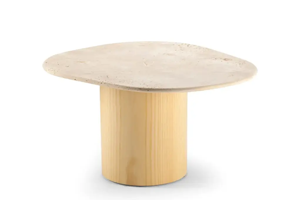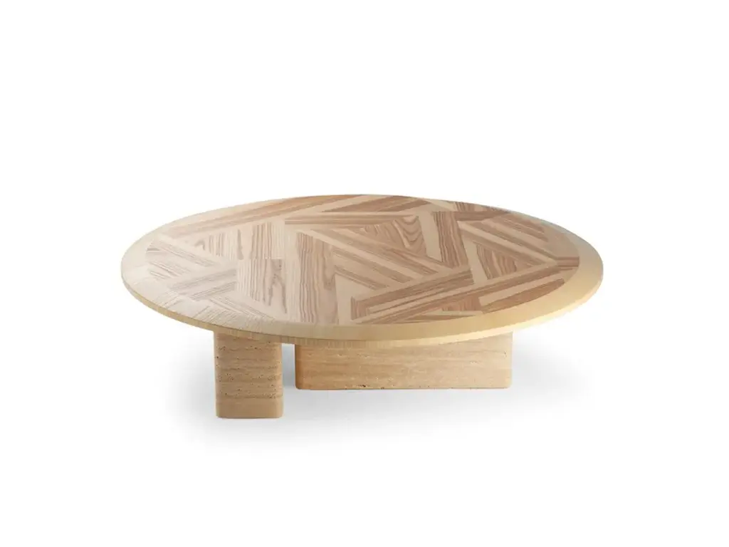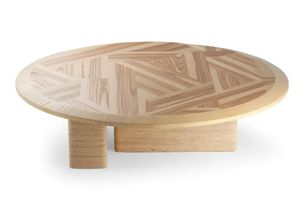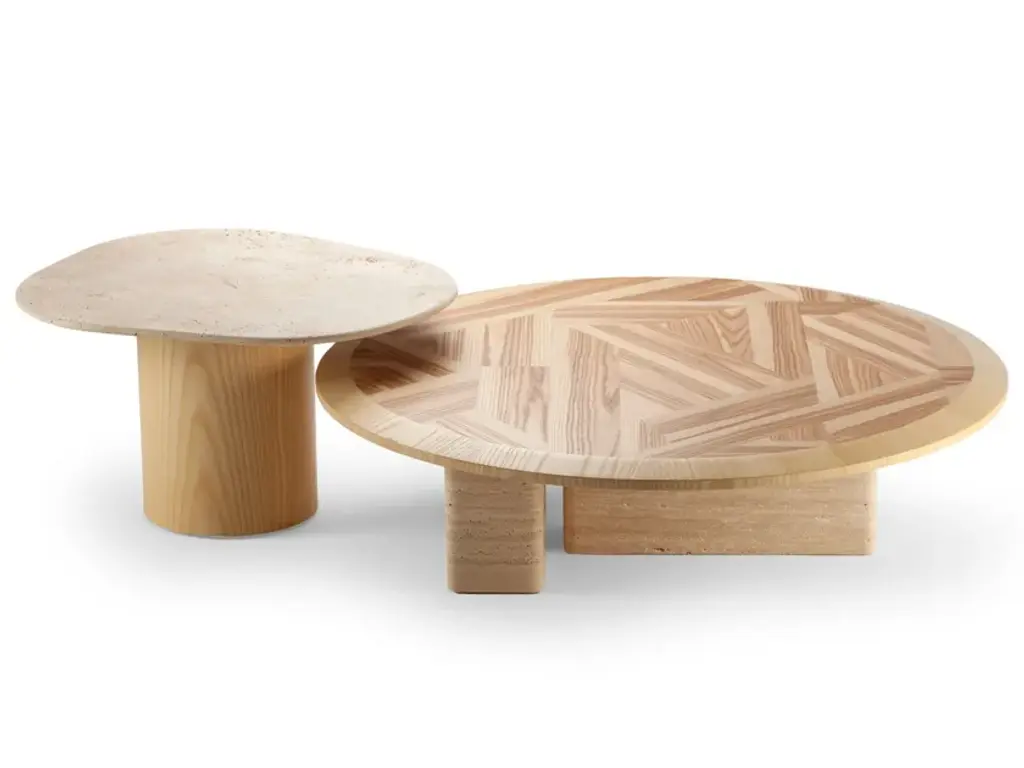 L’Anamour is a set of coffee and side tables, which complement and complete each other. The connection between them is as perfect as a poet-muse relationship, with emotions fl ying high and low but ultimately resulting in passionate adoration and deeper connection. Natural wood marquetry and exquisite travertine provide the perfect combination of carefree and refi ned style to L’anamour.Top: Natural or red travertine (for side table) and natural or nude olive ash (for center table)Base: Natural ash or nude lacquered wood (for side table) and natural travertine or nude lacquered wood (for center table)