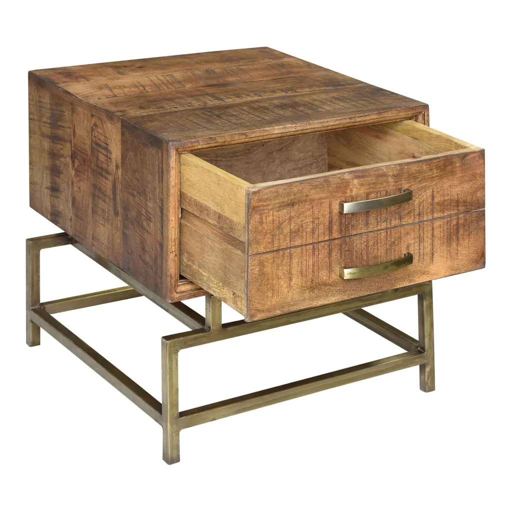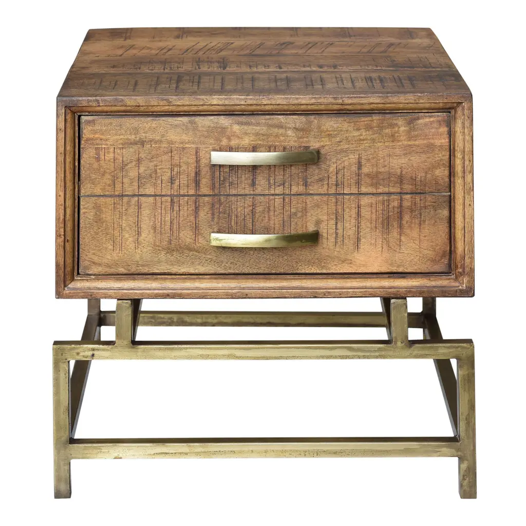 Handcrafted of kiln-dried mango wood, the Lanark side table features a square drawer with twin brass-toned pulls that match its open and angular base. A compact accent table that displays decor and stores accessories, its streamlined geometric legs make it easy to place in small spaces alongside a chair or bed. This mixed-material nightstand looks alluring wherever you place it with its rustic natural surface and refined metallic base.