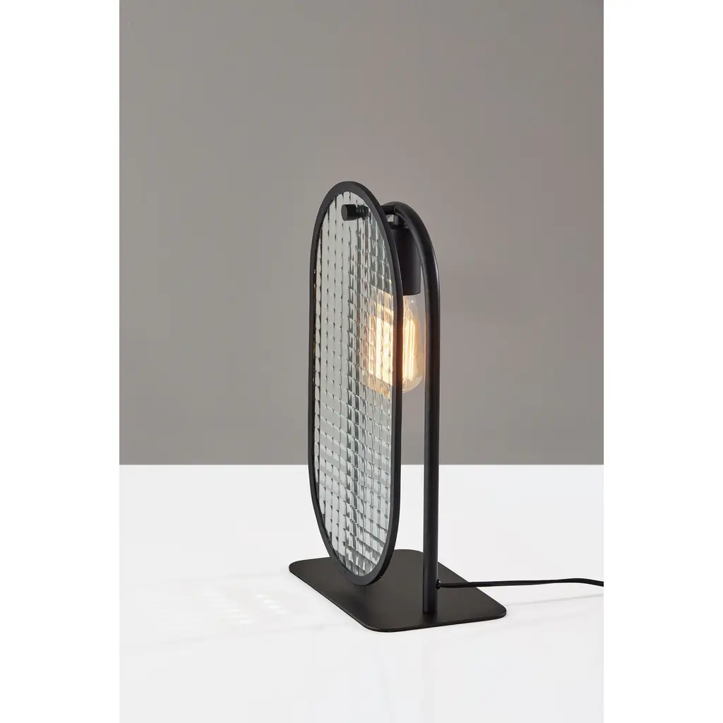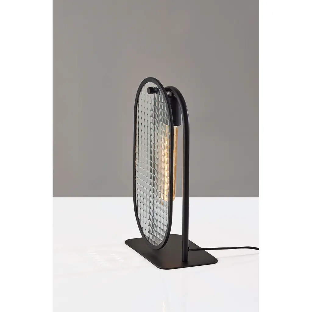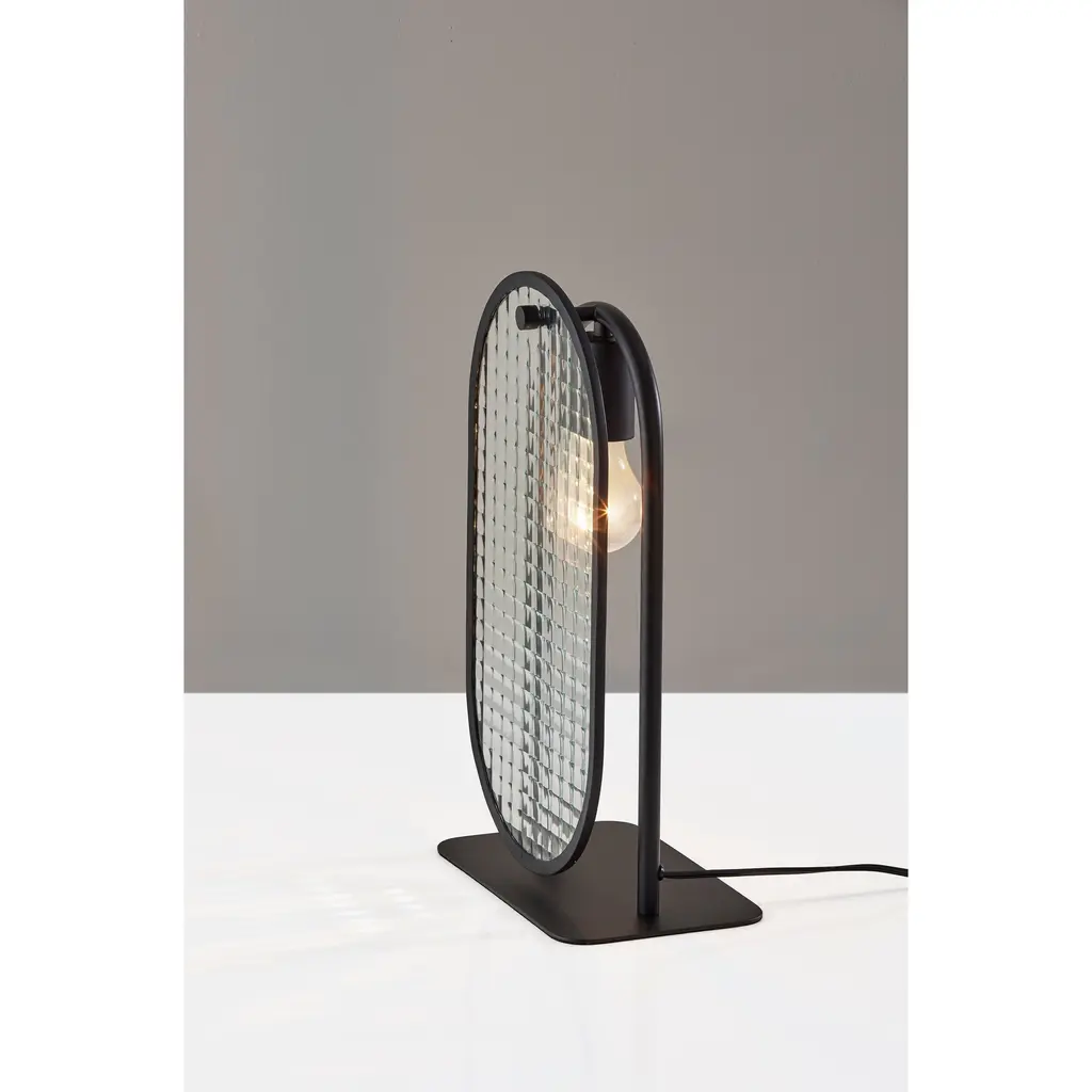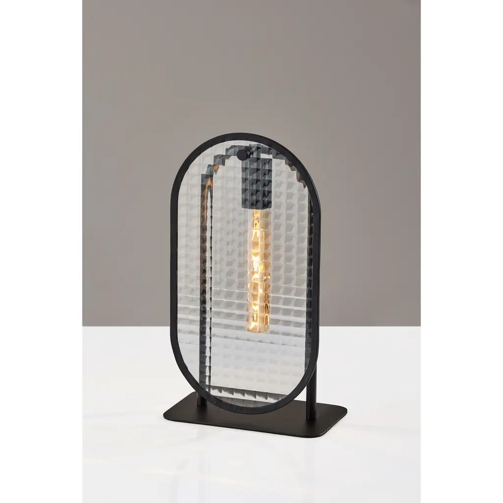 Bring an elegant and distinctive style to your space with the Landon table lantern. Its clean lines, simple color scheme, and patterned glass make for a distinctive and modern addition to accent tables and desks. Surrounding the 75W bulb (not included) is a flat glass shade, making a vintage Edison bulb a stylish choice. With a hologram pattern to the glass, the 15.75" tall and 8.75" wide oval shade softly diffuses the light and creates a unique look. Supporting the socket and shade is an arcing metal stand in black finish that mirrors the shape and look of the shade frame and is visible through the patterned glass. The stand rests upon a low-profile, rectangular base measuring 9.5" x 6". Operated by a rotary switch discretely located on the socket to easily turn it on or off, the lantern also features a 63" black cord. Complete your decor with the coordinating Landon floor lamp and pendant lighting.Features: Black metal finish with a patterned glass shadeRequires 1 x 75.00 watts E26 Bulb (Not Included) Compatible with 11W LED BulbRotary Switch on Socket63-inch CordSome Assembly Required1-Year Limited Manufacturer WarrantyMeasurements: Height is 16.38 inchesWidth is 9.50-inchesExtension/Depth is 6-inchesShade Dimensions are 8.75" x 15.75" OvalBase measures 9.5" x 6" RectTube diameter is .5Weight: 4.20 lbs