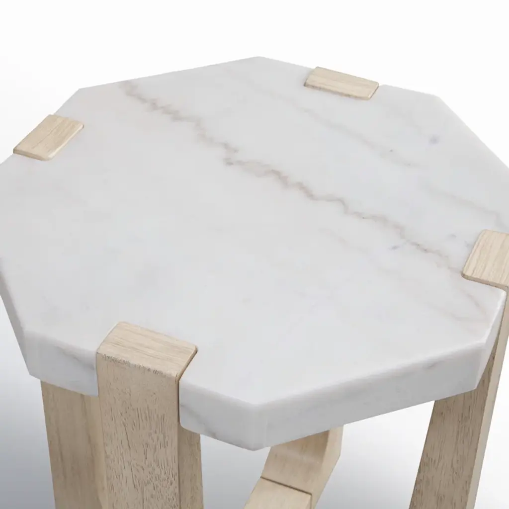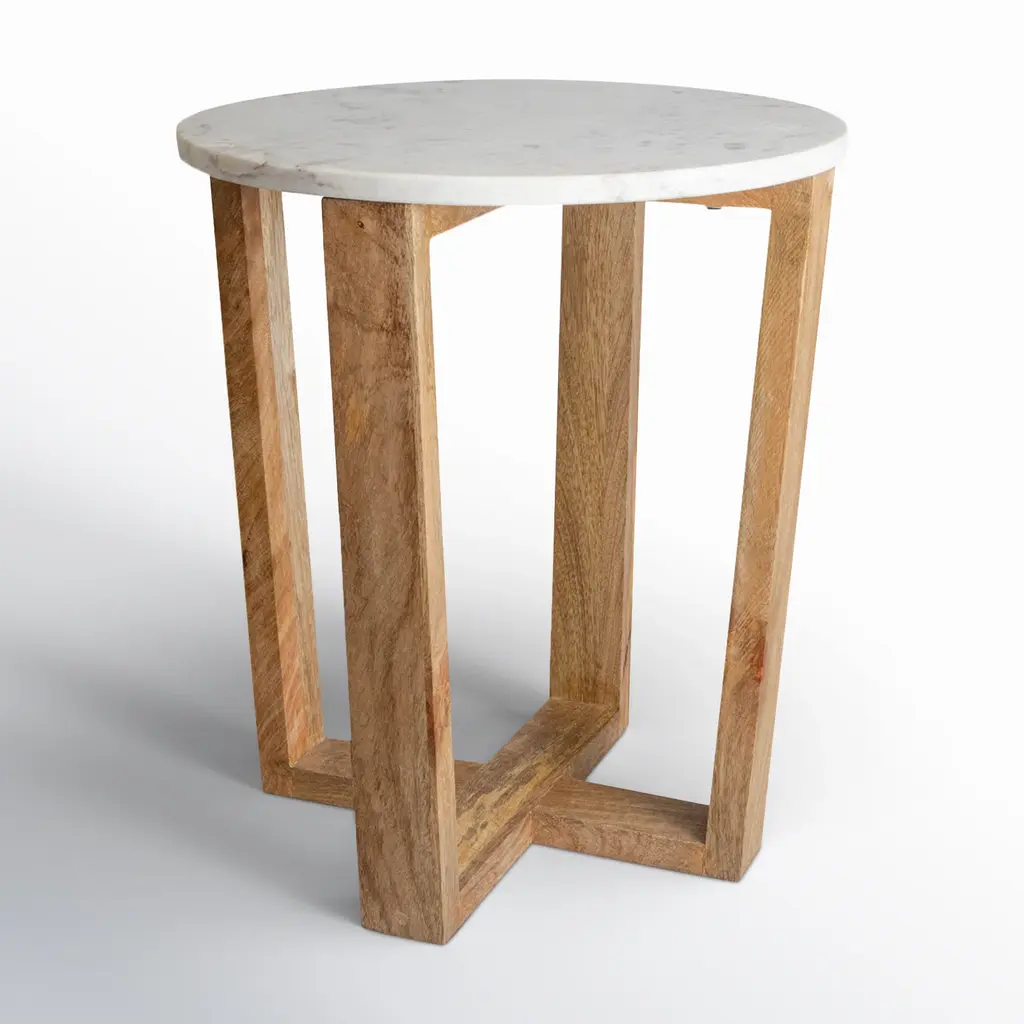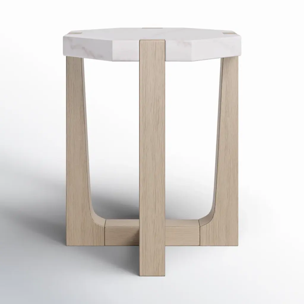 This end table shows off a sleek, modern mixed-material design. The top is made of genuine white marble with gray veining, perfect for an accent lamp. Solid ash wood creates a stable base with a sturdy X-shaped construction. Consider a pair to frame your sofa or headboard, and check out the matching collection for a cohesive look.