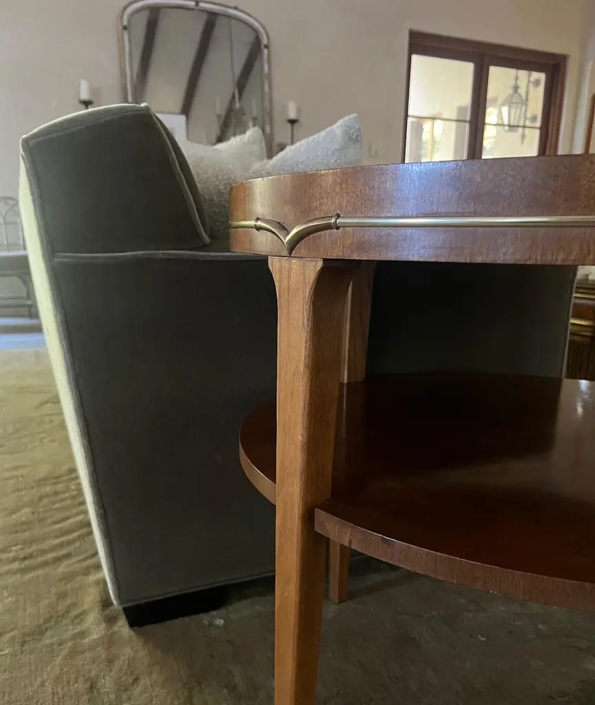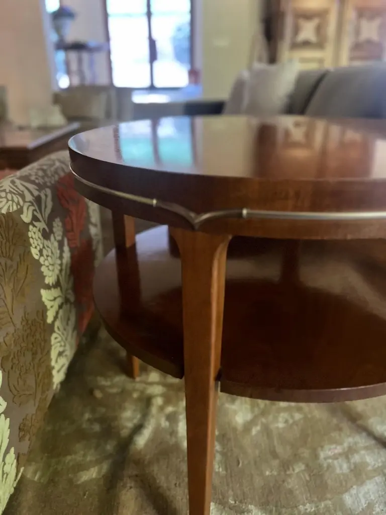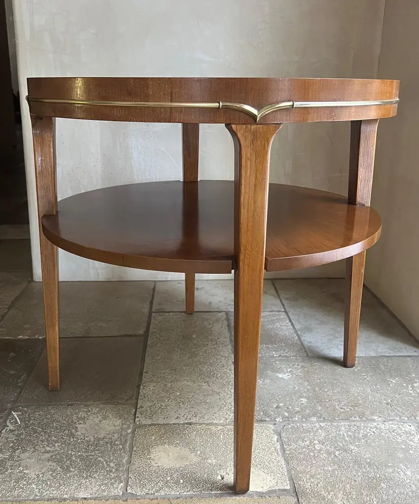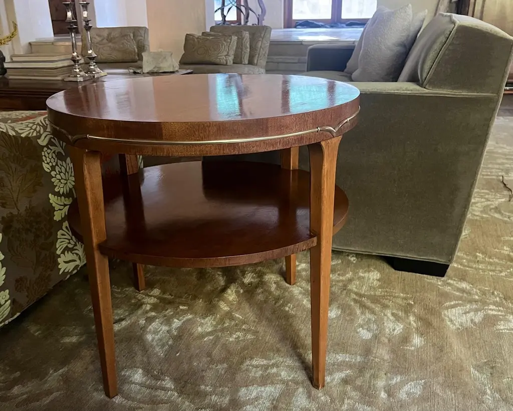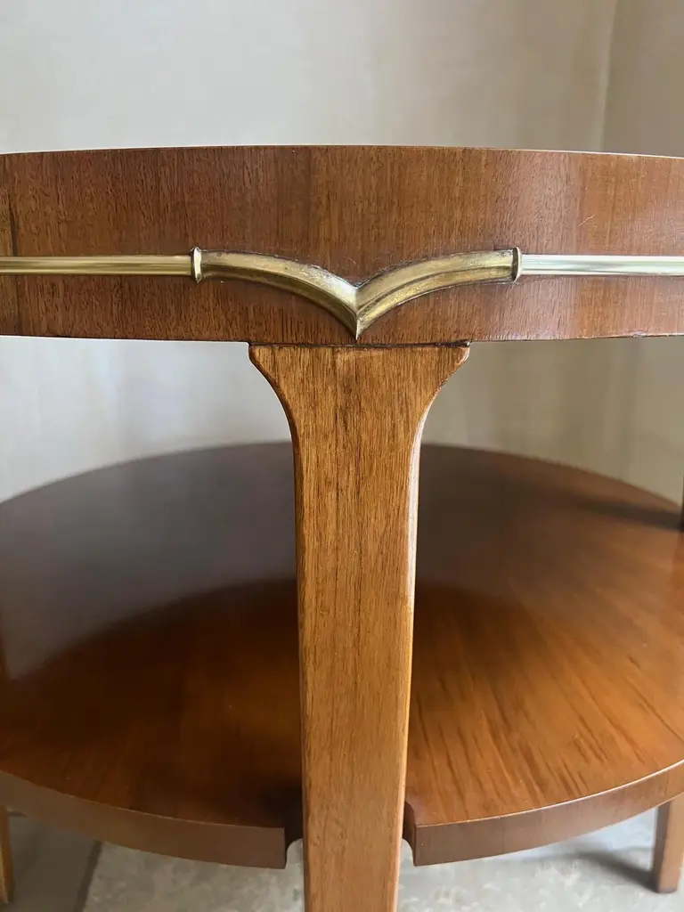 Lane Alta Vista two tiered round side table. The table has a band of gold metal connected by four brass accents. The table was hand crafted in Virginia in 1956.