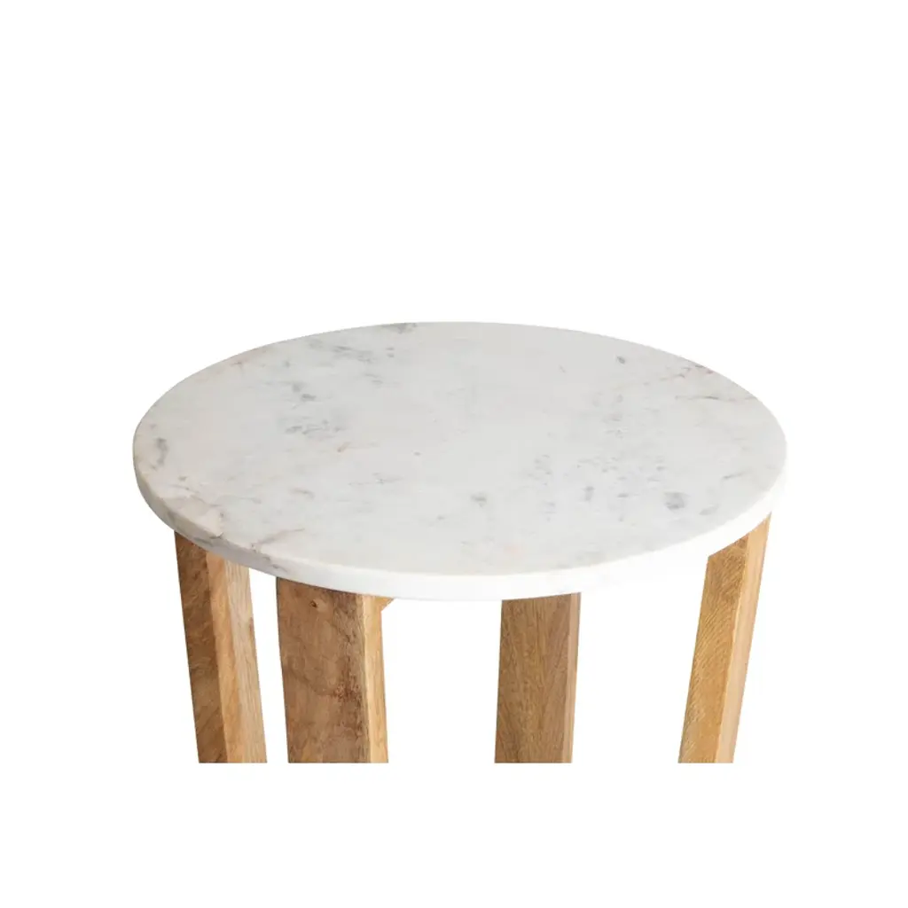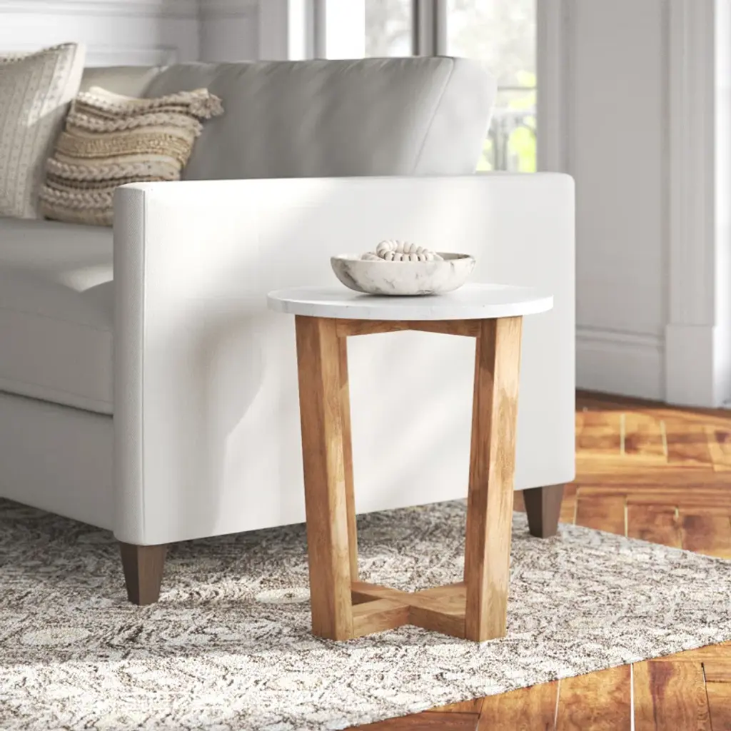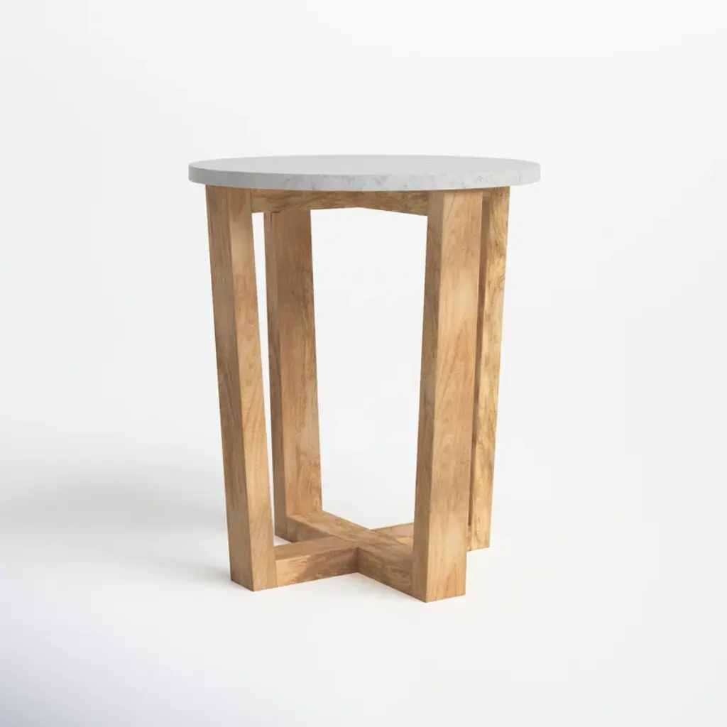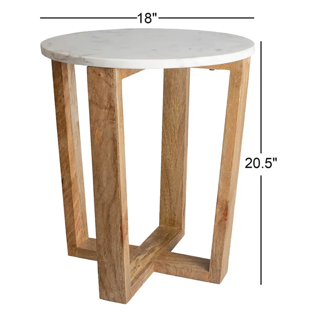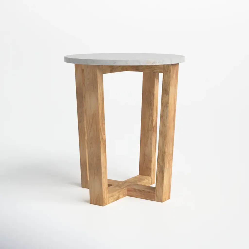 Mix it up. Crafted from solid mango wood with a crisp marble top, our end table pairs perfectly with sofas and accent chairs. A tapered base with a criss-cross design adds visual intrigue, while the natural wood grain gives this piece an organic feel. Plus, it arrives fully assembled.
