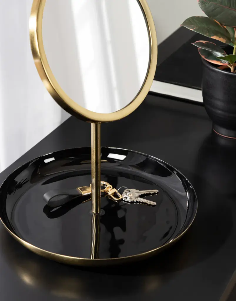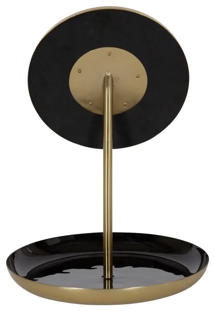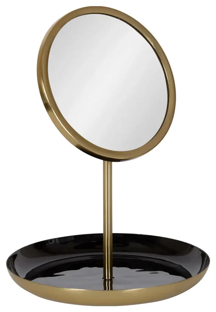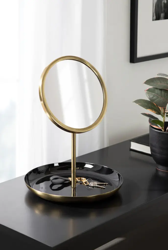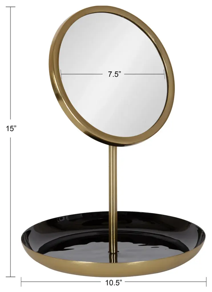 Bring a luxurious element of dazzling function to your home with the Laranya tabletop mirror. Inspired by modern design, the Laranya features a round mirror with a freestanding display attached to a tray-like base. To give it a touch of added glamour, the Laranya includes black and gold tones. To enhance its glossy look, the internal surface of the tray consists of an enamel coat, creating a glamorous feature that captures attention. The Laranya mirror and tray are made from robust iron material, creating a resilient display piece that lasts for years of decadent display. Handcrafted in India, each element in the Laranya collection is distinct, with a varied finish and look from piece to piece. It''s fabulous for any surface in your home, measuring 10.5 inches wide by 10.5 inches deep by 15 inches tall. Use it as a centerpiece for a dining or console table, an accent piece on an end table, or an additional makeup mirror on your vanity. Each Laranya includes a fabric pad on the bottom of the tray to prevent damage to the hard surfaces throughout your home. The 10.5-inch tray base adds an extra functional element, creating a catch-all storage surface for jewelry, makeup, keys, wallets, change, and more. To assemble this mirror without any tools, simply screw it into the tray!