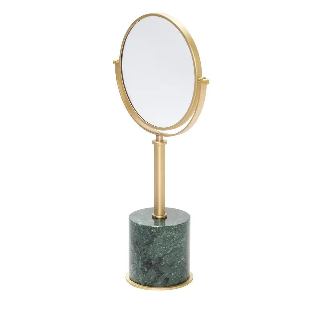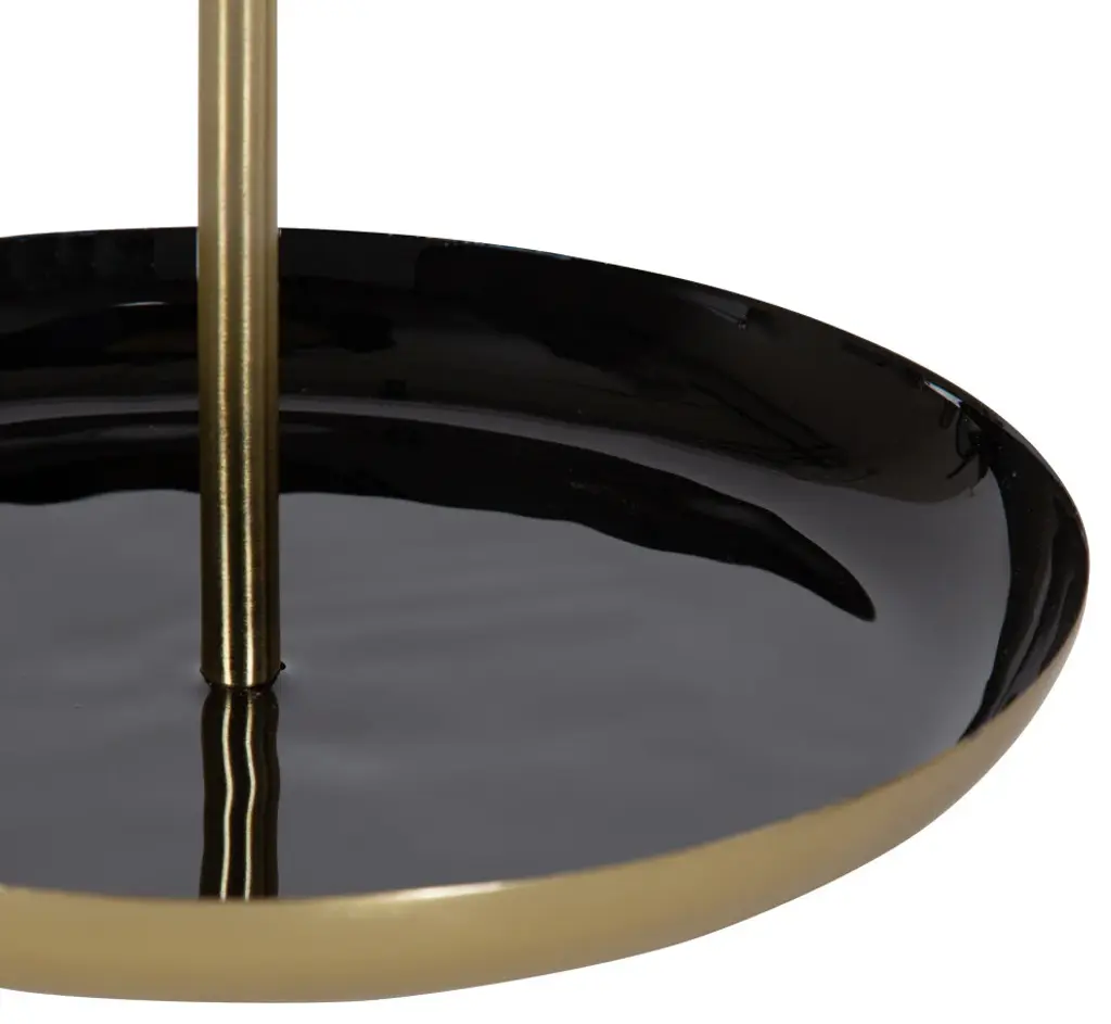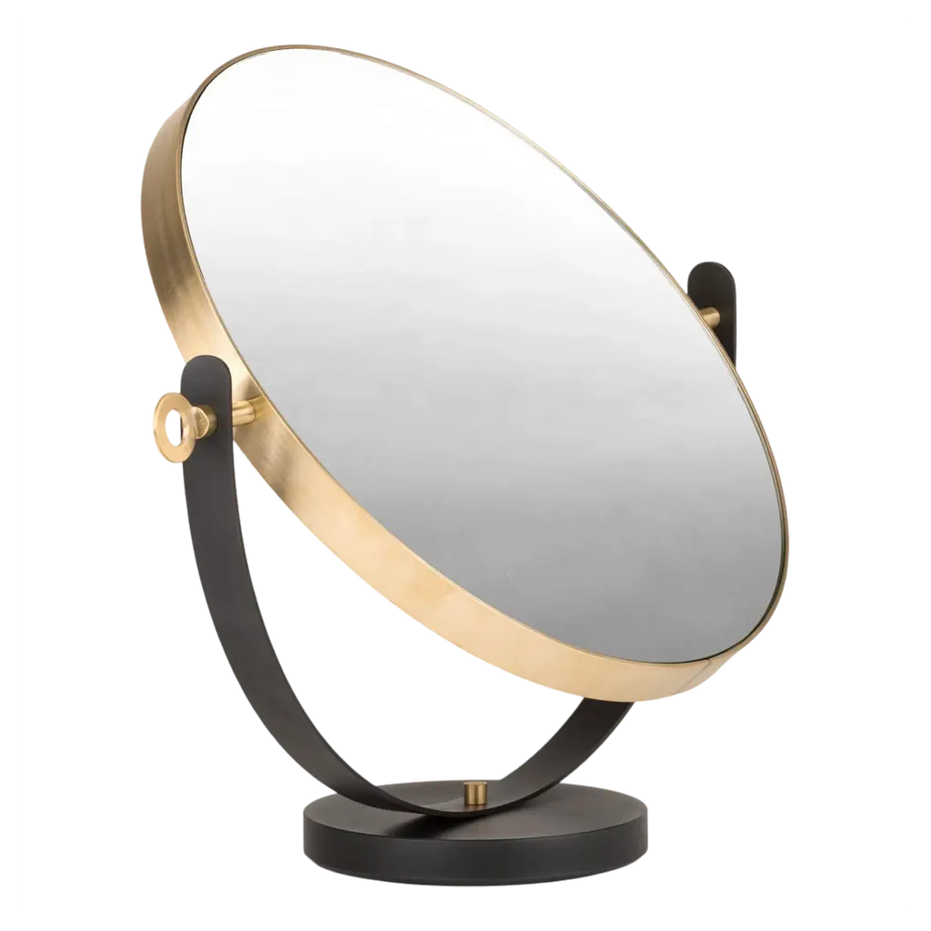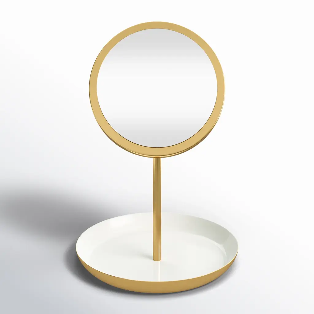 Bring a luxurious element of dazzling function to your home with the Laranya tabletop mirror. Inspired by modern design, the Laranya features a round mirror with a freestanding display attached to a tray-like base. To give it a touch of added glamour, the Laranya includes black and gold tones. To enhance its glossy look, the internal surface of the tray consists of an enamel coat, creating a glamorous feature that captures attention. The Laranya mirror and tray are made from robust iron material, creating a resilient display piece that lasts for years of decadent display. Handcrafted in India, each element in the Laranya collection is distinct, with a varied finish and look from piece to piece. It''s fabulous for any surface in your home, measuring 10.5 inches wide by 10.5 inches deep by 15 inches tall. Use it as a centerpiece for a dining or console table, an accent piece on an end table, or an additional makeup mirror on your vanity. Each Laranya includes a fabric pad on the bottom of the tray to prevent damage to the hard surfaces throughout your home. The 10.5-inch tray base adds an extra functional element, creating a catch-all storage surface for jewelry, makeup, keys, wallets, change, and more. To assemble this mirror without any tools, simply screw it into the tray!
