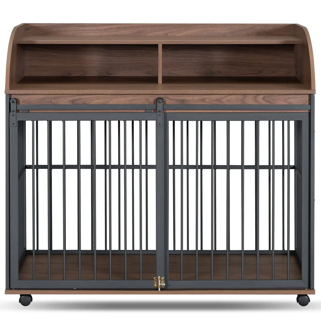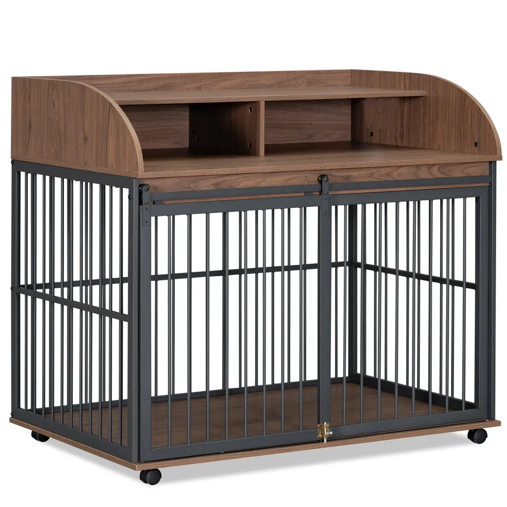 Large 44" Dog Crate Furniture With Sliding Barn Door, Lockable Wheels & Dual Storage, Dog Kennel For Medium Dogs - Brown - Large