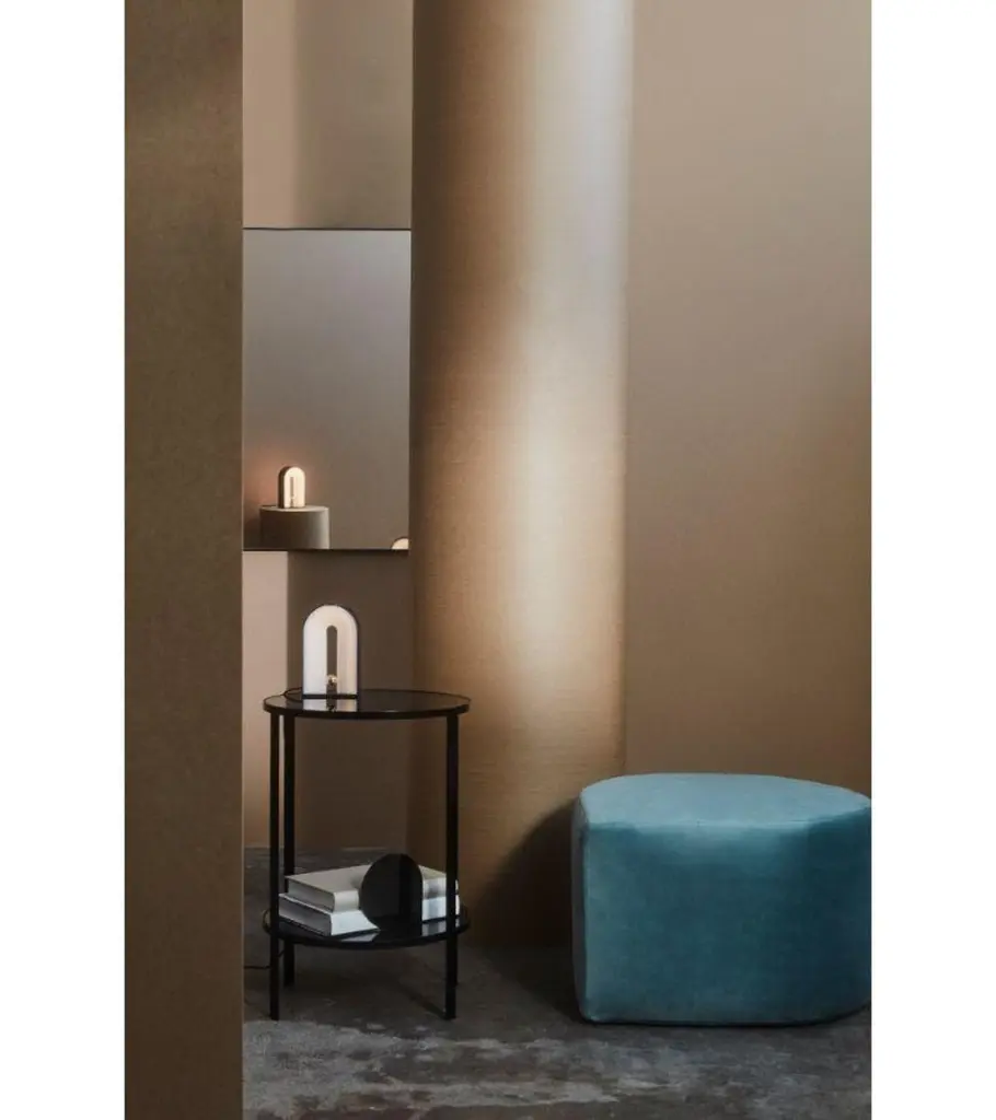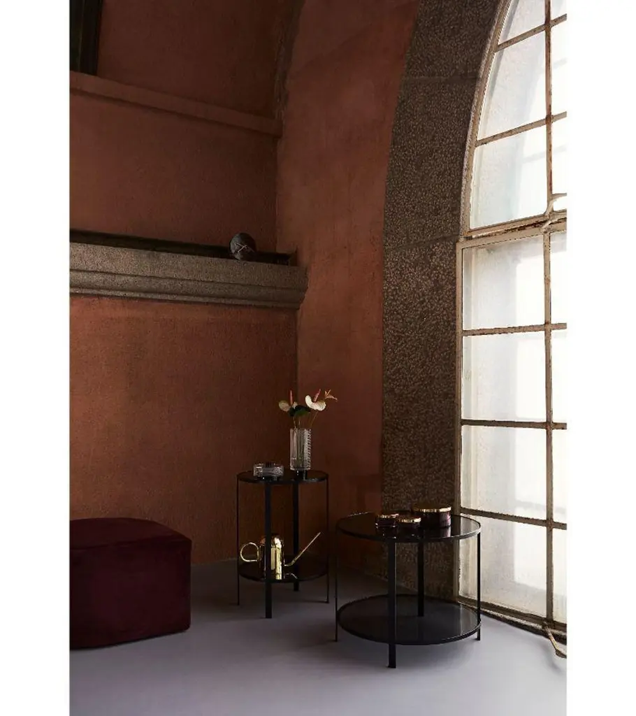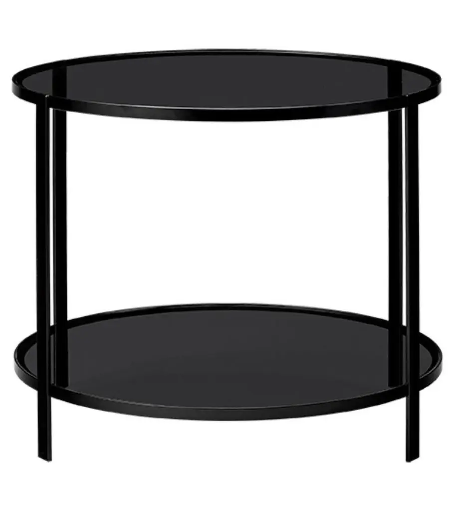 Large black glass contemporary side tableDimensions: Diameter 58 x height 40 cm Materials: Powder-coated iron, tempered glass.Fumi is an elegant range of coffee tables that looks very light with its black iron frames and tabletops made of glass. Fumi comes in different shapes and can be used single or together.