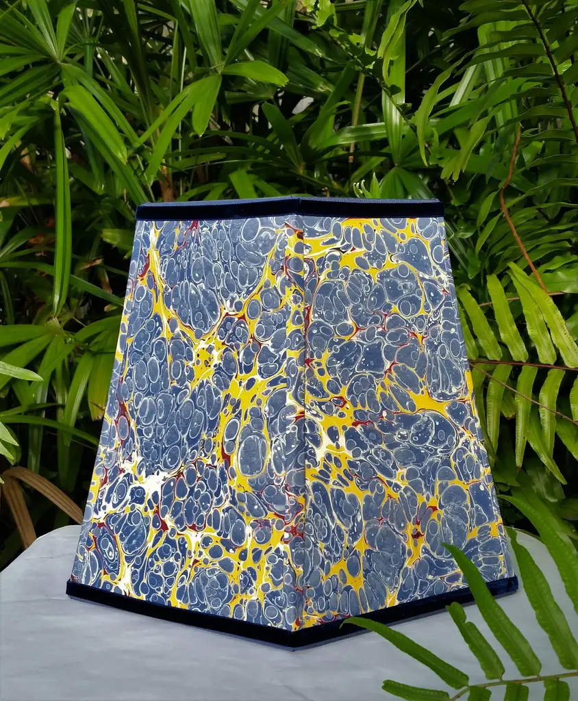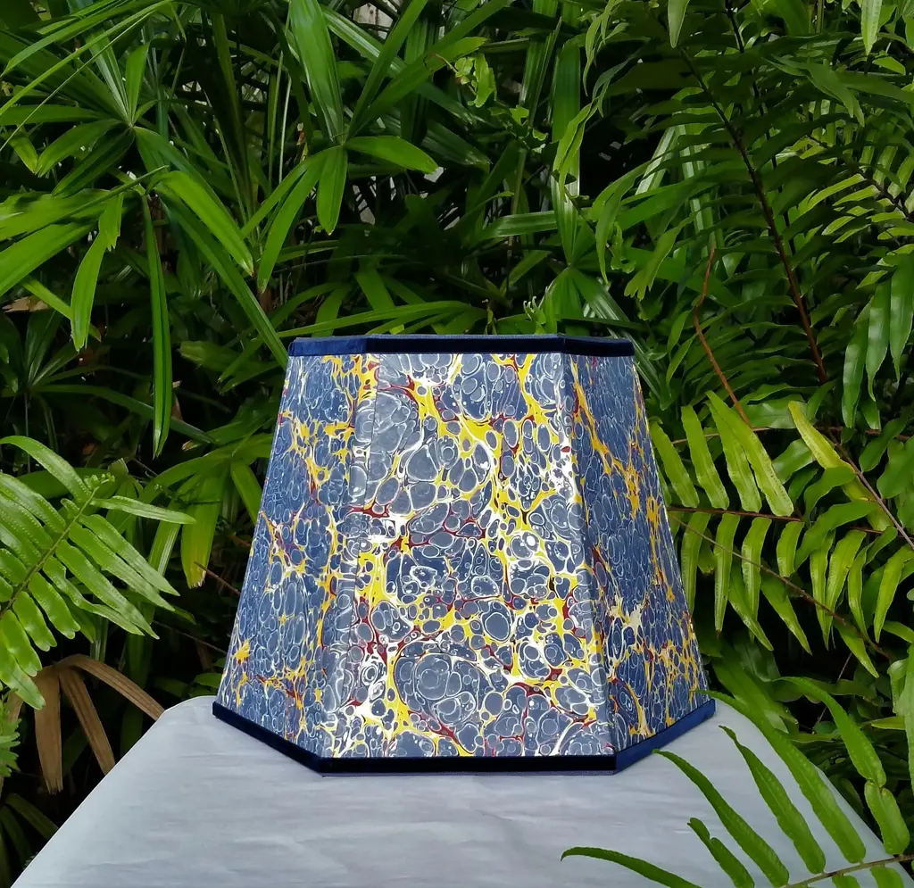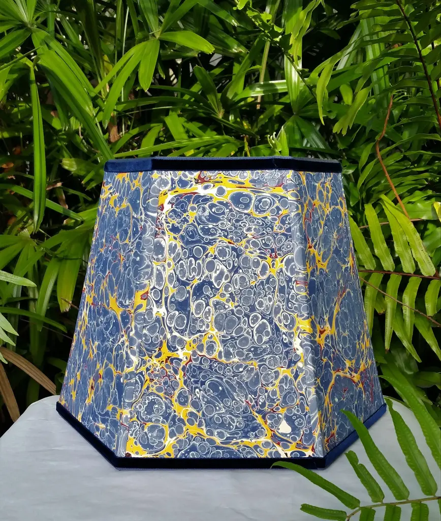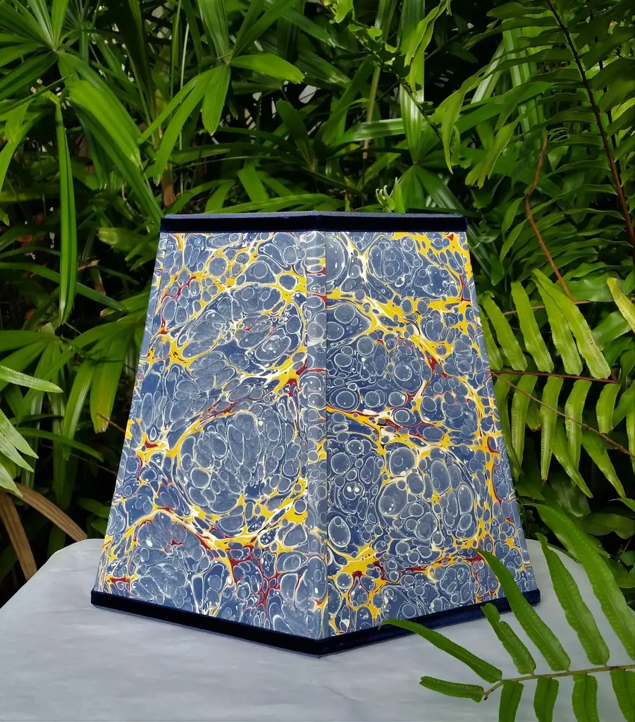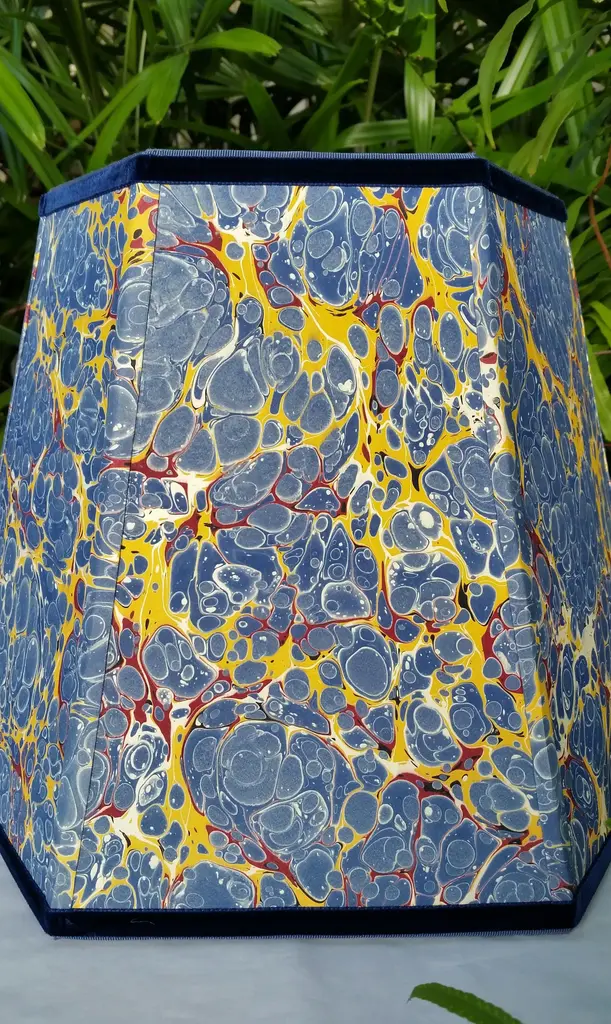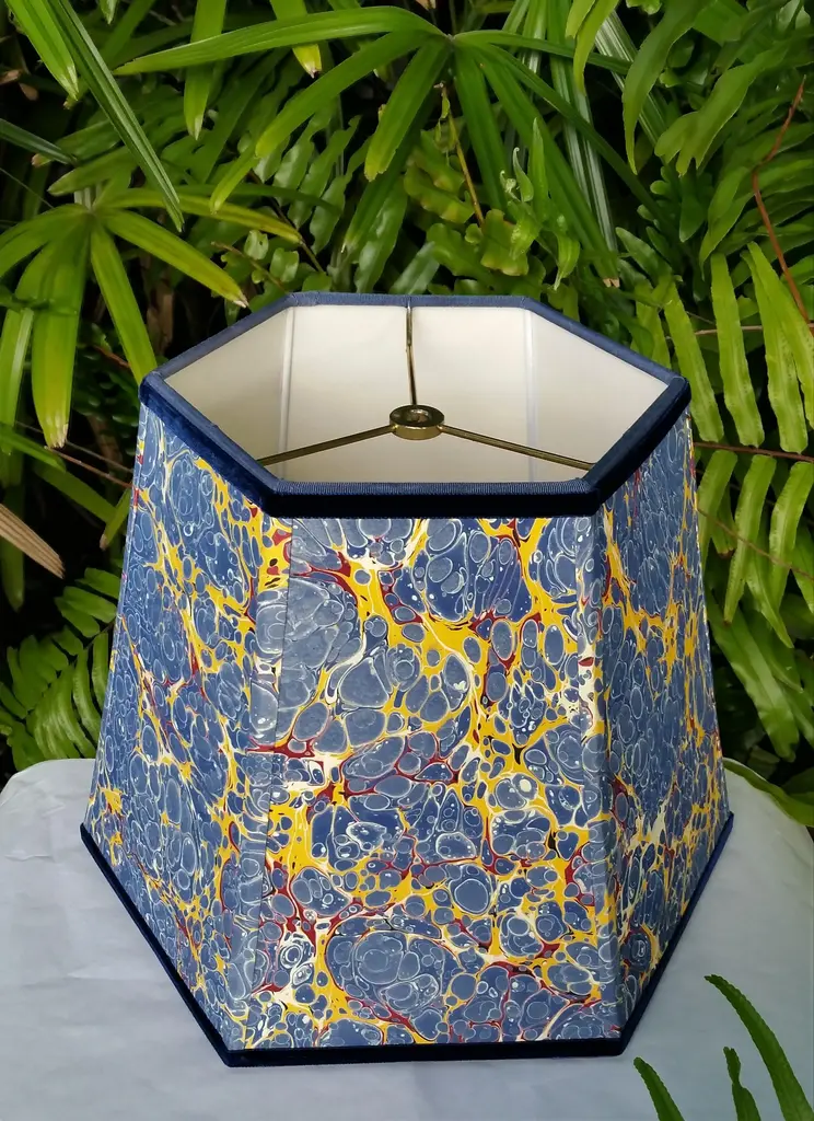 Paper and Trim Polystyrene lined Payhembury marbled paper. Royal blue, golden yellow, and red. Top and bottom wiring is wrapped with a coordinating blue cotton viscose grosgrain ribbon. Vertical ribs are trimmed with the marbled paper and the shade is finished with Navy blue velvet ribbon. Fitting and Finish Spider top, one half inch recess. Brass finish. Shape Hexagon frame lampshade. Comments This shade is best suited for a medium to large table lamp with a harp and finial. It would look great in a fun kitchen or bedroom. The colors on this paper are very vivid and fun. All hidden wiring is coated with enamel paint to ensure longevity. This hand-crafted product is made to order and will be shipped as soon as is possible while ensuring the highest quality workmanship. Marbled patterns will vary as this paper is handmade. Processing time can be up to three weeks. Dimensions Top Diameter: 9 inches point to point. Bottom Diameter: 14 inches point to point. Height measured straight up: 10.5 inches.