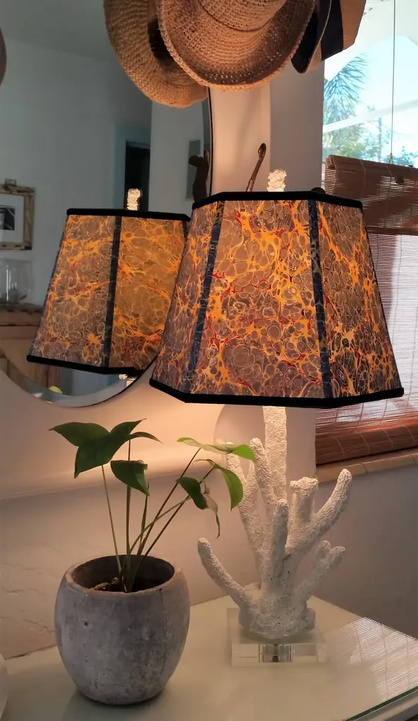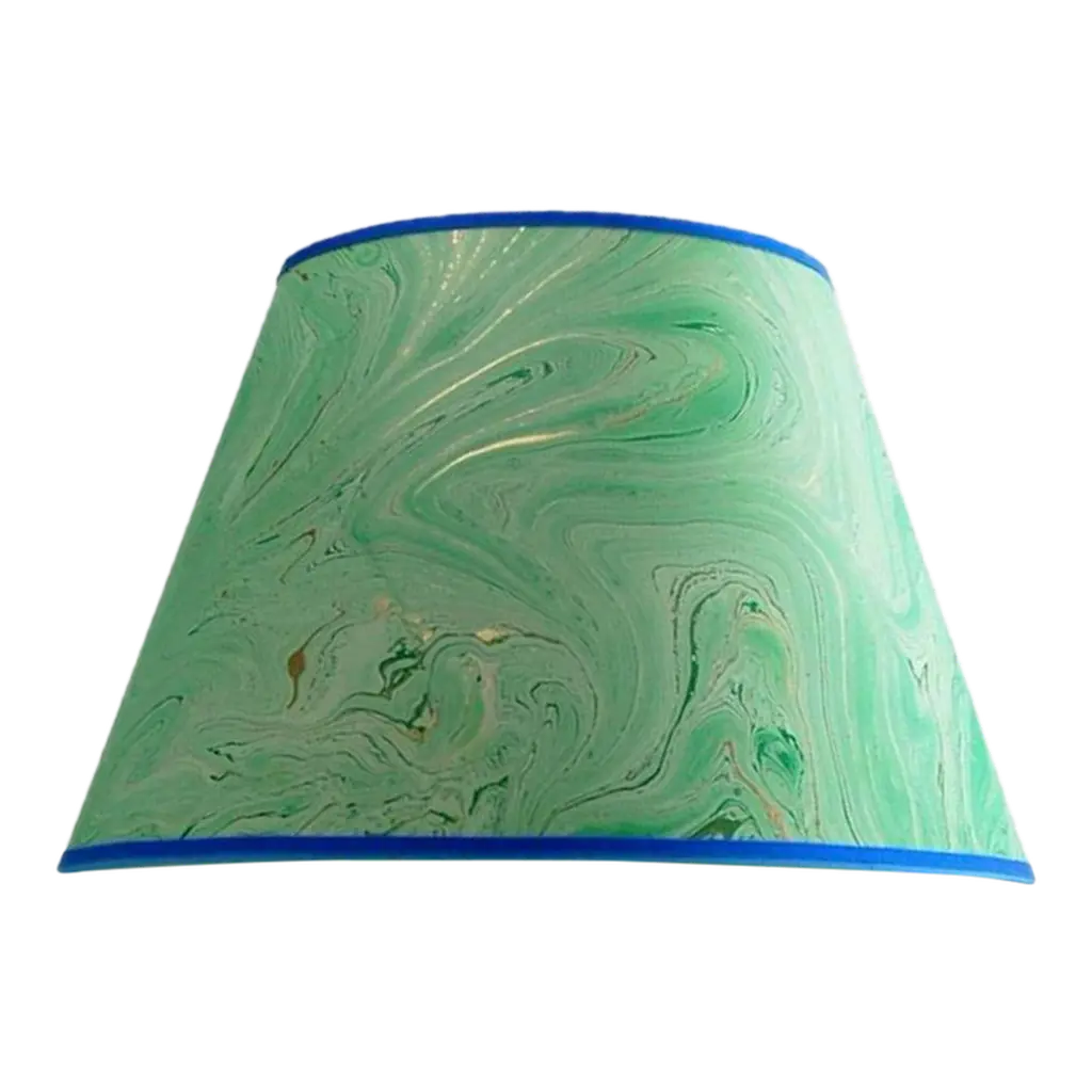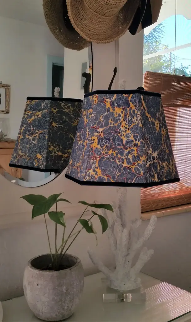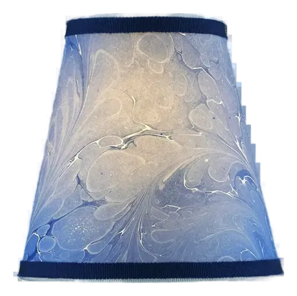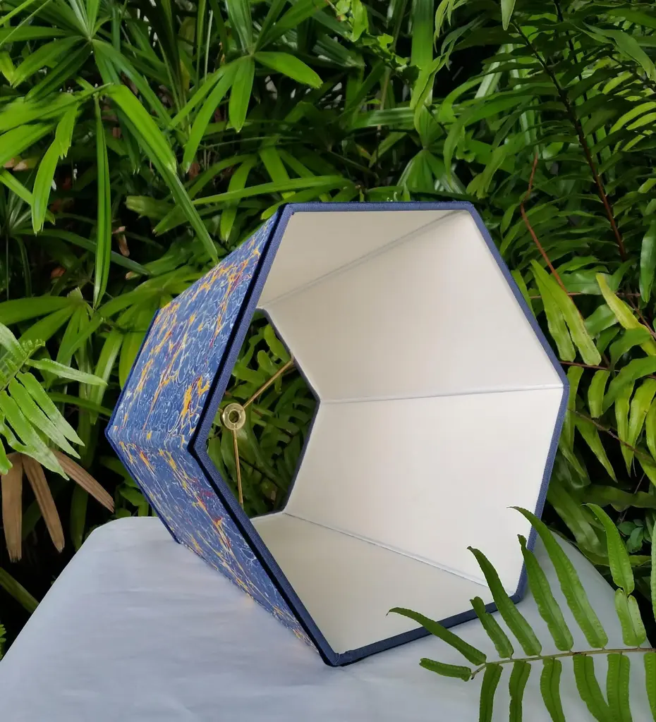 Paper and Trim Polystyrene lined Payhembury marbled paper. Royal blue, golden yellow, and red. Top and bottom wiring is wrapped with a coordinating blue cotton viscose grosgrain ribbon. Vertical ribs are trimmed with the marbled paper and the shade is finished with Navy blue velvet ribbon. Fitting and Finish Spider top, one half inch recess. Brass finish. Shape Hexagon frame lampshade. Comments This shade is best suited for a medium to large table lamp with a harp and finial. It would look great in a fun kitchen or bedroom. The colors on this paper are very vivid and fun. All hidden wiring is coated with enamel paint to ensure longevity. This hand-crafted product is made to order and will be shipped as soon as is possible while ensuring the highest quality workmanship. Marbled patterns will vary as this paper is handmade. Processing time can be up to three weeks. Dimensions Top Diameter: 9 inches point to point. Bottom Diameter: 14 inches point to point. Height measured straight up: 10.5 inches.