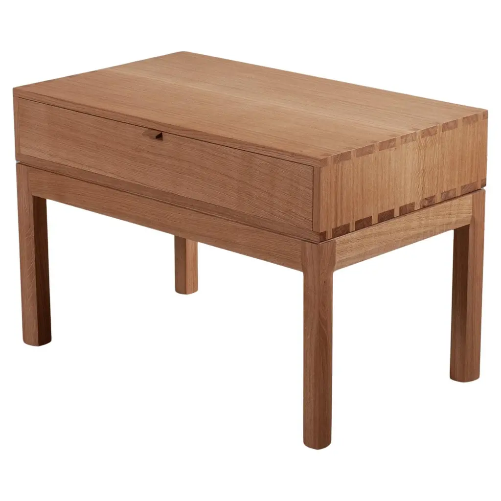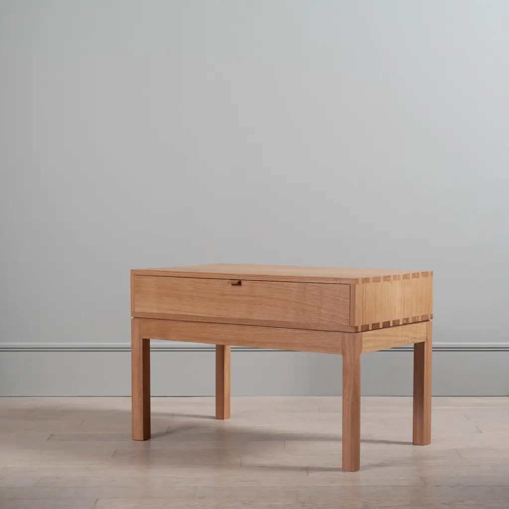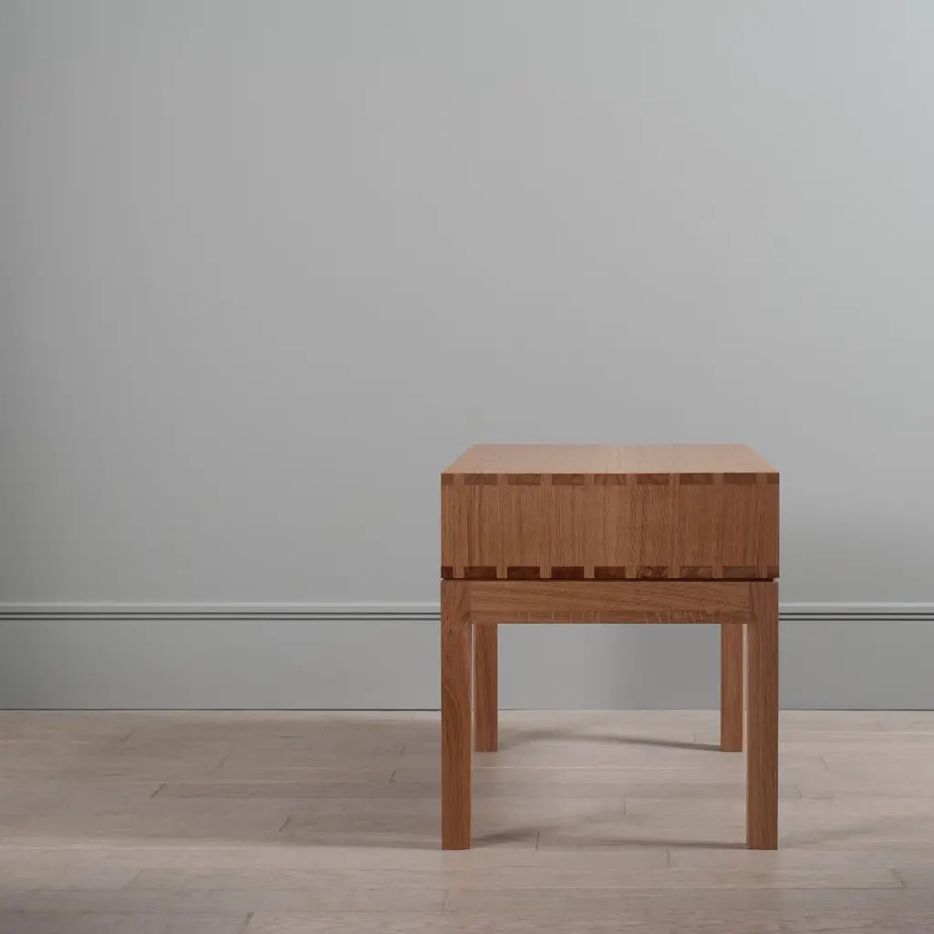 A variation, in much larger proportions, of our handcrafted modernist nightstands or end table drawers. The main upper box is detailed with exposed hand-cut dovetail jointing and contains one spacious traditional dovetail jointed drawer. A light curve design is cut into and around the legs and follows along the facia. Designed and handmade by our highly experienced craftspeople in England. Hand finished in highly durable oils. These are constructed from the finest English quartersawn oak.This is a contemporary modernist design with Scandinavian influences utilising authentic and traditional English furniture craftsmanship and fine timbers.These can be made to your custom dimensions/bespoke design if required. Also available in American black walnut.Contact us for international shipping quotations.We design bold and distinctive pieces of furniture – our main objective is to combine the design alongside the natural beauty and properties of the raw materials.These timbers and materials are very carefully chosen for each specific design - maintaining our focus on the benefits, visual impact and strengths of what we use. Our regular use of English Quartersawn Oak is one case in point. It has been the beloved timber of fine furniture makers across the world for centuries. It is costly to produce but gives huge benefits and rewards such as its striking medullary rays and superb stability qualities. By utilising these wonderful and naturally occurring features with our contemporary designs we aim to continue creating some very distinct, tactile and idiosyncratic pieces.These are all completely handmade, in very small numbers, by our skilled craftspeople in England.