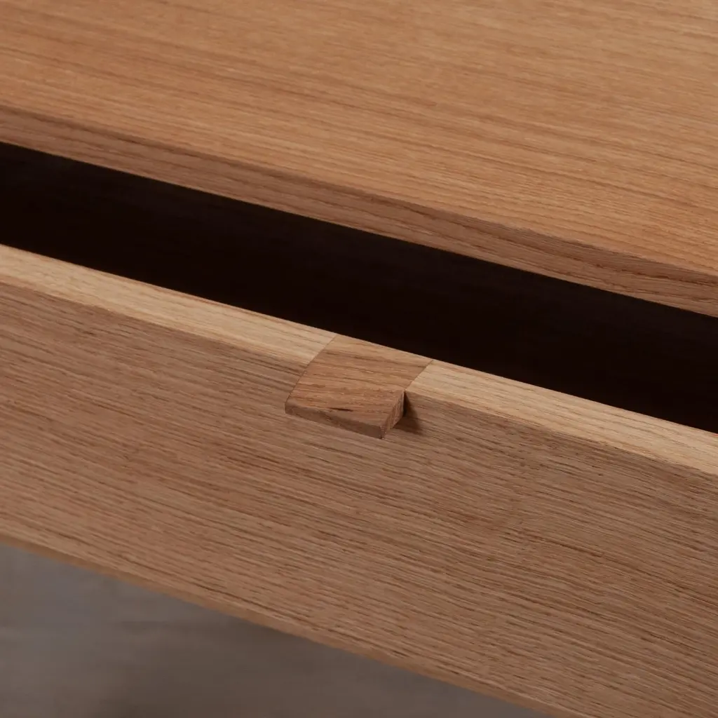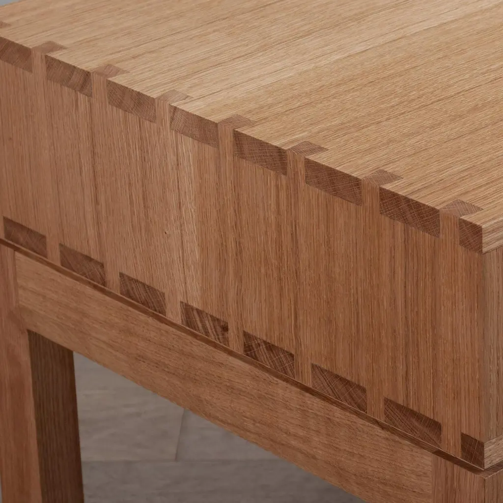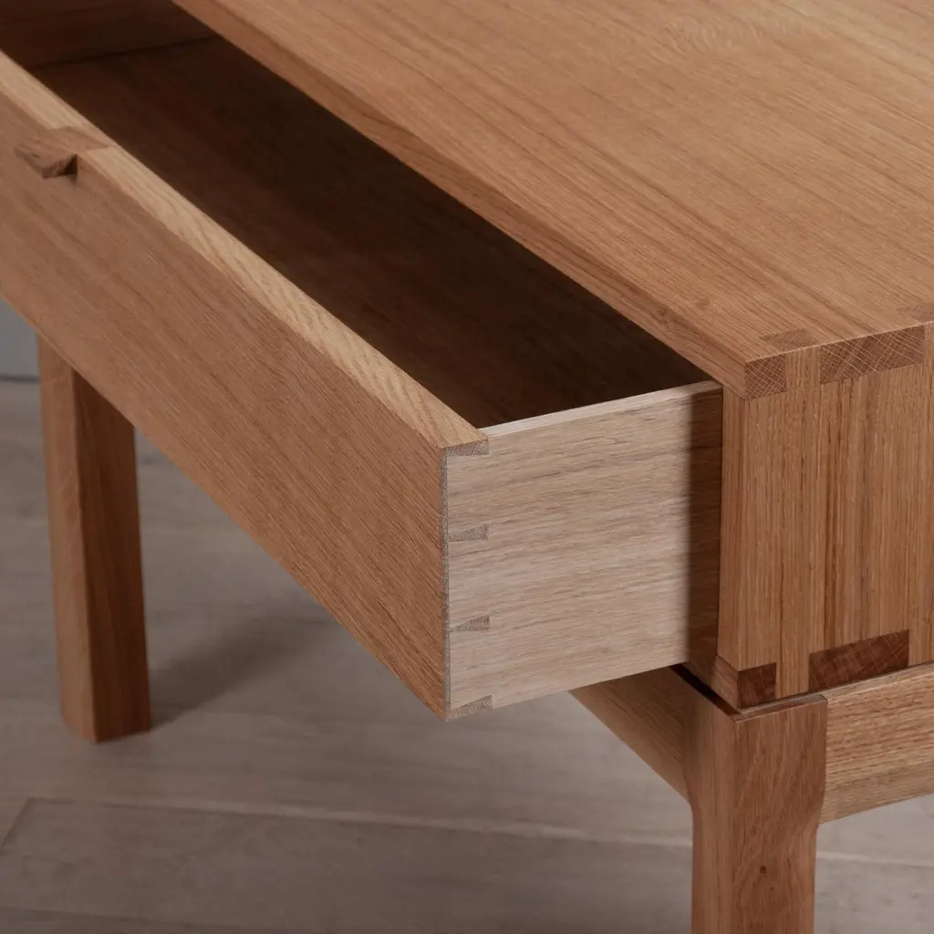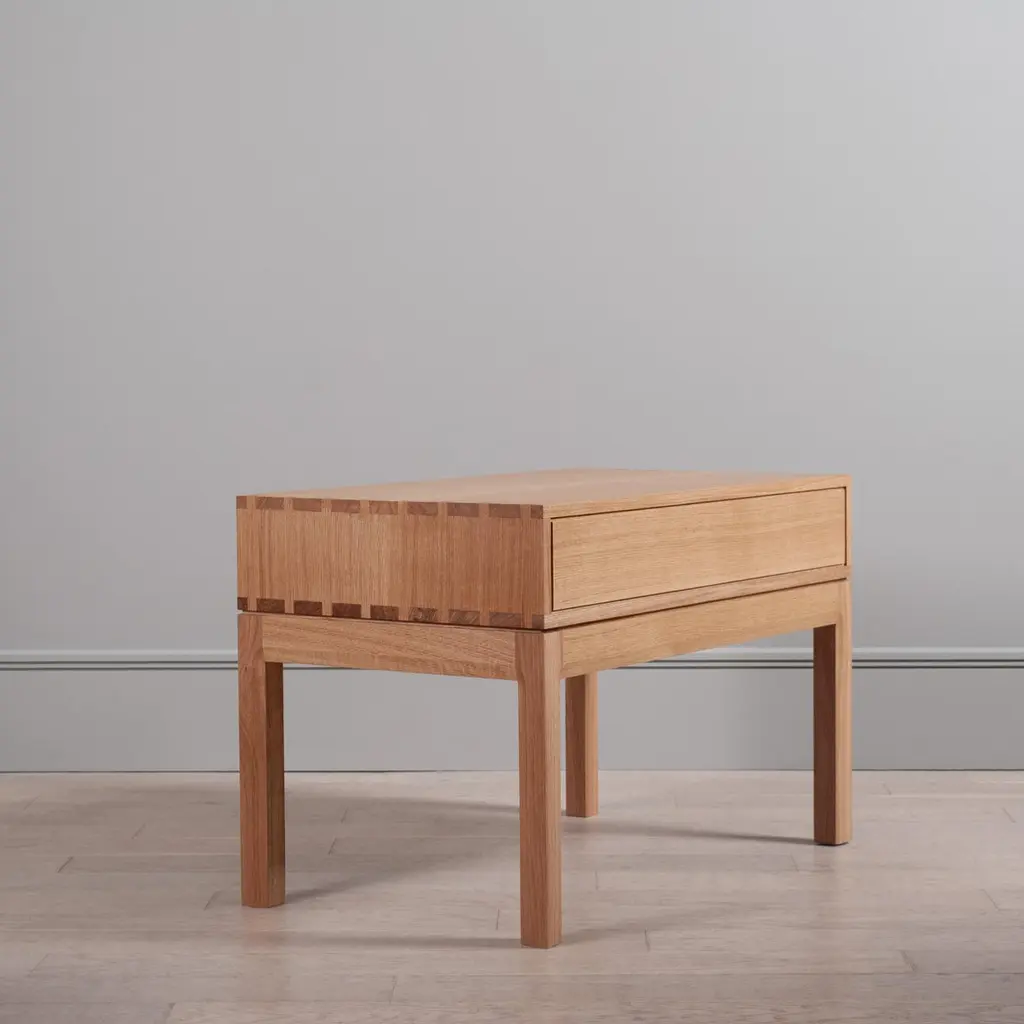 A variation, in much larger proportions, of our handcrafted modernist nightstands or end table drawers. The main upper box is detailed with exposed hand-cut dovetail jointing and contains one spacious traditional dovetail jointed drawer. A light curve design is cut into and around the legs and follows along the facia. Designed and handmade by our highly experienced craftspeople in England. Hand finished in highly durable oils. These are constructed from the finest English quartersawn oak.This is a contemporary modernist design with Scandinavian influences utilising authentic and traditional English furniture craftsmanship and fine timbers.These can be made to your custom dimensions/bespoke design if required. Also available in American black walnut.Contact us for international shipping quotations.We design bold and distinctive pieces of furniture – our main objective is to combine the design alongside the natural beauty and properties of the raw materials.These timbers and materials are very carefully chosen for each specific design - maintaining our focus on the benefits, visual impact and strengths of what we use. Our regular use of English Quartersawn Oak is one case in point. It has been the beloved timber of fine furniture makers across the world for centuries. It is costly to produce but gives huge benefits and rewards such as its striking medullary rays and superb stability qualities. By utilising these wonderful and naturally occurring features with our contemporary designs we aim to continue creating some very distinct, tactile and idiosyncratic pieces.These are all completely handmade, in very small numbers, by our skilled craftspeople in England.