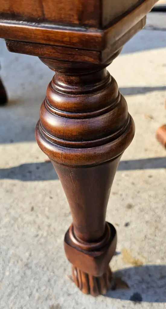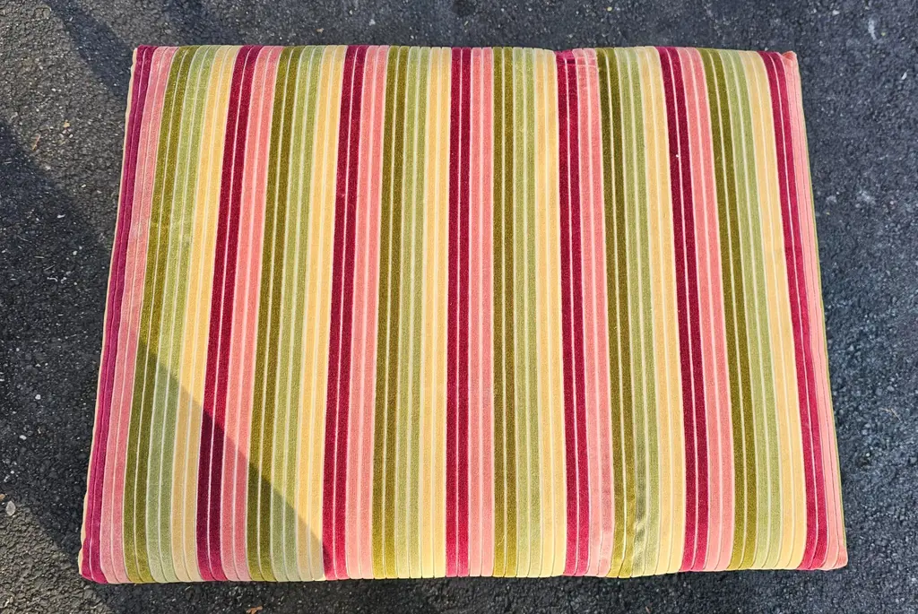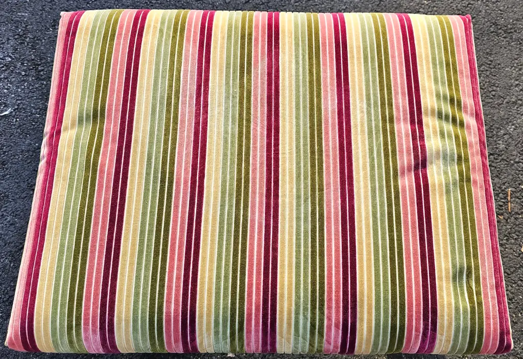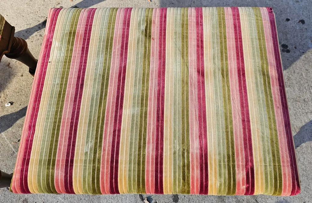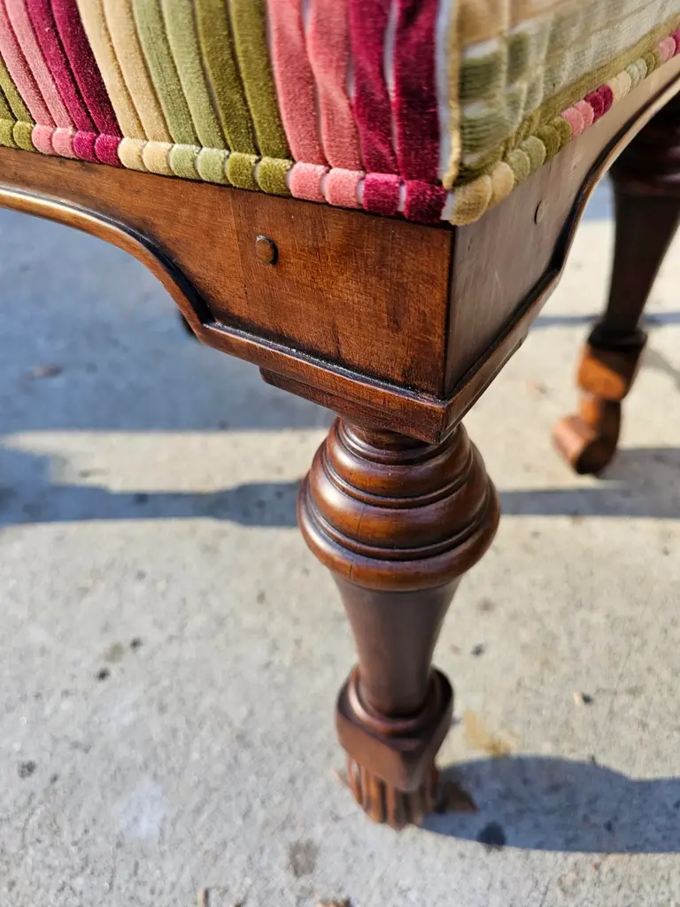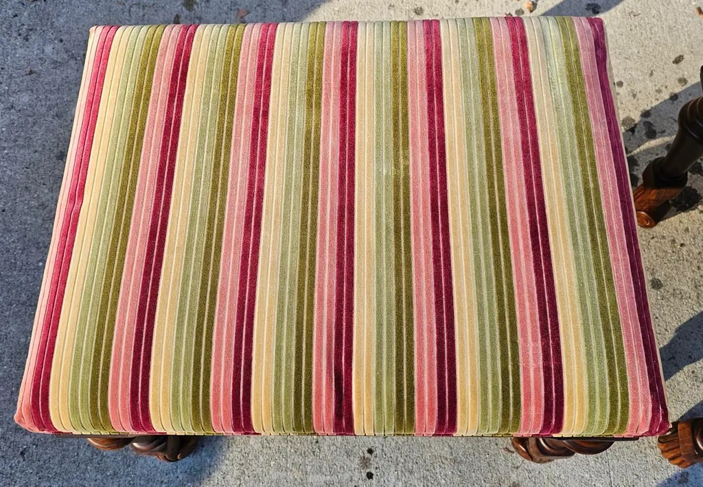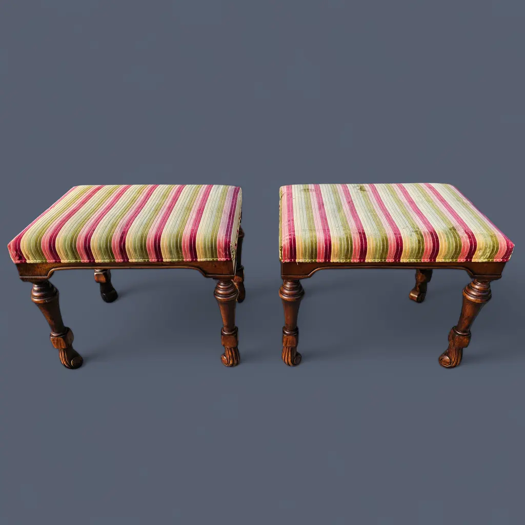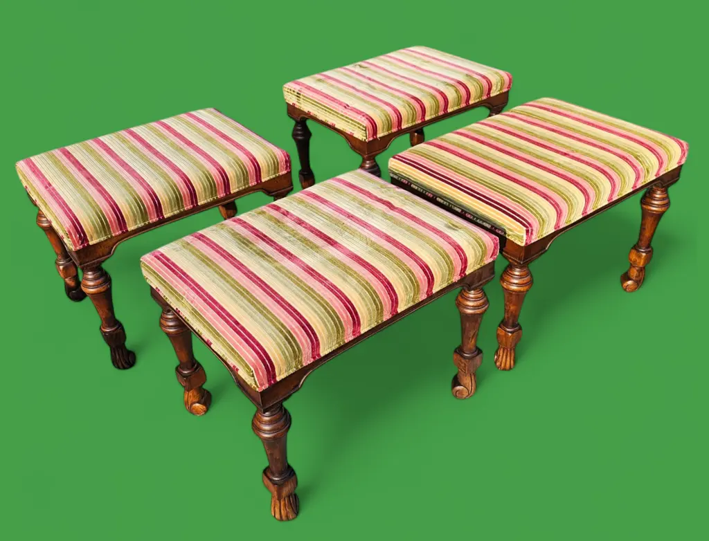 These Large, High-Quality, Bespoke Georgian-style Footstools are opulent, combining classic design with a modern aesthetic, and feature hand-carved hardwood frames. The richly-grained wood has a polished patina and incorporates Georgian design elements such as fluted and reeded legs and scrolling feet. The upholstered tops are beautifully upholstered with cushions made of richly colored striped velvet fabric in deep burgundy, olive green, and golden ochre. They are versatile and can be used as extra seating, refined side tables, or simply as accents to add depth to your living space. Each stool has its own distinct charm, making it ideal for creating a cozy yet sophisticated atmosphere in a grand living room, study, or beside a stately fireplace, and will complement a wide range of interior design decor. Two pairs of these stools are available for purchase. List price reflects the cost for each pair. IDN1073