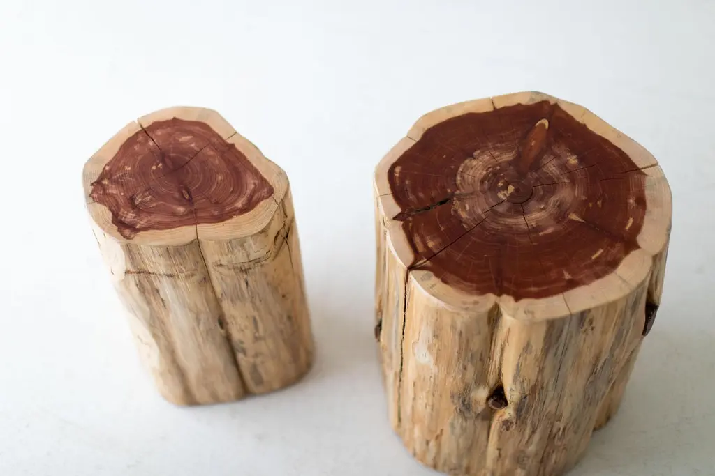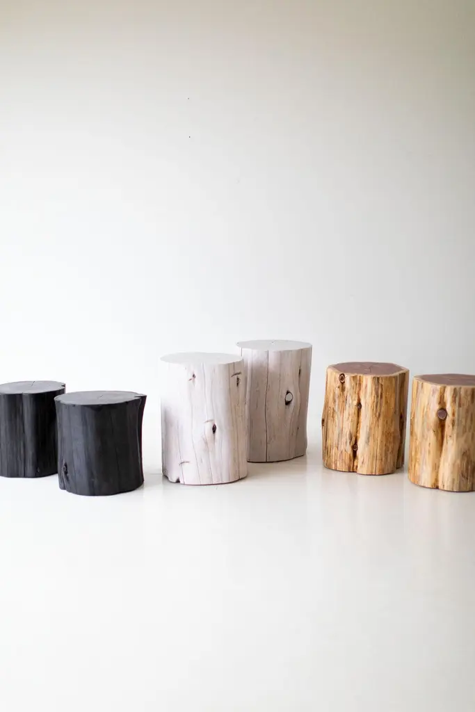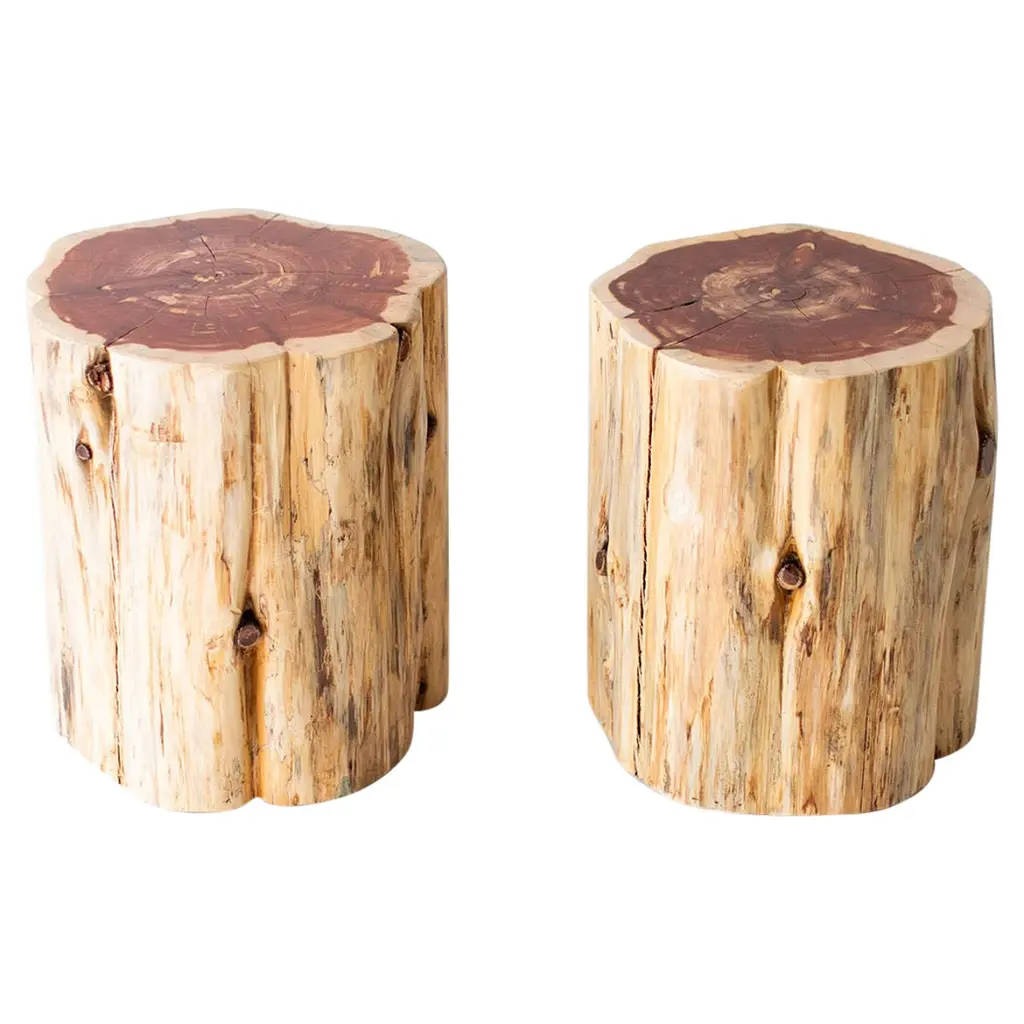 Please scroll down to read IMPORTANT INSTRUCTIONS ABOUT OUR STUMPS before purchase!Why buy our stumps?KILN DRIEDOur stumps all go through a drying process in our kiln, sometimes for up to a month. We are meticulous with bringing each and every log to a specific moisture level. This process helps with major cracking, long-term moisture issues, and bugs.ECO FRIENDLYIn an effort to replenish the trees we use, we plant 50+ trees a year. In addition, we practice salvage logging. Where do we source these? Some of the trees fall naturally. Some have damage from severe wind, lightning, flood, disease, or other natural disturbance so they need to be cut and removed before they fall. Others are fresh cut because people want them off their land. Salvage logging may reduce erosion, reduce intensity of future wildfires, and slow buildup of pest insects.FAMILY OWNEDThese are made from our family to yours. Quality is of utmost importance, and we hand cut, de-bark, sand, and finish every piece with care. COMMERCIAL GRADEThese stumps are meant to be loved and USED. Each is finished with a durable commercial-grade finish. This finish is tough enough for spills, kids, and holds up in hotel and hospitality settings.This listing is for a pair of large tree stump side tables in a natural commercial grade finish. These tree stump tables are made in the heart of Ohio with locally sourced wood. They can be used for a side table, a stool, or grouped together for a coffee table. Each table is handmade with a solid trunk of red cedar with a whitewash, espresso/black, or natural commercial grade finish. Note: These are real tree stumps. Natural movement and cracking is normal. These are all slightly different in character, variations of size, etc! Our team absolutely loves these - the perfect accessory to any room.IMPORTANT INFORMATION ABOUT OUR STUMPS...1. Please unpack your stump immediately and leave it out of any packaging. These are real pieces of wood and need to breathe!2. For OUTDOOR stumps : Though these are kiln dried and the wood can be used outdoors, sometimes when they arrive in different climates, humidity levels adjust and can affect the finish on top. We see this more often in direct sunlight. We do our very best and continue to make sure there are no issues, but we can not control climate. Solid wood and the elements are unpredictable and we will not be liable. The great thing about these logs is you can always sand them down and refinish.3. Wood naturally moves. These are solid pieces and for that reason, they are prone to cracking. You may get more cracks or bigger cracks in the first few weeks as the wood acclimates to its new home and climate.4. These stump tables have nylon glides (feet) underneath not only to make them easier to move around (they are heavy!), but also so there is nice air flow to the wood. The air flow is most effective on hard flooring. If you put these on rugs or carpeting, we suggest checking on the underside of your stump periodically to prevent any issues.5. We are not liable for any damages to property or people. If you have any concerns or questions you need to discuss, please write or call. We are always available, honest, and transparent about our products. Thank you and I hope you love these!specsPeriod/Model: New; Modern RusticSpecs: Red Cedar with Natural finishThis listing is for our "large" diameter stumps, the biggest diameter we offer. We have medium and small sizes as well!dimensionsH 18" (can be customized)W 14" - 16" (give or take).Shipping price is per piece. If you are buying multiples, there will be additional charges.