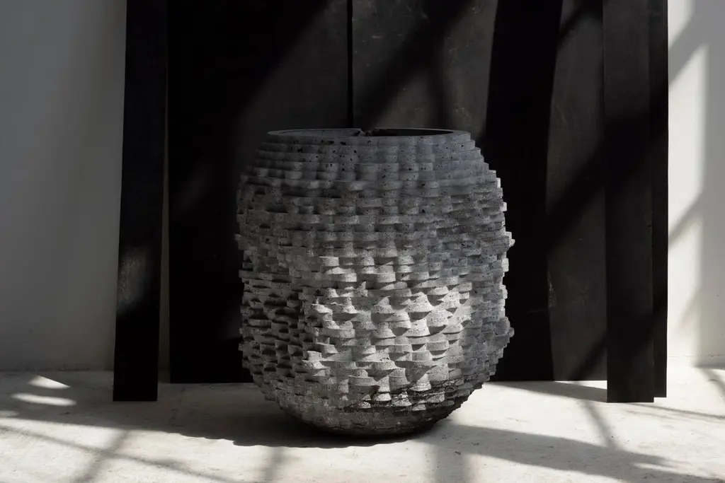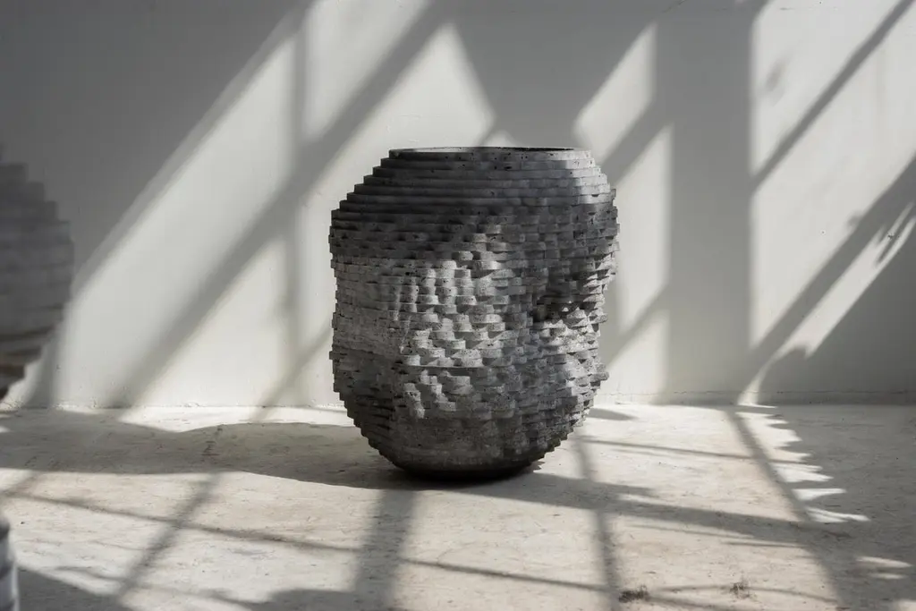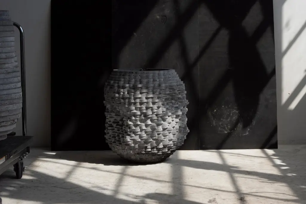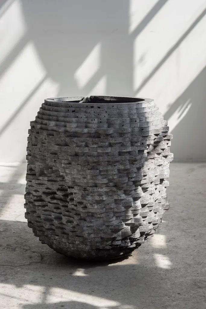 Large hand-cast vessel for indoor and outdoor use. Drainage holes can be added.At the intersection of art, craft, and design, Concrete Poetics' debut collection of hand-cast cement sculptural furniture and accessories streamlines visually intriguing and dynamic forms juxtaposing the density of the material.Raw, brutal, visceral, and striking optical qualities are embedded in the ensemble of modular candle holders, bowls, vessels, side tables, and stools, alluding to ceremonies, rituals, and celebrations.The inspiration comes within the process. The shapes, patterns, and arrangements are created intuitively, informed by nature, land, and sea, to then later be articulated, making them suitable for casting. Ultimately exhilarated by the wabi-sabi sensibility, the urban and industrial surroundings, the final result is very organic, embracing the irregularity and the imperfection that makes every piece exceptional.These pieces are not mass-produced. they are handmade locally in New York city, on-demand or small-batch, using artisanal mold-making and casting techniques. they are susceptible to inaccuracy and deviation during the making of the casts. therefore the executed pieces are not identical to those shown in the pictures. imperfection and uniqueness are embraced and emboldened as part of the creative process and an intrinsic part of the brand's identity.