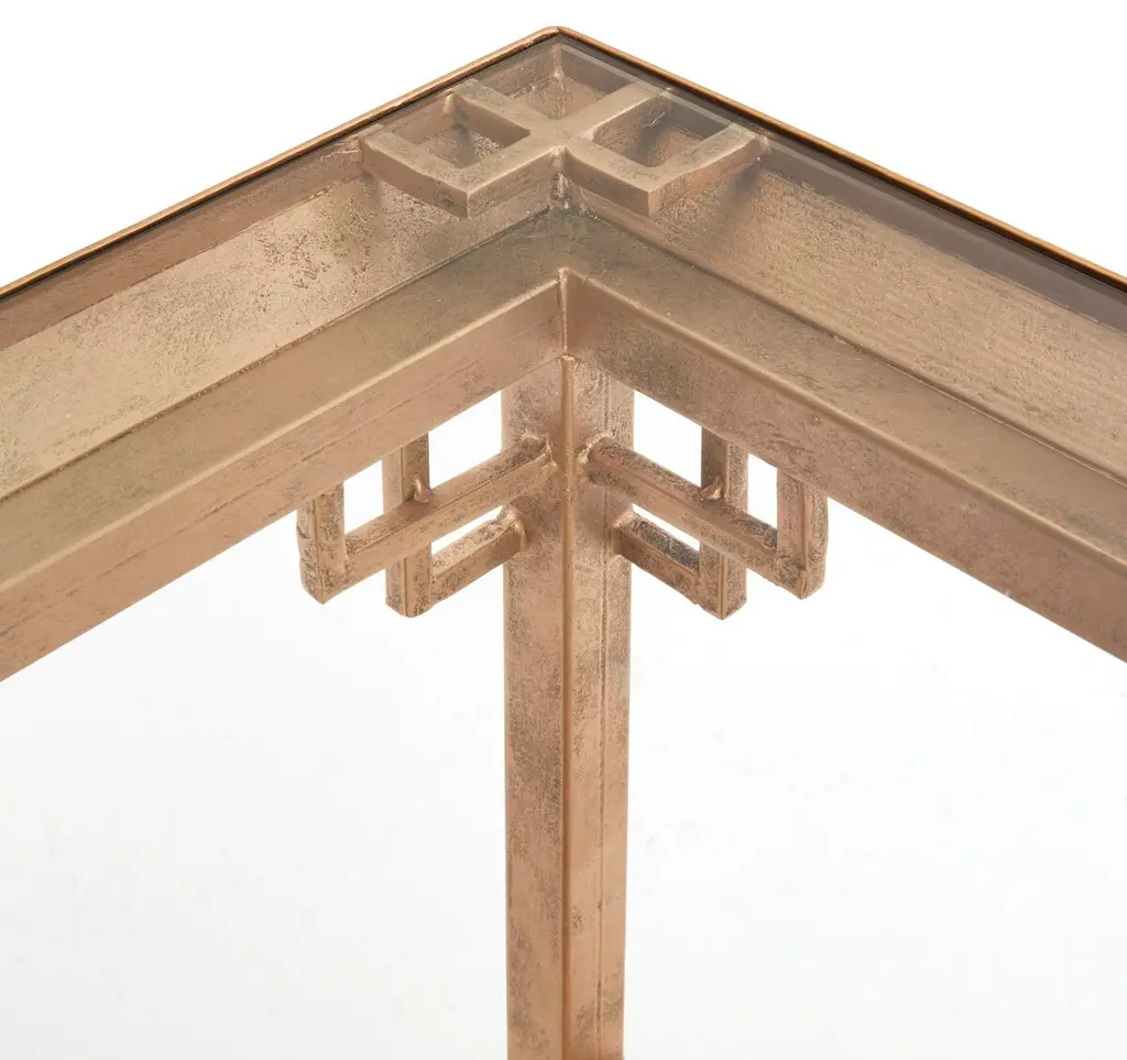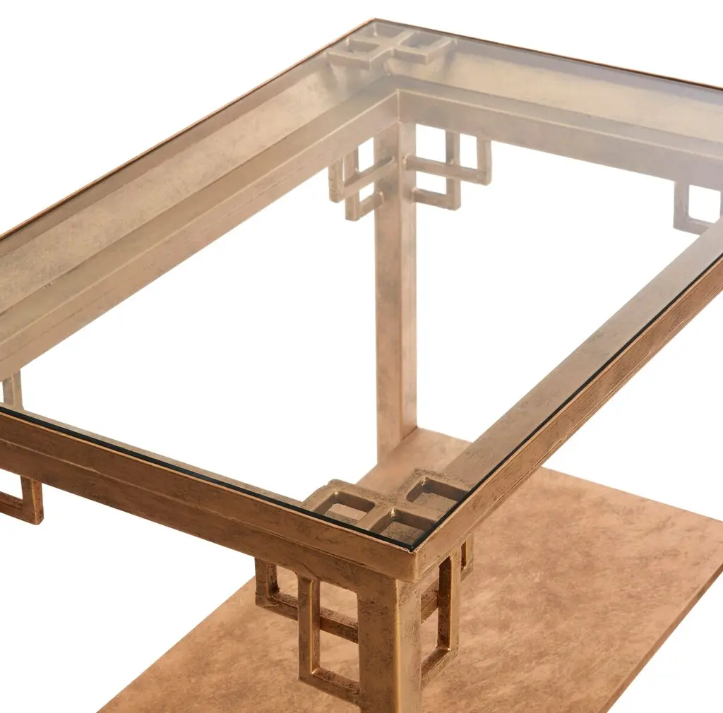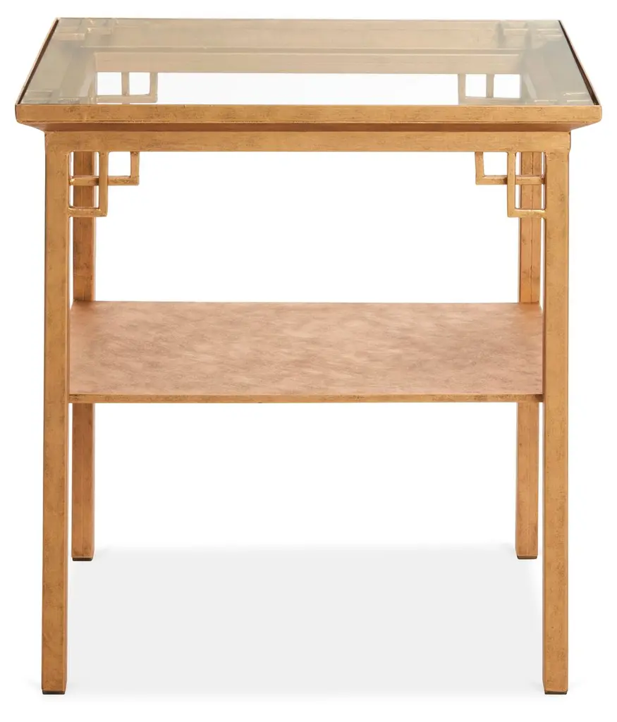 Designed by us and available only at One Kings Lane: A modern twist on Chinese Chippendale style, this side table is crafted of iron in an antiqued gold finish with open corner detailing and intricate fretwork. We love how the inset clear glass top complements the lower shelf's design.