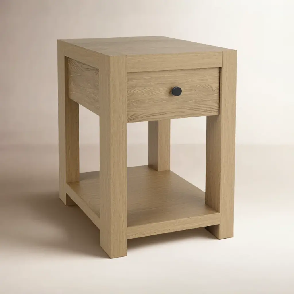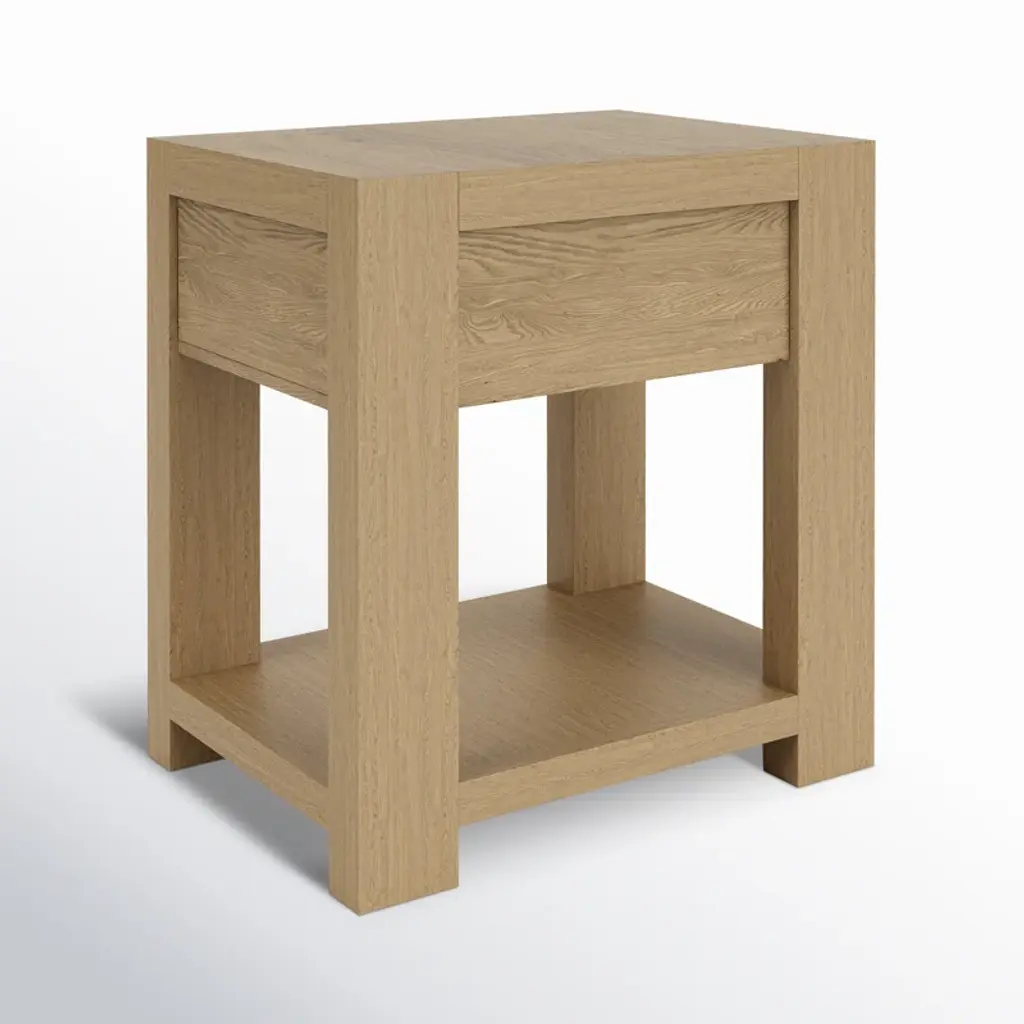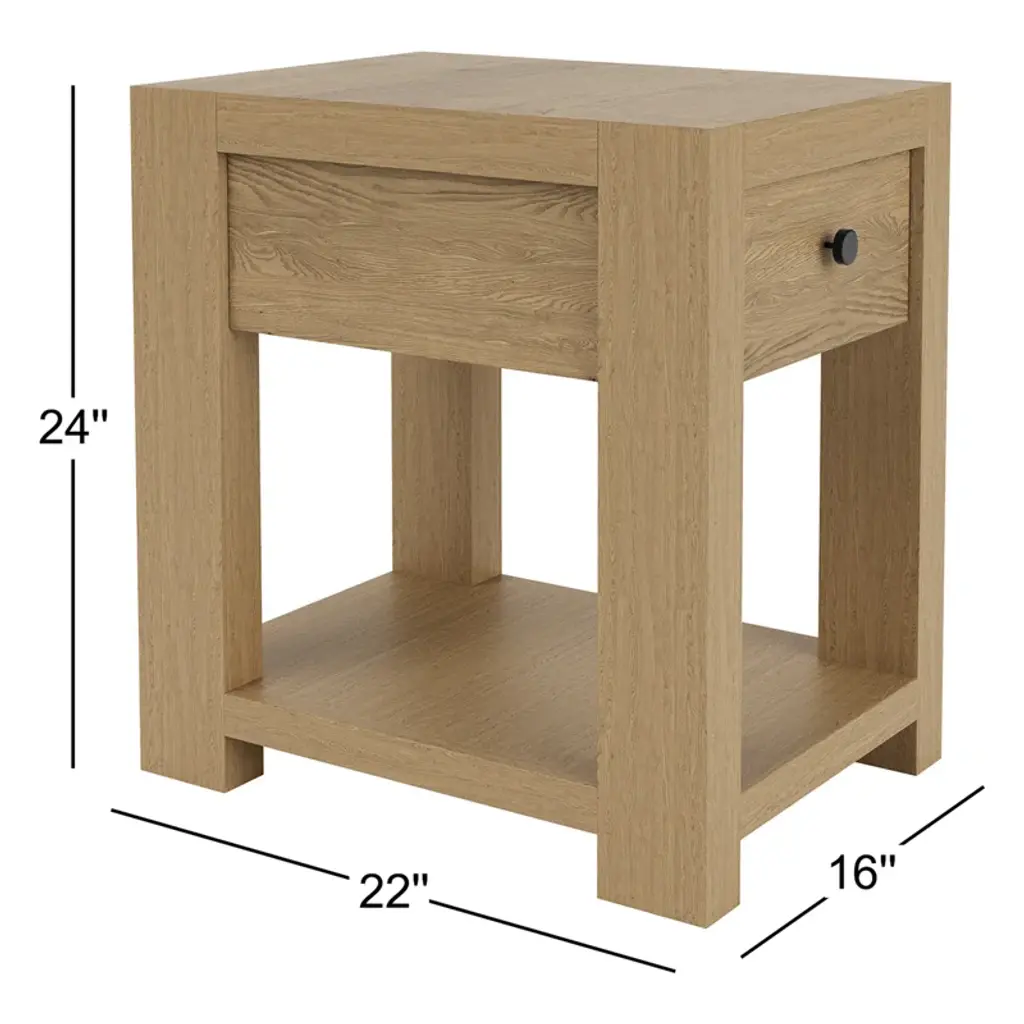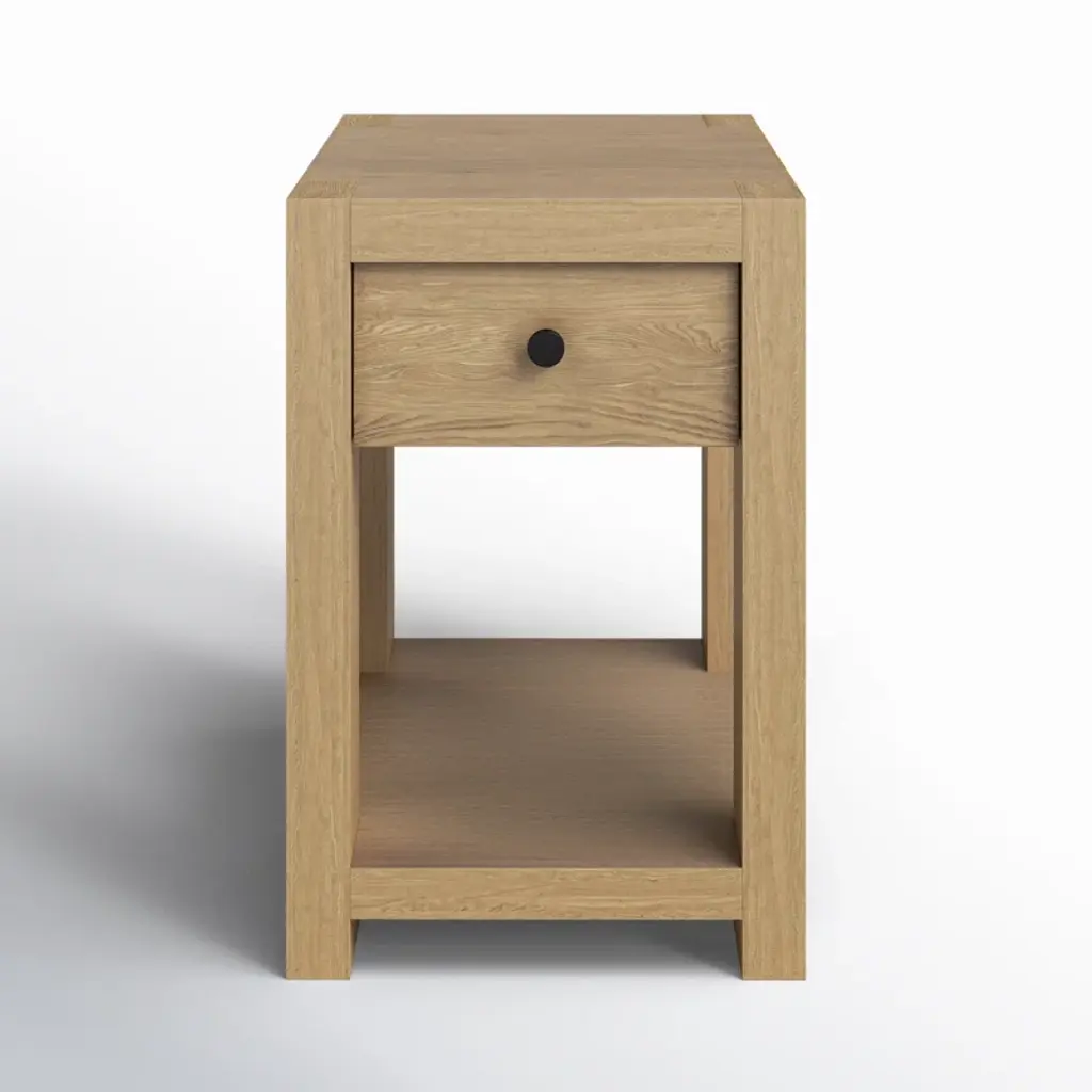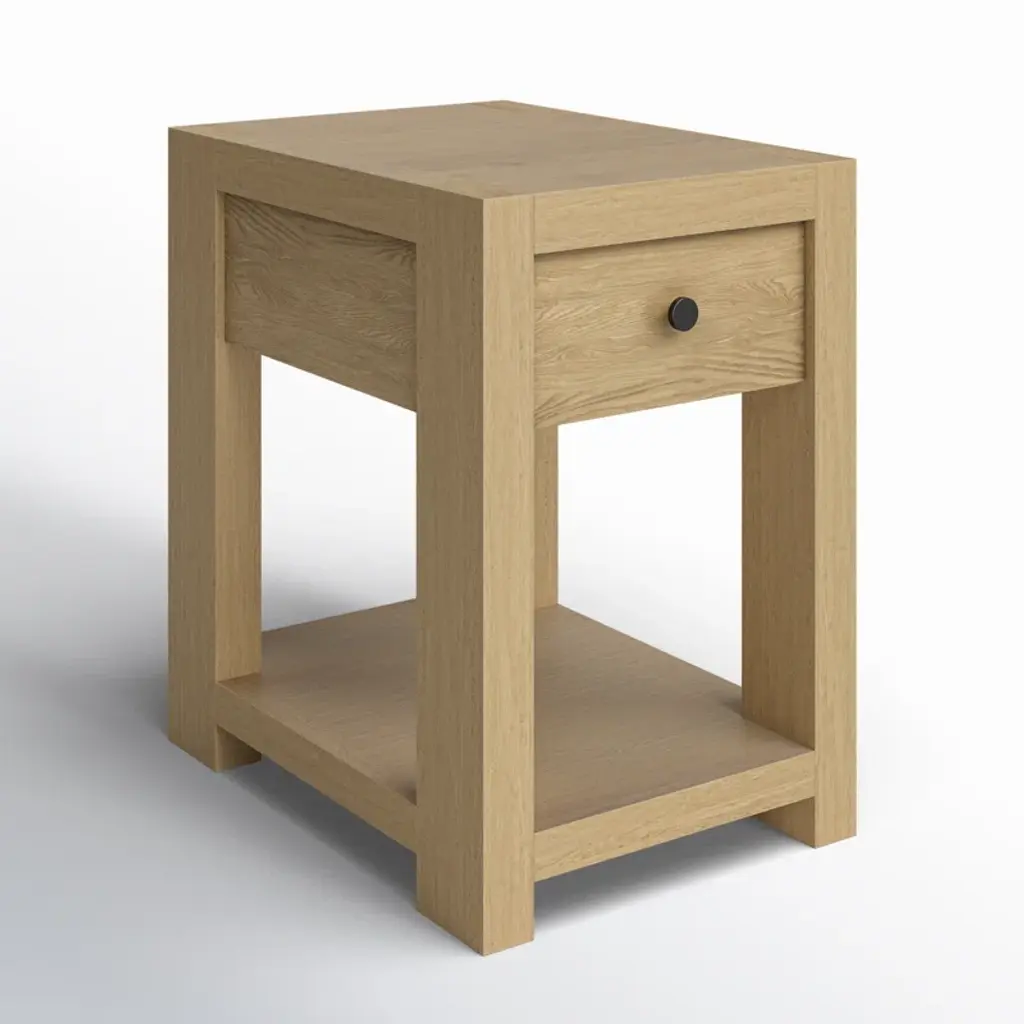 Add the finishing touch to your living space with this classic end table. Its petite shape is crafted from solid and engineered wood with a pale oak finish and wood grain details. We love that it has a lower shelf for additional storage and a subtle, single drawer for essentials you’d prefer to keep tucked away. Consider a pair for either side of your sofa or bed.