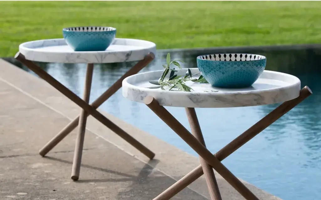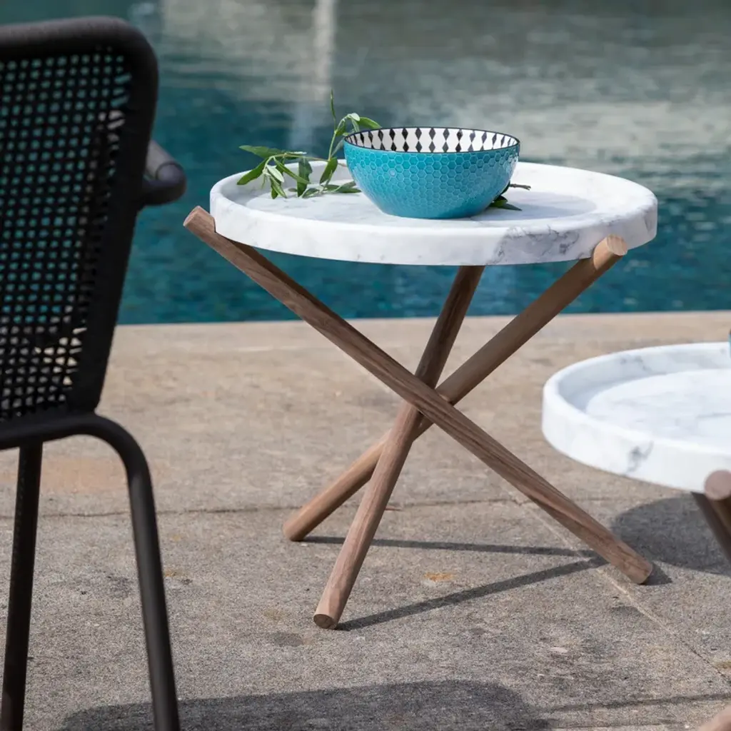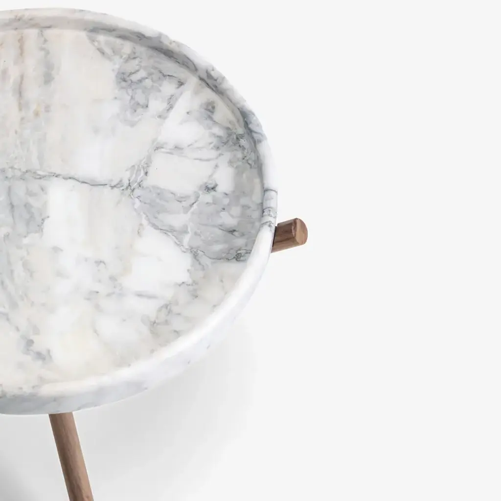 Composed of a round marble tray top and a base obtained through a minimal intersection of three wood rods, the small table Lase exudes momentum and character. Its essential lines make it a perfect, practical, and functional furnishing complement, suitable for any space.Side table consisting of a Canaletto Walnut wood base supporting a removable round tray in Carrara White marble with chamfered edges, obtained through CNC machines from a single block of stone. Surfaces are smoothed and treated with stain-resistant products.