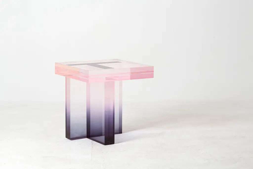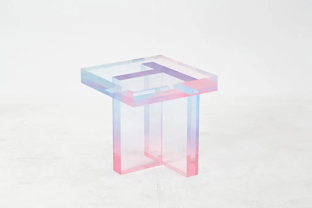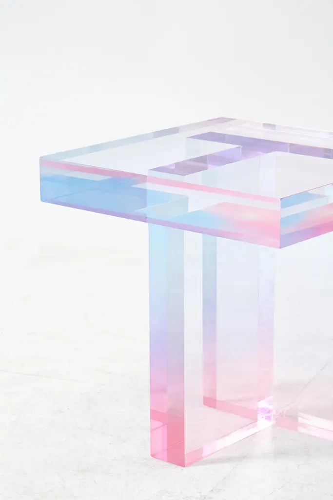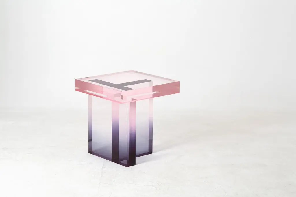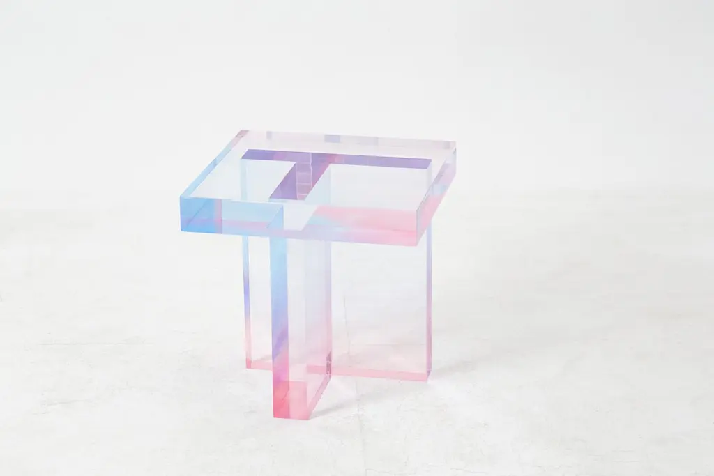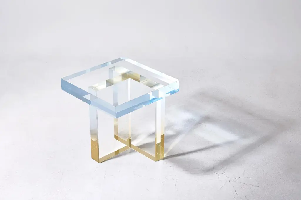 Table 01 by Saerom YoonDimensions: D 40 x W 40 x H 42 cm.Materials: Acrylic.Also available in different colors. Please contact us. My oldest childhood memories go back to the time I spent in the Philippines with my parents. The green mountains, the emerald green ocean, and every scene of me playing on this small and beautiful island still reside in me. Among them, my favorite was the beach at sunset. The memory of sitting on the beach with my family while feeling the cool breeze as the hot midday sun sets is my most precious memory.This series [ A Piece of One Day ] and [ Crystal Series ] present the fragments of my memories, the emotions of looking at the afterglow on an exceptionally stunning day, and the moments of looking up at the sunlight and the leaves sparkling under the shade of hot summer sun. By sharing this series, I wish to show the perspective of seeing nature as the space and time surrounding us along with my own experiences.I intend to give the audience a strong visual impulse to share these experiences. With these extraordinary visual catalysts, I hope to share my memories with the audience, and the experience imprints in their hearts as a piece of one day.