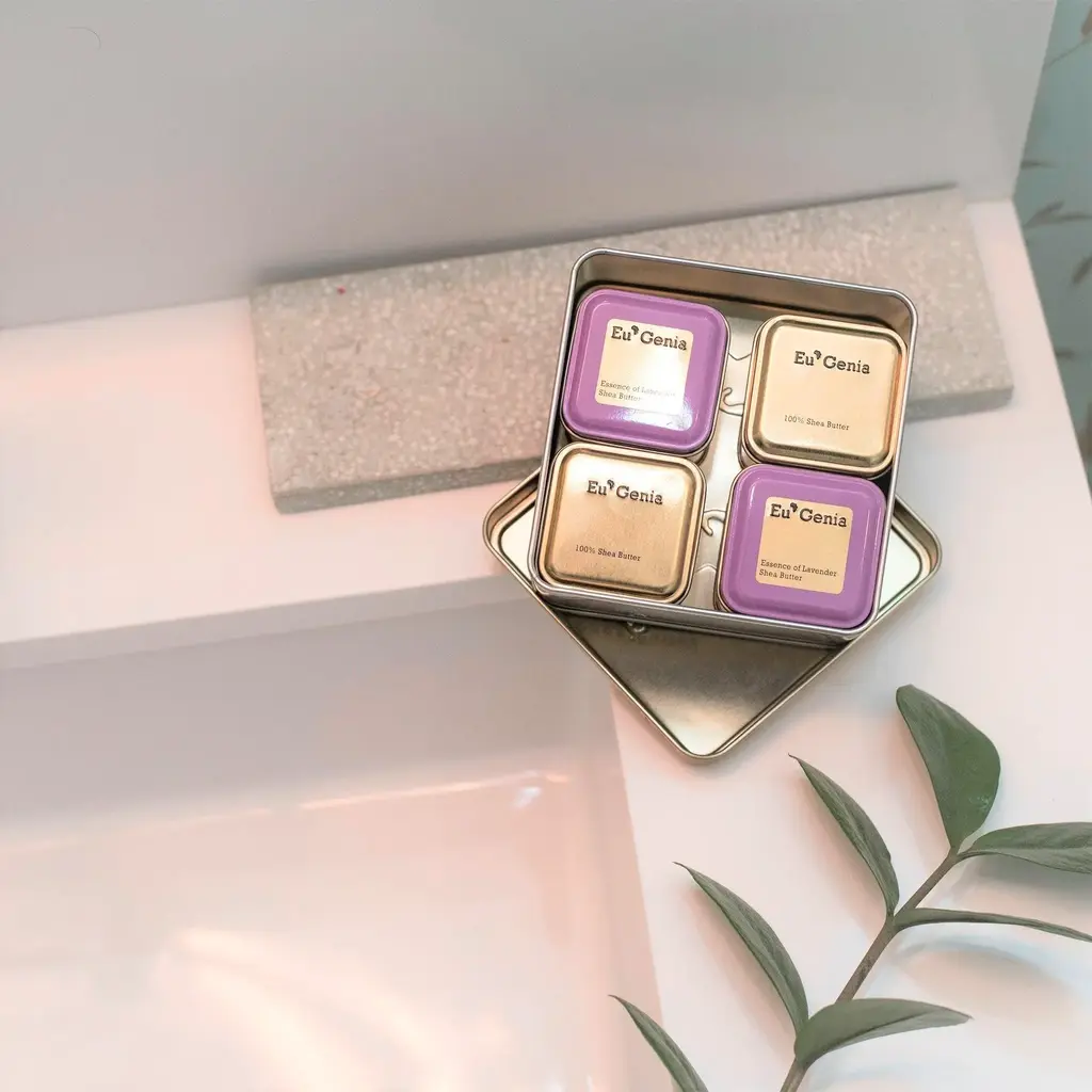 The Lavender Shea Butter Gift Set is made with the highest quality luxury shea butter in the world. The lavender butter is sustainably sourced in Ghana with over 80% shea content compared to 5% average in the market. Top the skin with the lavender body butter, a good source of vitamins A, E and K to moisturize the skin. Set contains two lavender fragrance with 82.5% shea and two dermatological 100% shea in 2oz reusable tins. Place a tin of lavender hand cream on a bedside table or purse for convenient access.