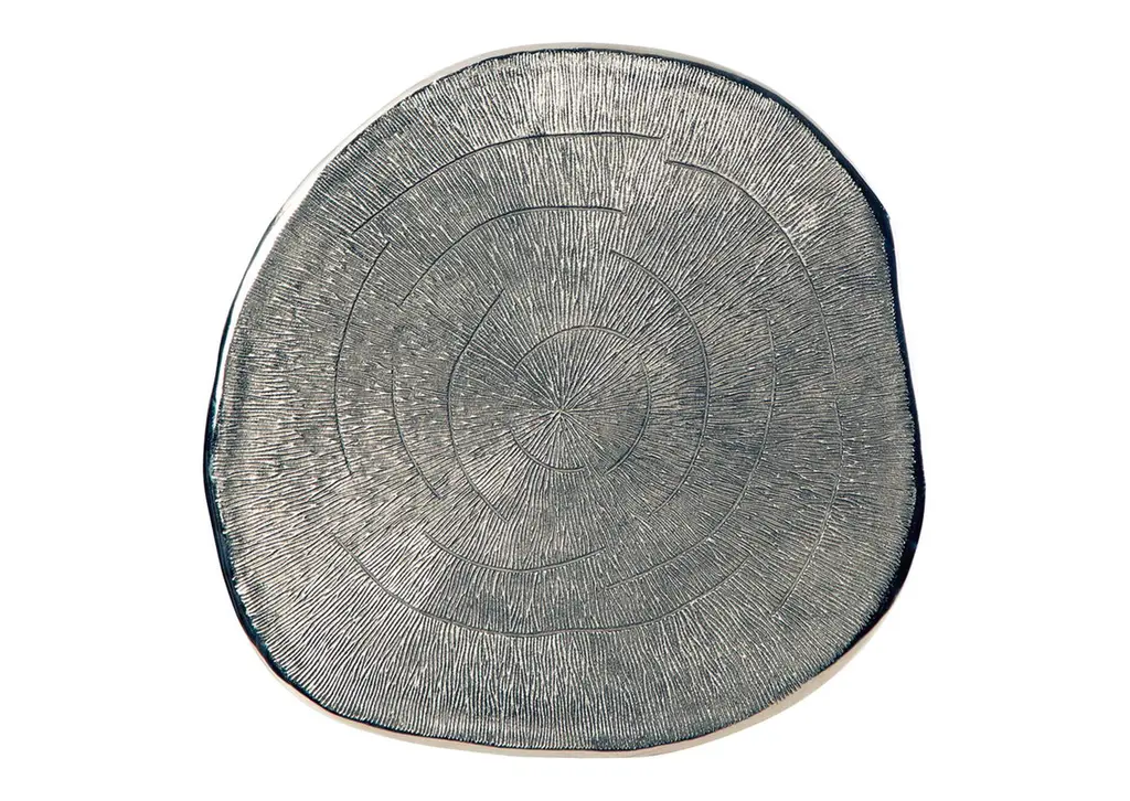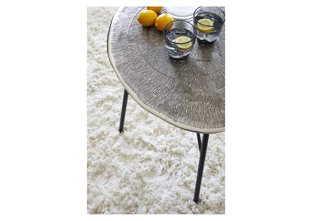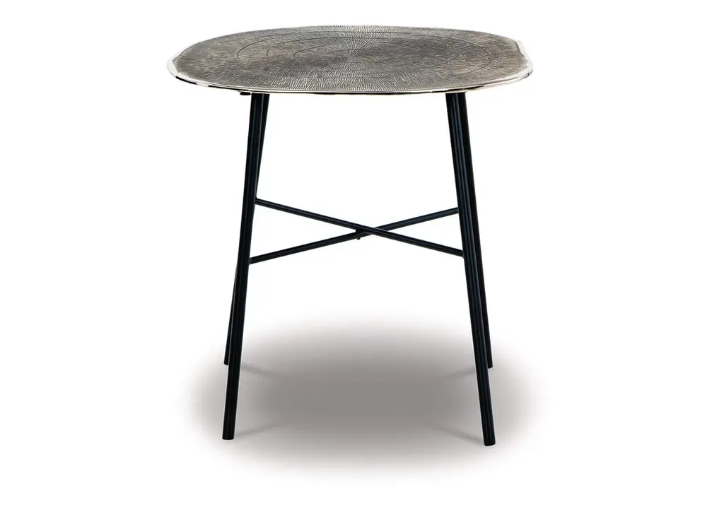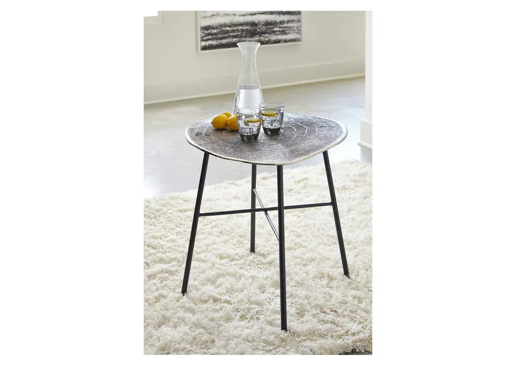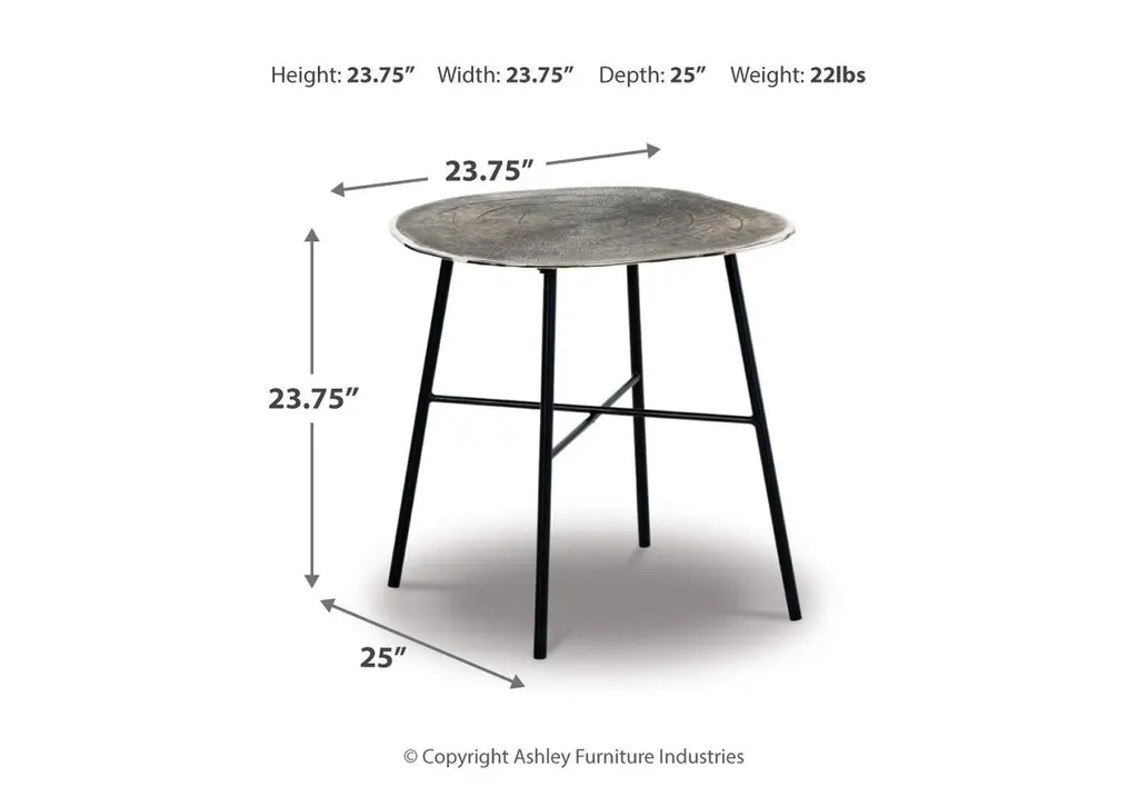 Rich with curated character, the Laverford end table puts a contemporary spin on natural beauty. Its irregular grooved top is refined with the glamour of a gleaming chrome-tone finish. A black base completes this cool piece. Weight 22.000 lbs. (9.9kgs.)