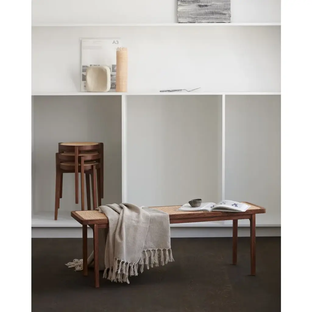 NORR11's Le Roi side table features a sleek three-legged base and a classic French rattan top. The table's downward tapering legs are crafted from solid ash, and the tabletop is woven by hand. This versatile side table is perfect for placement beside a sofa, bed or window and can also double as a lightweight stool – when stacked, the stools create a beautiful spiral pattern. Launched in 2018, the Le Roi collection was designed by Kristian Sofus Hansen and Tommy Hyldahl.