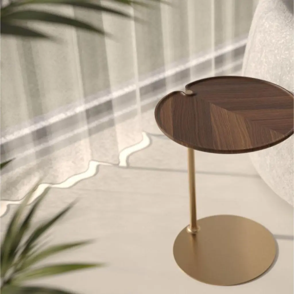 Leaf 1 round side table by Mathias De FermDimensions: D 42.5 x W 44 x H 55.5 cmMaterials: Walnut wood, brass.Also available in different materials. LEAF-shaped walnut/oak tabletops revolve around a sleek brass base with a carefully crafted handle.This side table was designed with uncompromising materials and organic shapes that evoke a timeless aesthetic. Chevron patterned solid oak and walnut effortlessly blend in the nature-inspired design.PER:USEThey are a Belgian brand that offers high-end functional design objects, created by international designers. In a world dominated by mass production and consumption, an object becomes more desirable when it is made with craftsmanship and love.The complete PER/USE collection is produced in Europe, guaranteeing the high quality of materials used. With respect for the environment and according to high social and sustainability standards. PER/USE stands for long-lastingpleasure by contemporary classics.