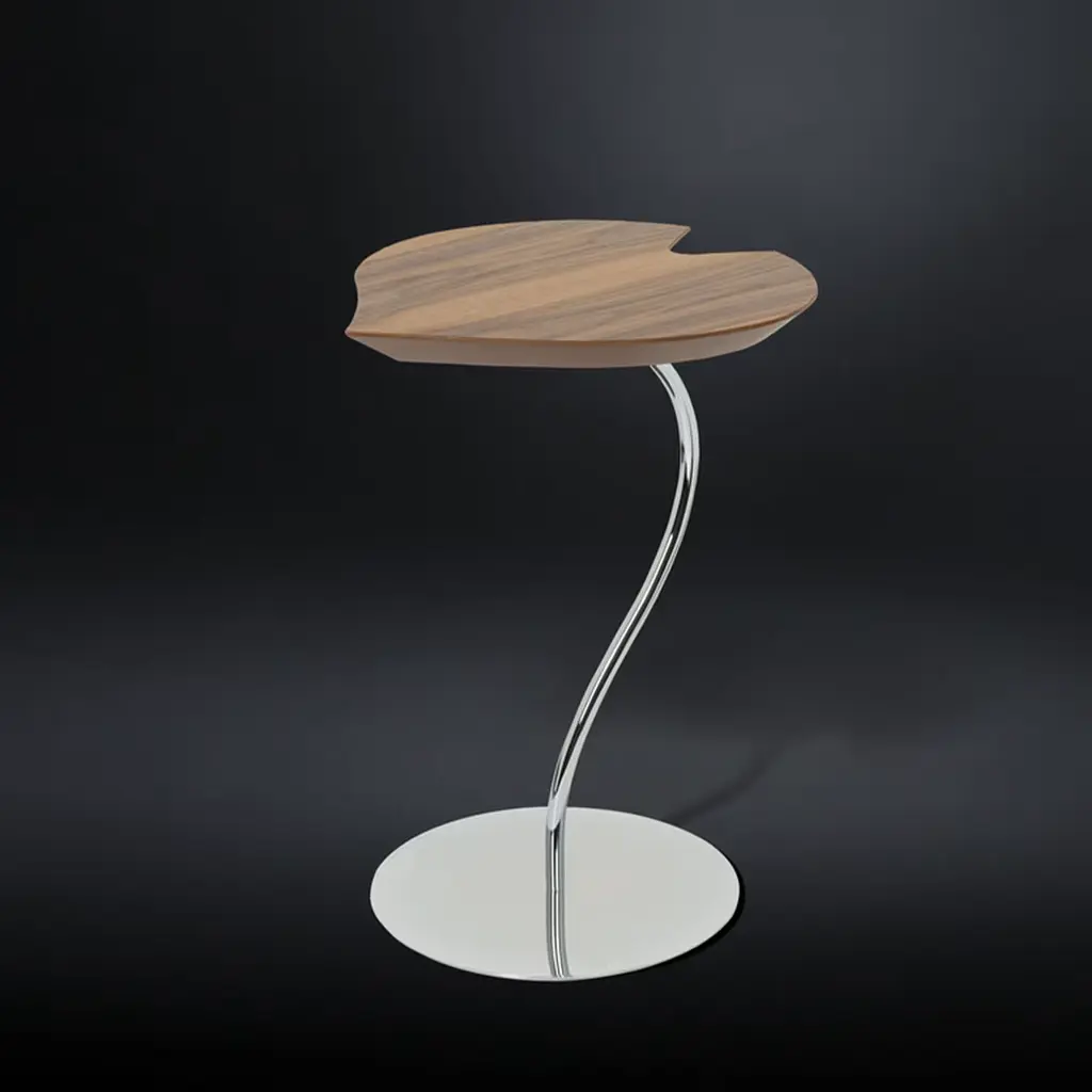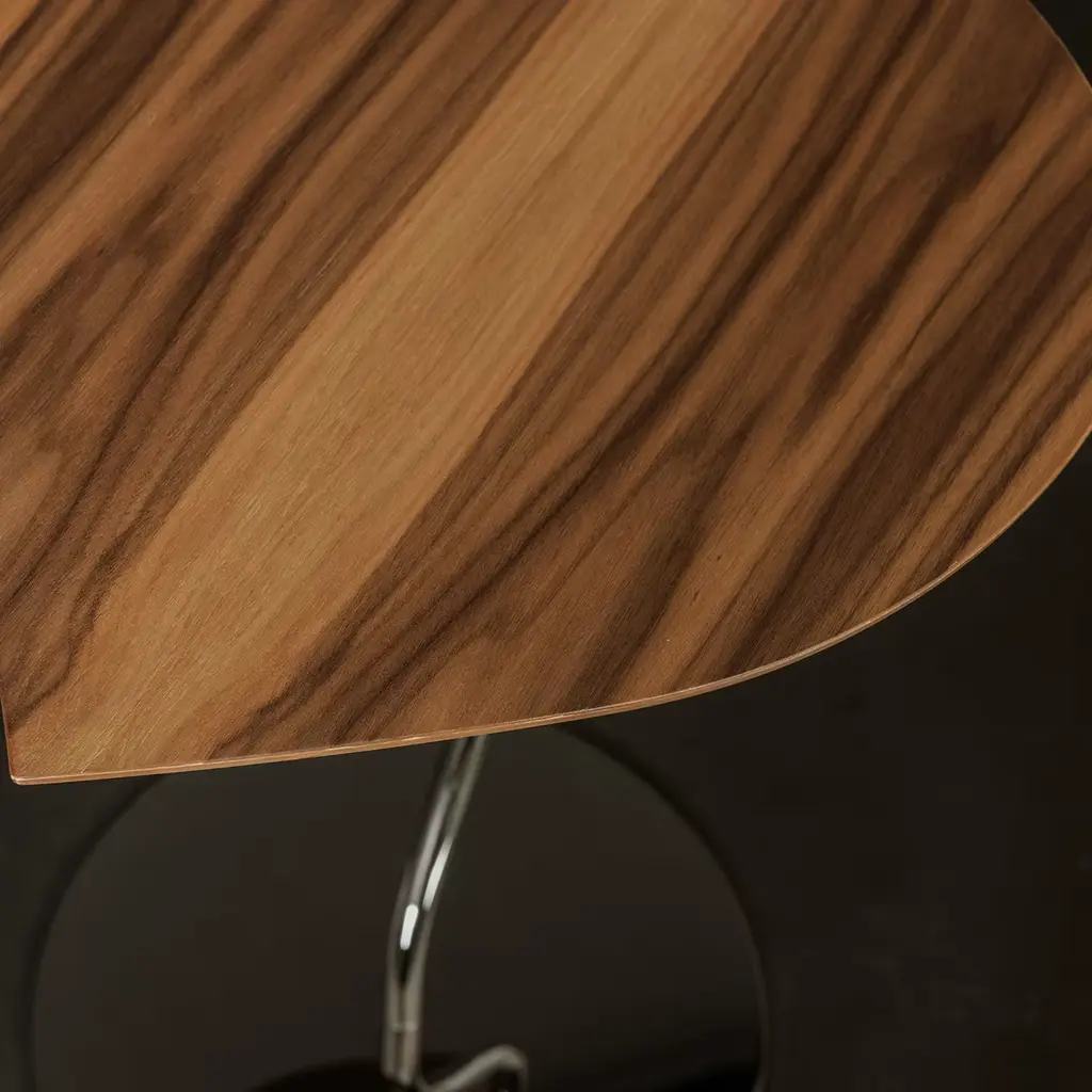 Characterized by a unique leaf-shaped design, this splendid side table merges wood and metal in a timeless sleek silhouette. Finished in Canaletto walnut and available in other hues, the top rests on a polished chromed base, an effortless combination of modern flair and natural charm. Please refer to the Concierge for more information.