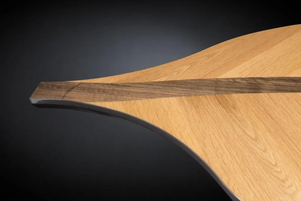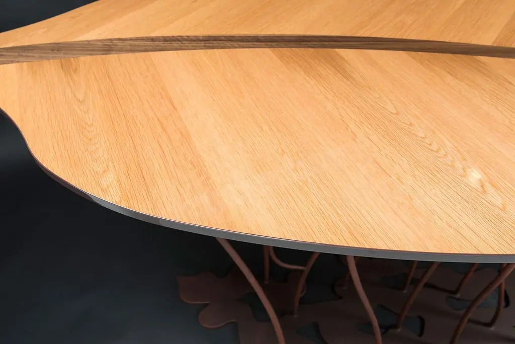 This table has an oak essence and canaletto walnut top and a corten finished steel base.
