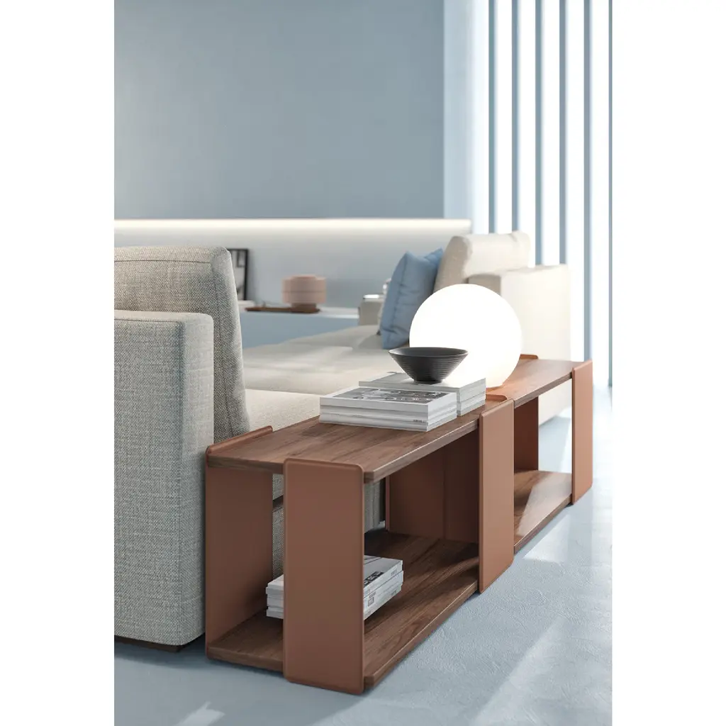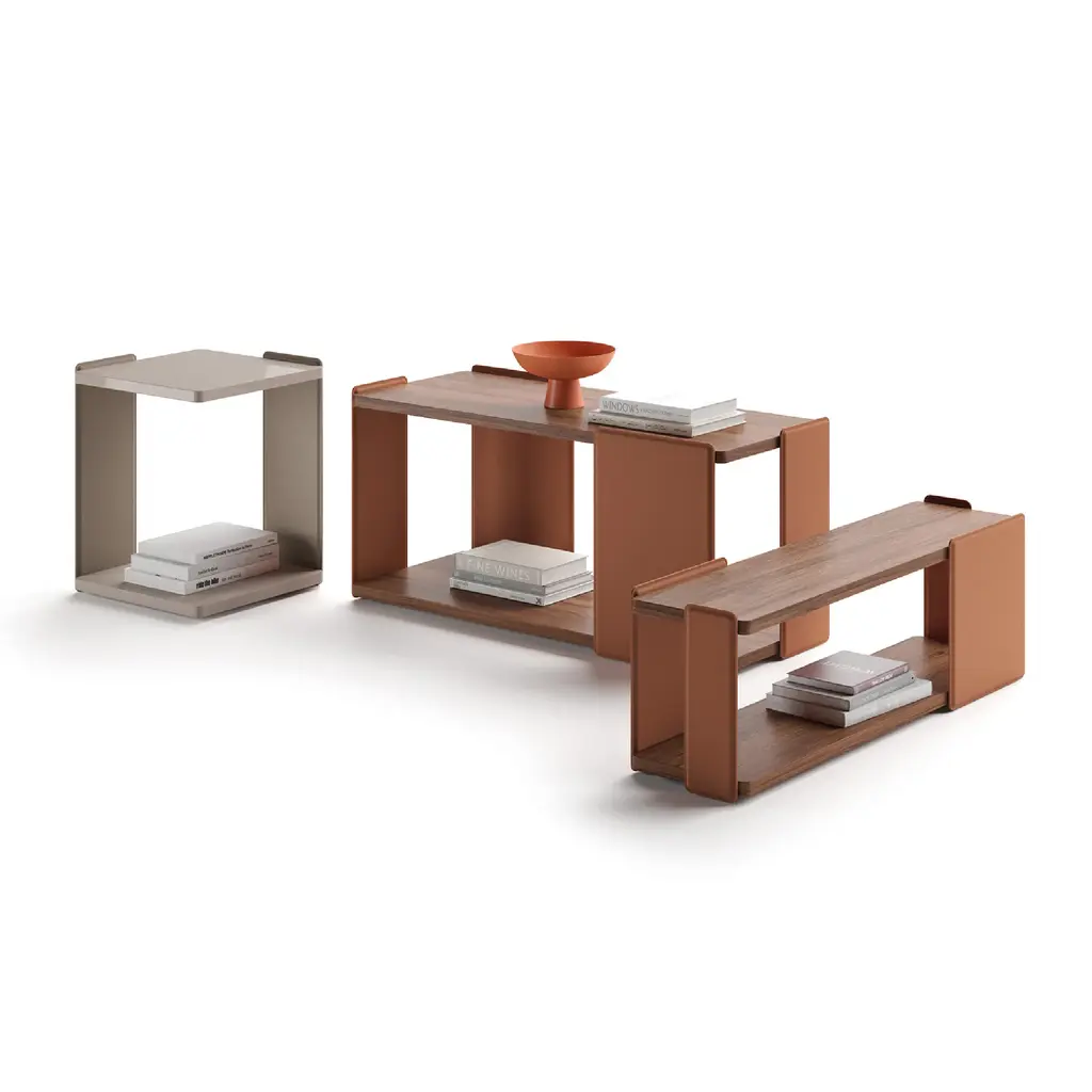 Introducing FRANK - a coffee table designed by Enrico Cesana. The metal frame is elegantly covered with natural leather in Caramello, Grafite, or Tortora. The shelves are available in Noce Canaletto or Oak wood, in natural. Elevate your space with this sophisticated and exclusive piece.