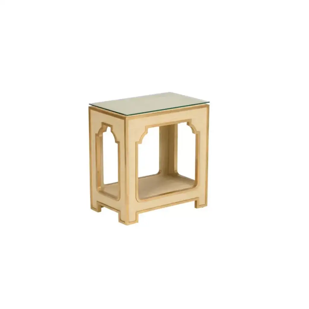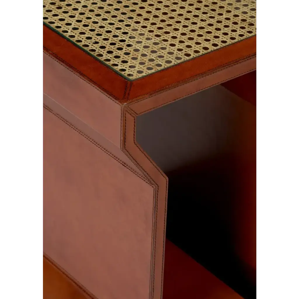 THIS SMALL ACCENT TABLE MAKE A PHENOMENAL DESIGN STATEMENT. HANDCRAFTED IN BEAUTIFUL, RICH LEATHER AND SPORTING A CANE TOP WITH FUNCTIONAL GLASS OVERLAY, IT IS A HANDSOME TABLE FOR CHAIRSIDE OR ANYWHERE.