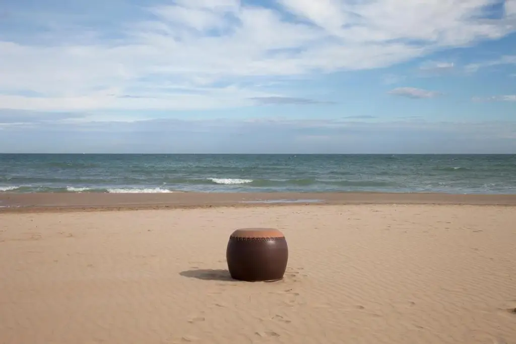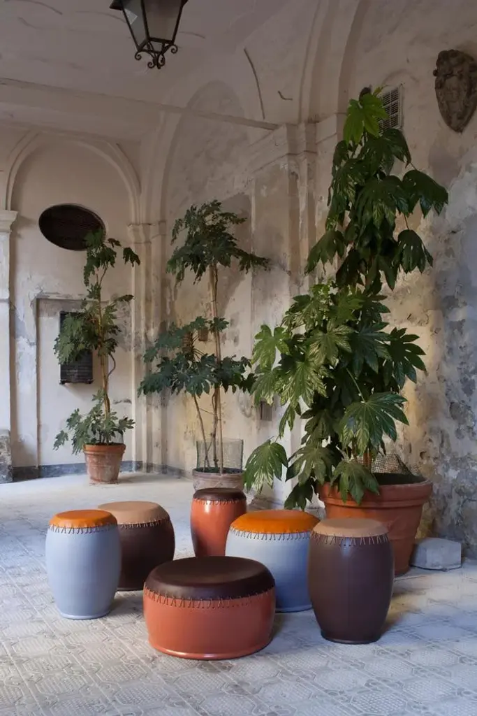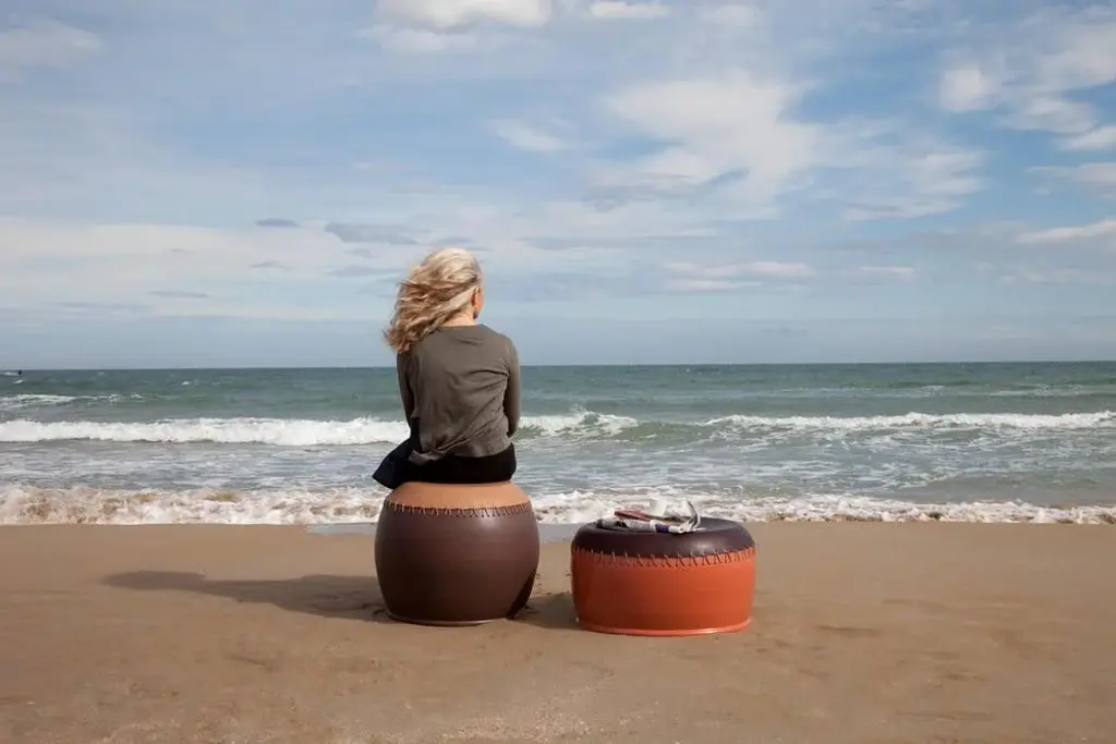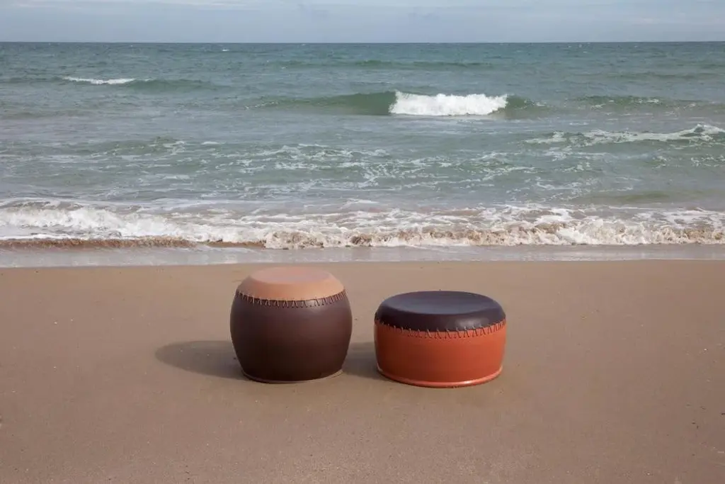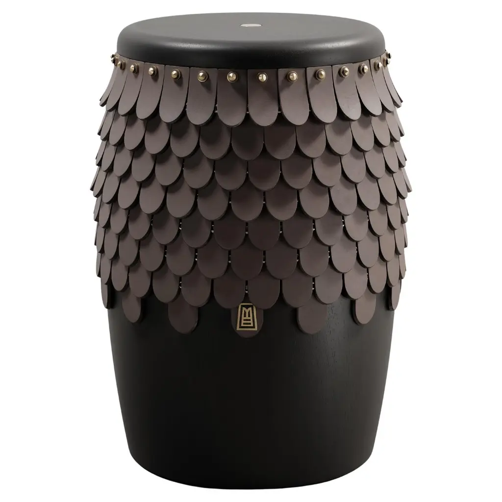Leather side table by Nestor Perkal It can also be used as a stool Available in three different dimensions: Dimensions: 45 x 58 x 58 (available in different dimensions) Nestor Perkal created Bombo in that same spirit. Its name resounds like the beating of a drum; but the reference to Argentinian drums is far more than tongue-in-cheek. The fabrication process is complex. Like upturned jars, these hollow ceramic orbs are hand made, either turned or slip-cast, depending on their size. What follows is delicate: holes are punched in the yet unfred clay. Once the pieces are fred and glazed, the leather straps that ensure that the skin seat remain taut will be laced through them. This piece is attributed to the mentioned designer/maker. It has no attribution mark and no official proof of authenticity, however it is well documented in design history. I take full responsibility for any authenticity issues arising from misattribution