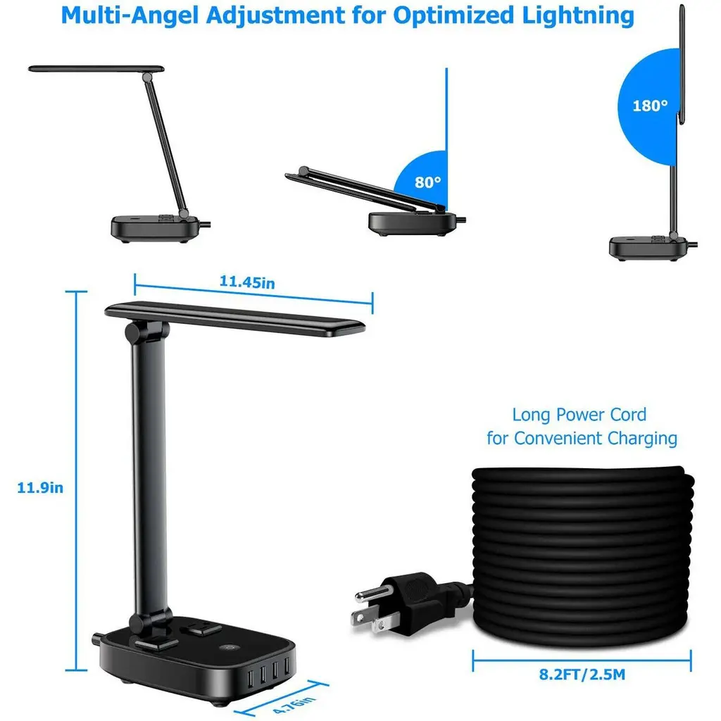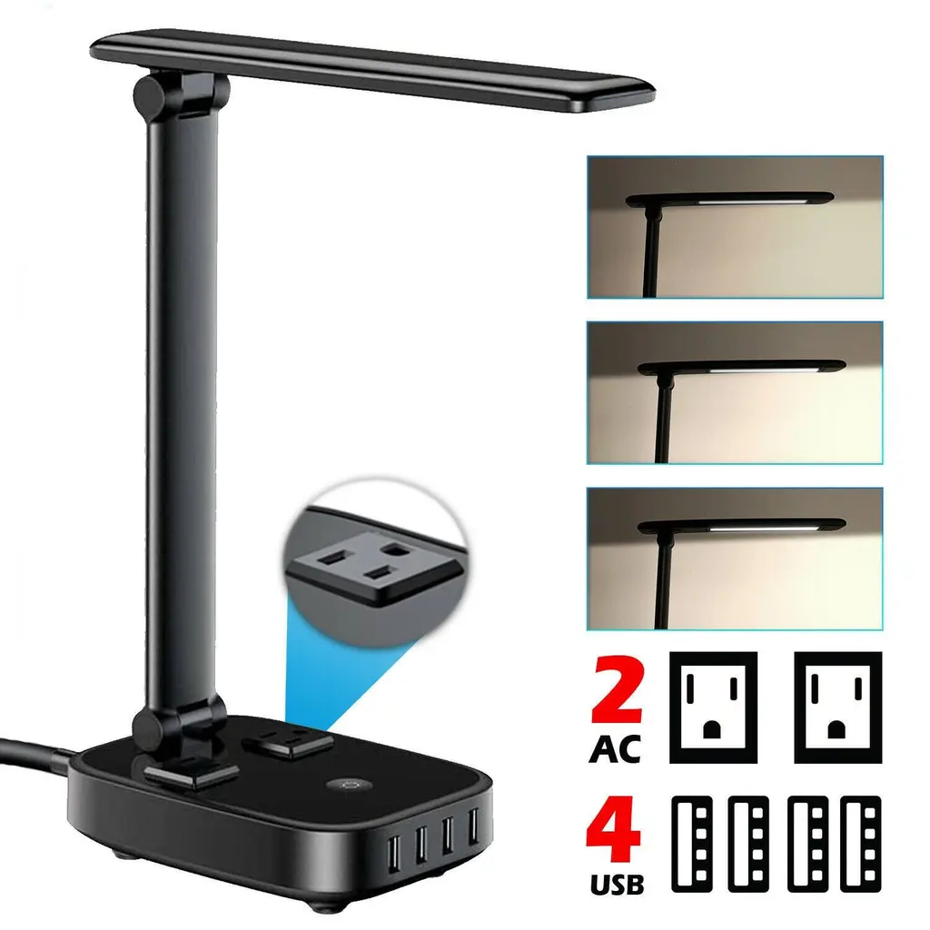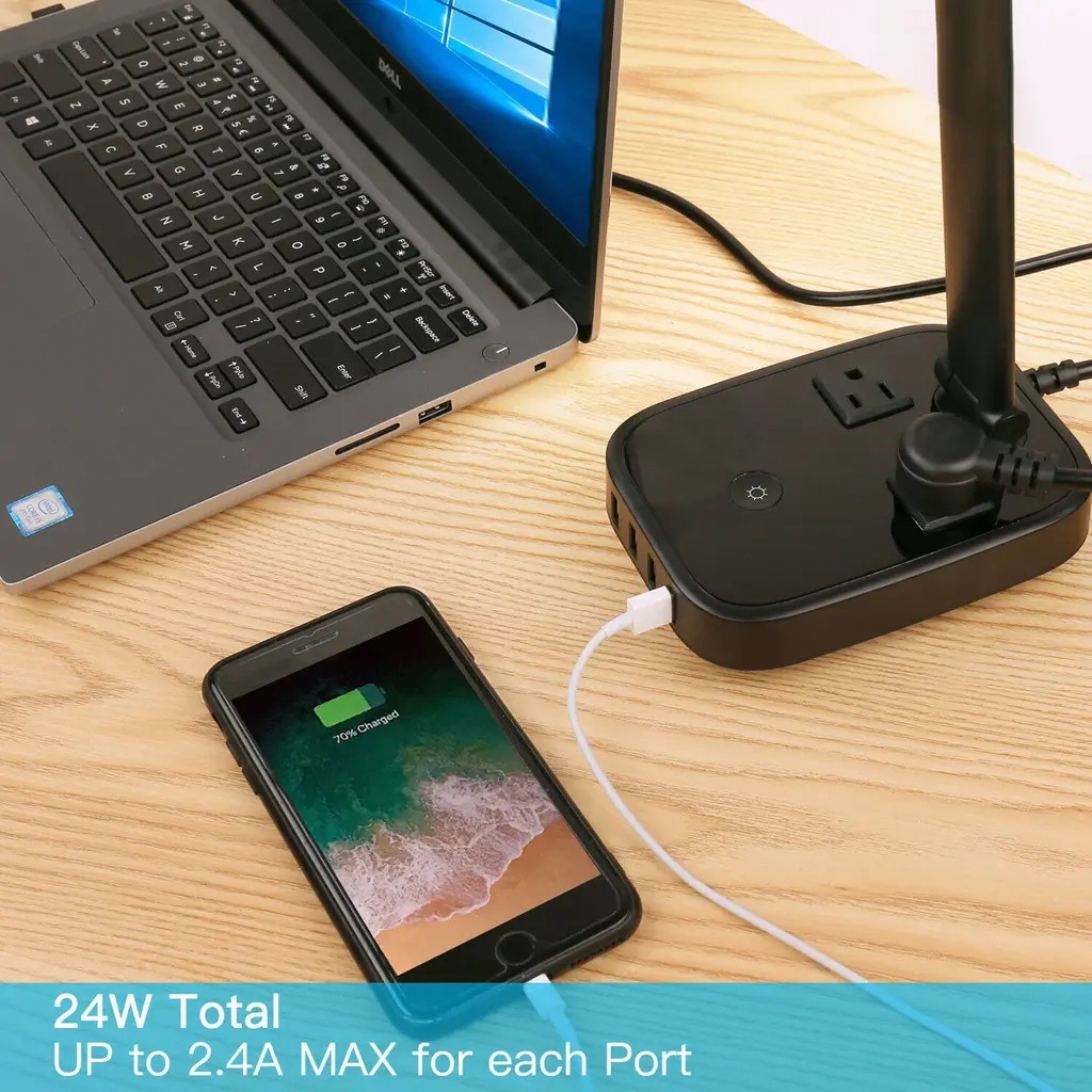4 Adjustable Brightness:The light is soft and not dizzy,adjustable low ,medium,high light for your different needs, provides a flicker-free lighting for reading, working, or studying.Good for home, office, college dorm, school, hotel.(Touch sensitive panel,UL Certification)4 USB Ports & 2 Outlets : The 4 USB Charging ports and 2 AC ports mean you can use this desk light as a nightstand charging station, charge your phone,iPad and Kindle, plug in your bedside lamp,specialized design for home bedroom living room, office and hotel.It also has Surge Protector(1700J),Overload,Short-circuit,Over-current and Overheating protection for safety use.2.5M Long Power Extension Cord :18 AWG,8.2FT(2.5M) thick long Power cord for your convince use.With the newest smart charging technology, our charging lamp can detect your device automatically to deliver its fastest possible charge speed up to 2.4 amps per port or 4.8 amps overall.Adjustable Angle & Space-saving :With 180° flexible arm and 90° base axis, convenient and adjustable, you can manoeuver the lamp to suit your needs,also suitable to be placed/stored in book shelf, bag, suitcase,etc.Good for home, office, college dorm, school, hotel,dorm; Basic style for men, women, teens, kids, students; For computer or writing desk, bed side table,night stand,task work,end table; For homework, study, book reading, indirect light; Perfect for secretary, typist, editor, accountant and more4 Port USB Charging Ports The USB charging port integrated into the lamp base is designed to keep your mobile phones, tablets, kindle readers, iPad, iPhone or any other devices charging. The USB port functions regardless of whether the lamp is on or off.2 Power Outlet This table lamp is designed with Two 3-Prong AC Outlet on the lamp base. No need to bend over to find a charger anymore with the help of Dual AC Outlets. A great multi-functional lamp in your desk.Eye-friendly Design With 24 high-quality LED beads for emitting soft, stable and non-flickering light, which is friendly to your eyesAdjustable Angle & Space-saving With 180° flexible arm and 90° base axis, you can effortlessly adjust the lamp for ideal illuminating angle and coverage Foldable lamp head and arm for most space saving, suitable to be placed/stored in book shelf, bag, suitcaseSpecificationsLamp Dimension: Base 5.91 x 4.33 x 1.0 inches, Height 11.9 inchesAC Outlet Rated Output: AC 100-240V , 10A Max, 1000-2400WAC Rated Input: 100-240V , 50/60HzUSB Total Output: DC 5V 4.8A (max) 24WPer USB Output:5V/2.4A MaxJoule Rating:1700J Power Up State: US Plug AC Power Cord: 8.2Ft (2.5M)Item Weight: 1.5 lbsSwitch Type: Touch Switch Material: PC+ABS Fireproof PlasticsLight Source: 24 LED beads ServiceLifetime: > 40,000 HoursLED Max Wattage: 12WColor Temperature: 4000K (3 adjustable settings)Brightness: 600 LM Package included:1 x lamp1 x package1 x manual