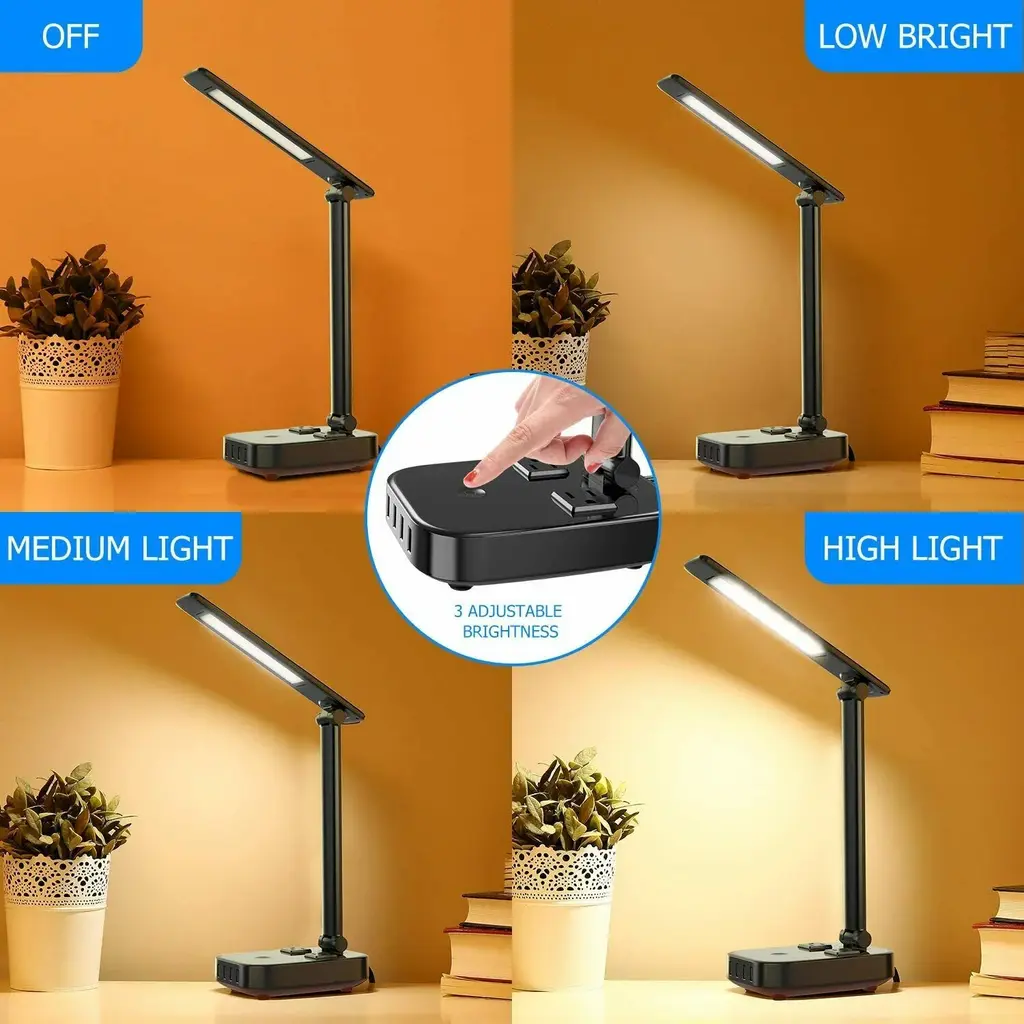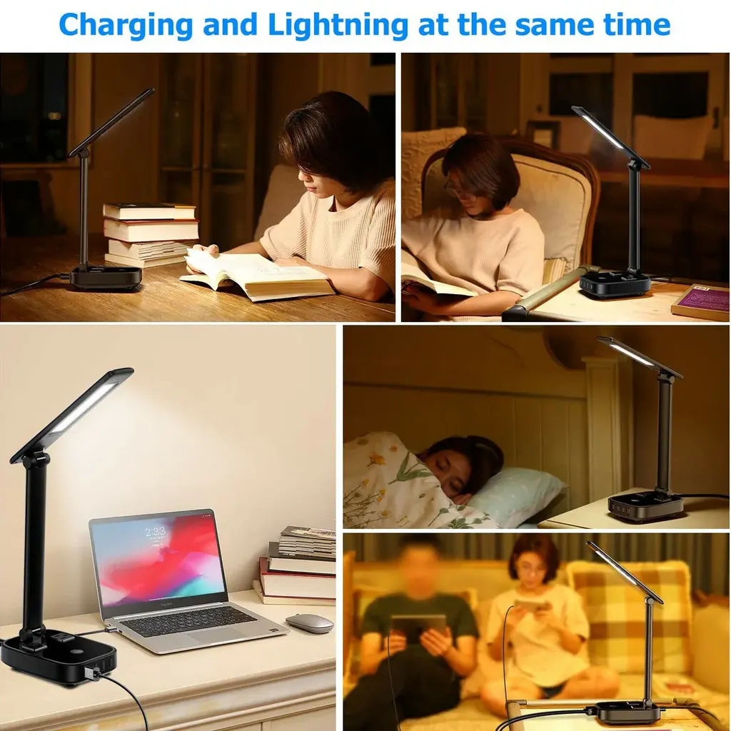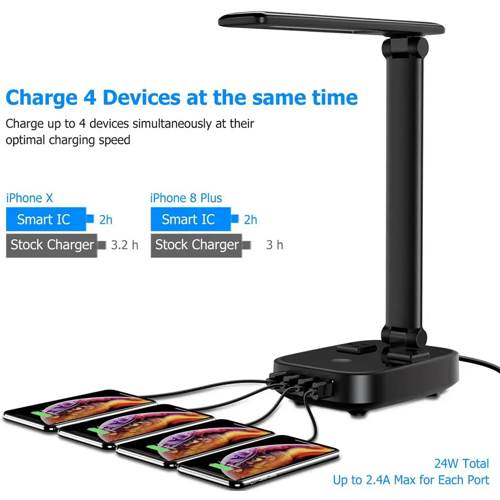 4 Adjustable Brightness:The light is soft and not dizzy,adjustable low ,medium,high light for your different needs, provides a flicker-free lighting for reading, working, or studying.Good for home, office, college dorm, school, hotel.(Touch sensitive panel,UL Certification)4 USB Ports & 2 Outlets : The 4 USB Charging ports and 2 AC ports mean you can use this desk light as a nightstand charging station, charge your phone,iPad and Kindle, plug in your bedside lamp,specialized design for home bedroom living room, office and hotel.It also has Surge Protector(1700J),Overload,Short-circuit,Over-current and Overheating protection for safety use.2.5M Long Power Extension Cord :18 AWG,8.2FT(2.5M) thick long Power cord for your convince use.With the newest smart charging technology, our charging lamp can detect your device automatically to deliver its fastest possible charge speed up to 2.4 amps per port or 4.8 amps overall.Adjustable Angle & Space-saving :With 180° flexible arm and 90° base axis, convenient and adjustable, you can manoeuver the lamp to suit your needs,also suitable to be placed/stored in book shelf, bag, suitcase,etc.Good for home, office, college dorm, school, hotel,dorm; Basic style for men, women, teens, kids, students; For computer or writing desk, bed side table,night stand,task work,end table; For homework, study, book reading, indirect light; Perfect for secretary, typist, editor, accountant and more4 Port USB Charging Ports The USB charging port integrated into the lamp base is designed to keep your mobile phones, tablets, kindle readers, iPad, iPhone or any other devices charging. The USB port functions regardless of whether the lamp is on or off.2 Power Outlet This table lamp is designed with Two 3-Prong AC Outlet on the lamp base. No need to bend over to find a charger anymore with the help of Dual AC Outlets. A great multi-functional lamp in your desk.Eye-friendly Design With 24 high-quality LED beads for emitting soft, stable and non-flickering light, which is friendly to your eyesAdjustable Angle & Space-saving With 180° flexible arm and 90° base axis, you can effortlessly adjust the lamp for ideal illuminating angle and coverage Foldable lamp head and arm for most space saving, suitable to be placed/stored in book shelf, bag, suitcaseSpecificationsLamp Dimension: Base 5.91 x 4.33 x 1.0 inches, Height 11.9 inchesAC Outlet Rated Output: AC 100-240V , 10A Max, 1000-2400WAC Rated Input: 100-240V , 50/60HzUSB Total Output: DC 5V 4.8A (max) 24WPer USB Output:5V/2.4A MaxJoule Rating:1700J Power Up State: US Plug AC Power Cord: 8.2Ft (2.5M)Item Weight: 1.5 lbsSwitch Type: Touch Switch Material: PC+ABS Fireproof PlasticsLight Source: 24 LED beads ServiceLifetime: > 40,000 HoursLED Max Wattage: 12WColor Temperature: 4000K (3 adjustable settings)Brightness: 600 LM Package included:1 x lamp1 x package1 x manual
