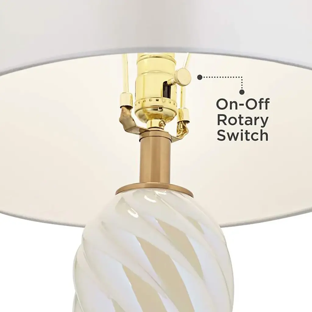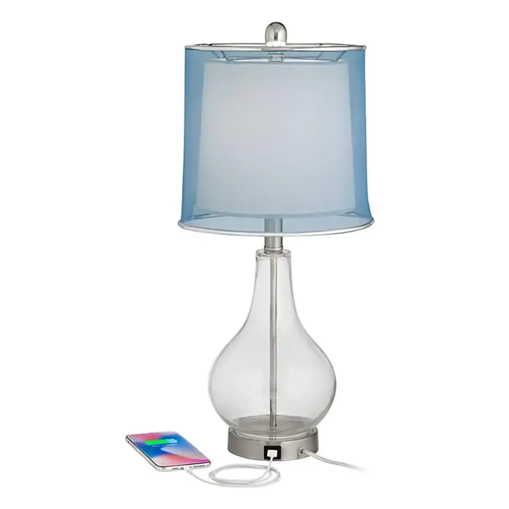 Set of 2 USB lamps. Each is 21 3/4" high overall. Bases are 4 3/4" wide at the bottom. Shades are 10 1/2" high x 9 1/2" wide. Weigh 6 lbs. Each lamp uses one maximum 100 watt standard-medium base bulb (not included). On-off socket switches. Set of two contemporary modern table lamps Each lamp has a built-in Type-2A USB port for powering electronic devices. Clear glass and metal construction. Brushed nickel finish accents. Double shade design. Blue sheer fabric outer shade, white inner shade. 8-foot long clear cords. With a beautiful design and modern features, these accent table lamps are a wonderful addition to a living room or bedroom. In a convenient set of two, they come in curving clear glass bodies, with brushed nickel finish accents that add a contemporary look. On top is a double shade design, with a transparent blue shade that encases an opaque white shade for eye-catching effect. Each lamp has a USB port built into the base, designed to charge smartphones and other handheld devices.