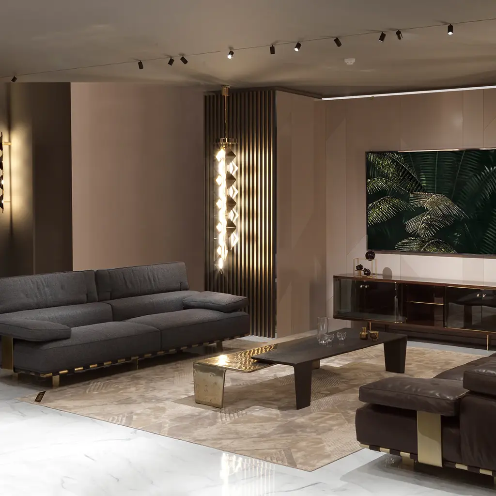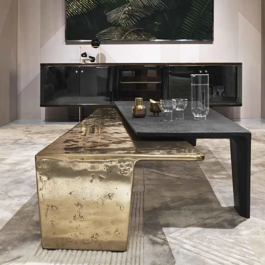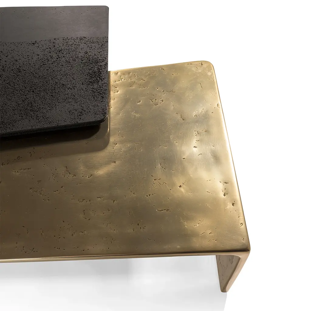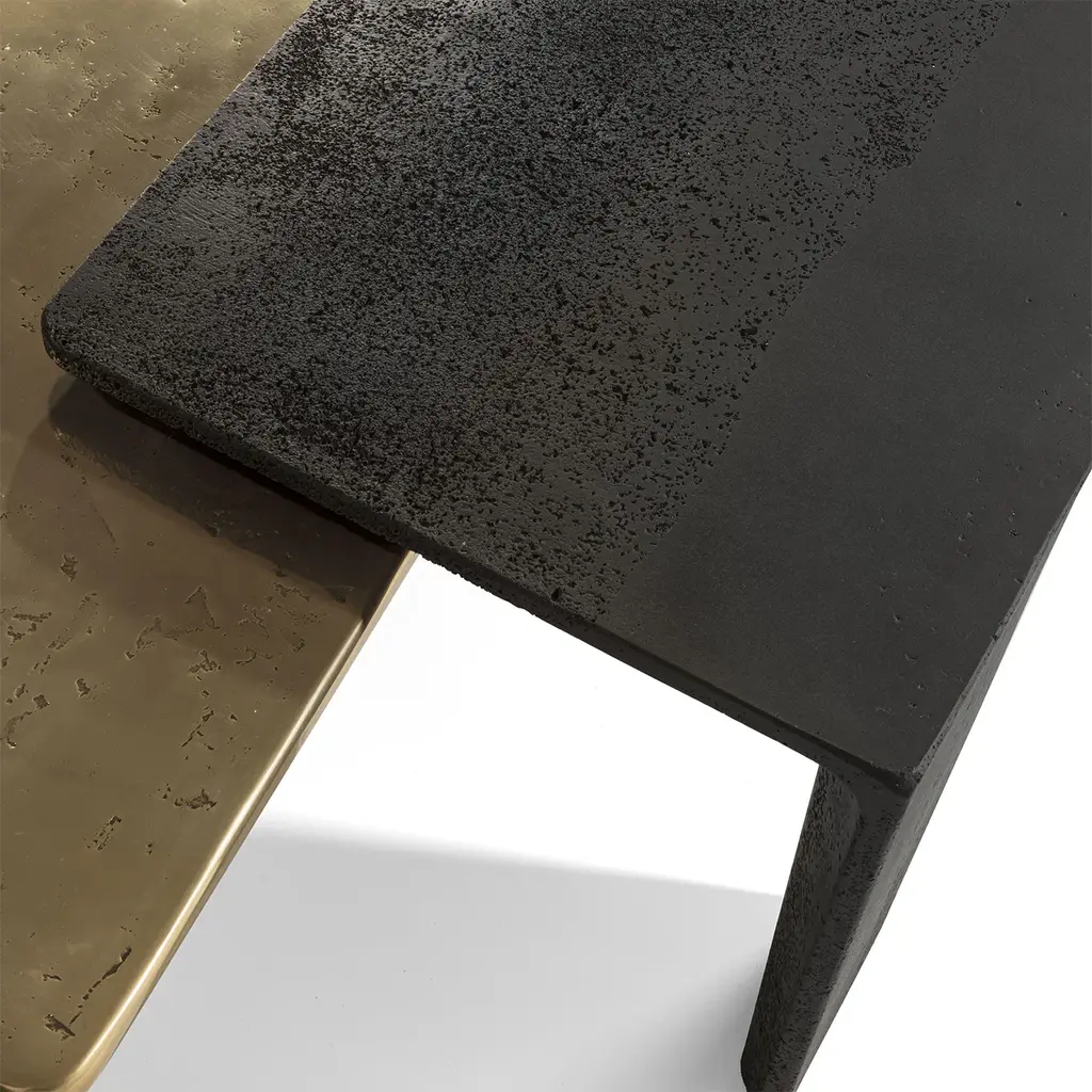 The Lego Nesting Table, designed by Draga&Aurel, features a load-bearing structure in cast gold aluminum, polished and hand-pigmented with a Siena finish. The top is crafted from black Vasilia T marble, adding a bold, elegant touch to the piece. This design perfectly blends luxury with functionality, making it a standout addition to any space.