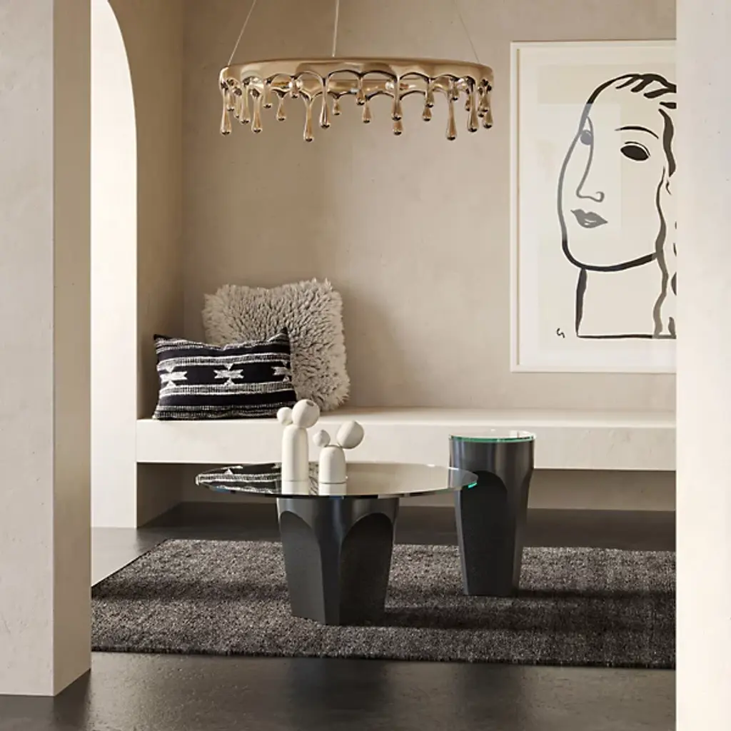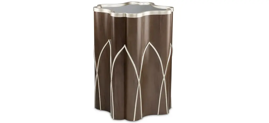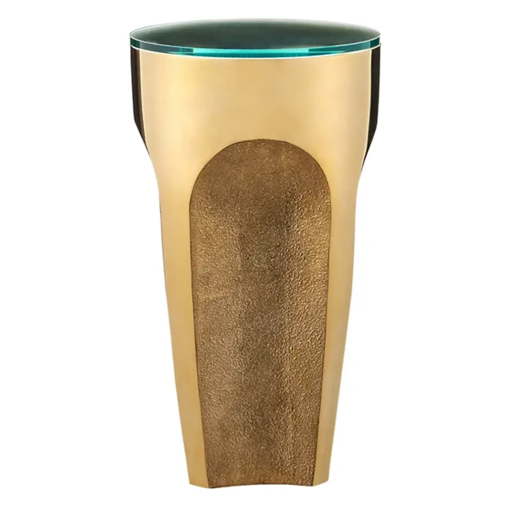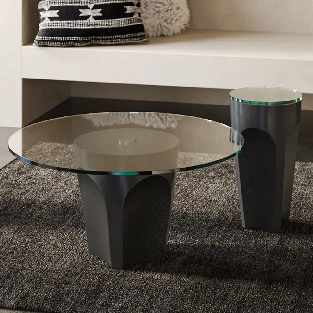 The Lemy Drinks Table from Currey & Company is a bold mix of shape and texture, blending refined polish with artisanal craftsmanship. Molded from stainless steel, its sculptural base features carved-like inner indentations that add depth and dimension to its character. A round tempered glass top provides a smooth contrast, offering a functional surface with a light, airy feel that contrasts with the metal. Perfect for modern interiors, this compact accent table makes a sophisticated statement, whether placed beside a lounge chair or as a stylish standalone piece.