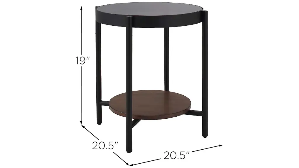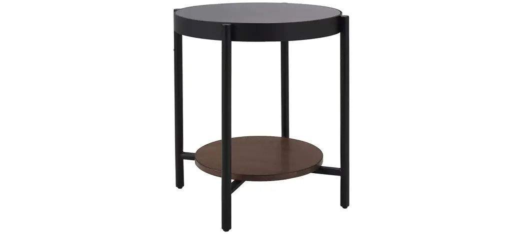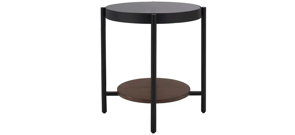 The contrast of materials in the Lenwell end table creates a striking combination to round out a contemporary office or living space. The gray smoked glass top is balanced by the sleek black metal legs and base inset with a walnut wood grain shelf.
