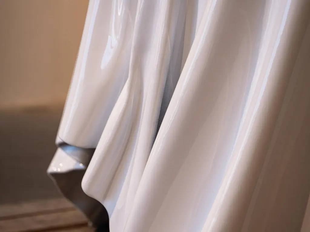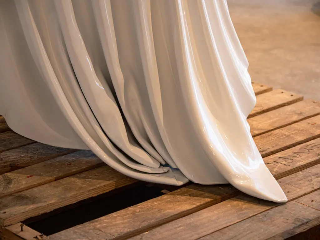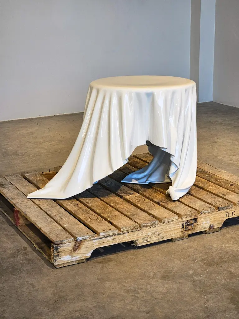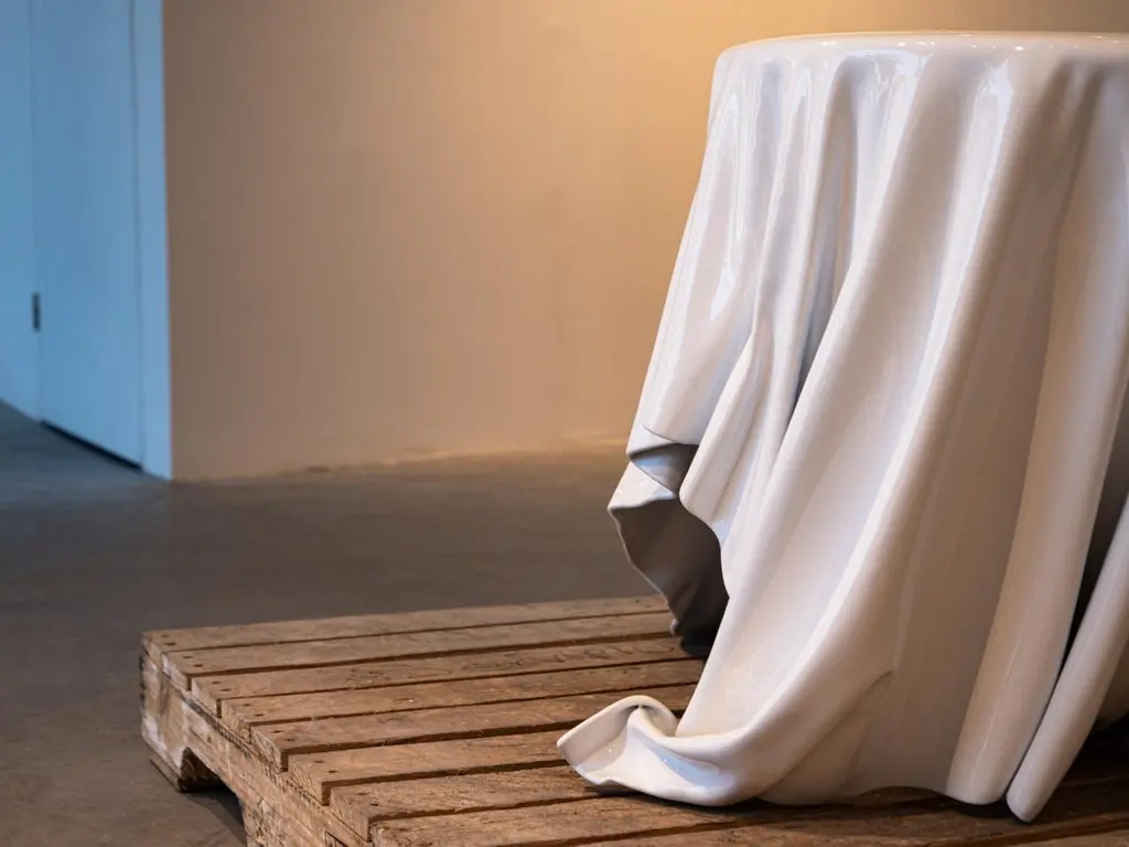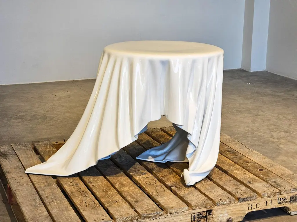 The Levitaz Side Table, finished in a White Gloss automotive finish, exemplifies modern sophistication with its elegant design and meticulous craftsmanship. This piece, sculpted from high-strength resin reinforced with carbon fiber, achieves a fluidity that echoes soft fabric draping effortlessly over the table's circular form. Its design concept leverages the classical drapery techniques seen in Renaissance sculptures, reimagined through a contemporary lens to create a table that appears enrobed in a flowing, seamless cloth. This illusion is achieved through advanced molding techniques in high-strength resin, allowing the fine details of textile-like folds to be captured in solid form. The table's design not only challenges the traditional aesthetic of rigid furniture but also evokes a sense of movement and softness, making it a profound statement piece that harmonizes with the clean, modern lines of contemporary living spaces.This conceptual design transcends traditional form, presenting a functional piece of furniture as an evocative work of art. The seamless curves and the gleaming, reflective finish enhance the visual perception of depth and movement, making this table not merely an object within a space but a pivotal design element that shapes the aesthetic and atmosphere of its environment. The Levitaz Side Table is a profound statement in the exploration of form, combining classical influences with cutting-edge fabrication techniques to achieve a striking balance of old-world elegance and contemporary design.