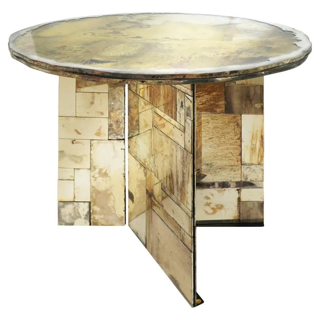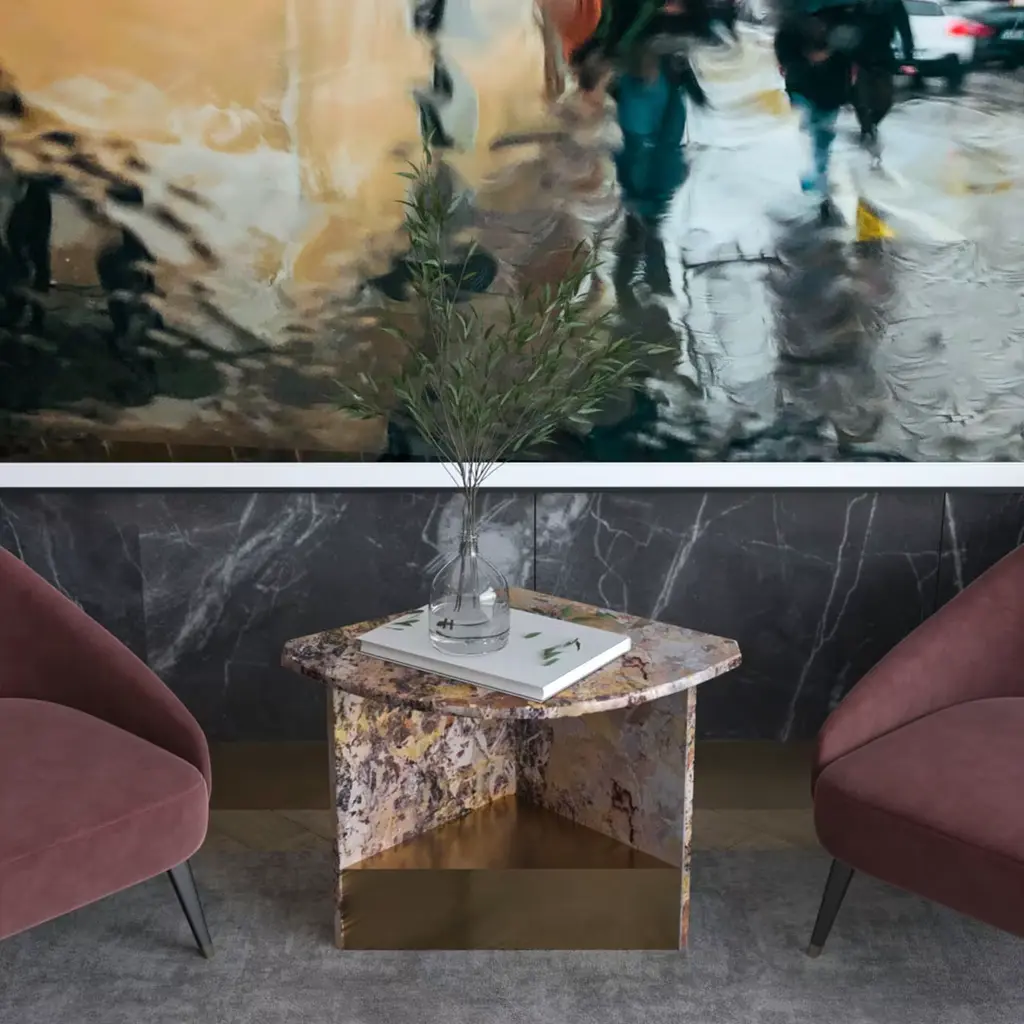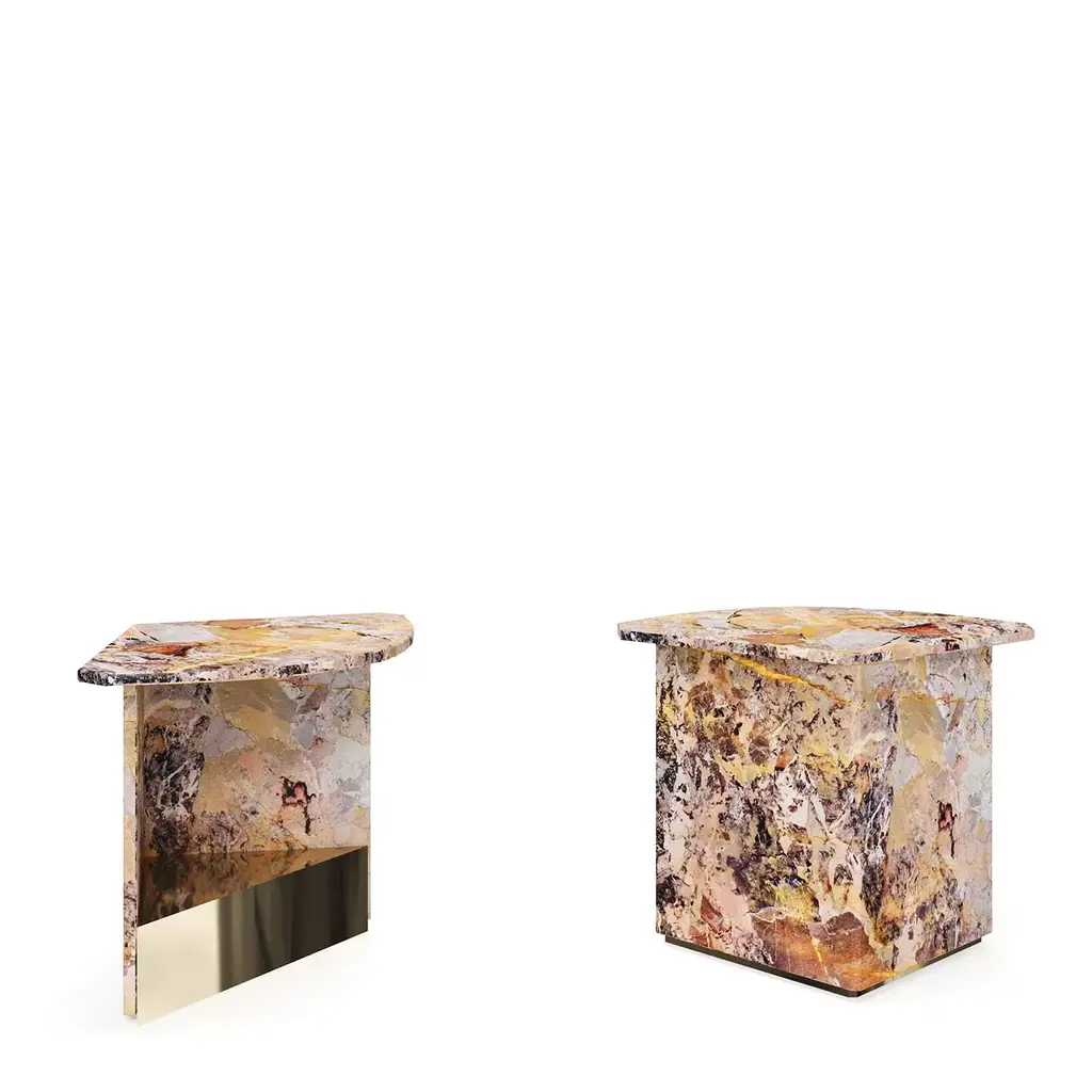 The side table is defined by a sculptural and geometric shape. The table is made of three Opera Fantastico marble slabs and is designed to accommodate a triangular solid metal base that also serves as a shelve. The top’s arch shape breaks the shape of the structures below. The metal base is made of a glossy bronze finish. The table is available in different marble and metal finishes and it is customizable. Please, contact the Concierge for more information. Due to the nature of the material, the product may slightly vary.