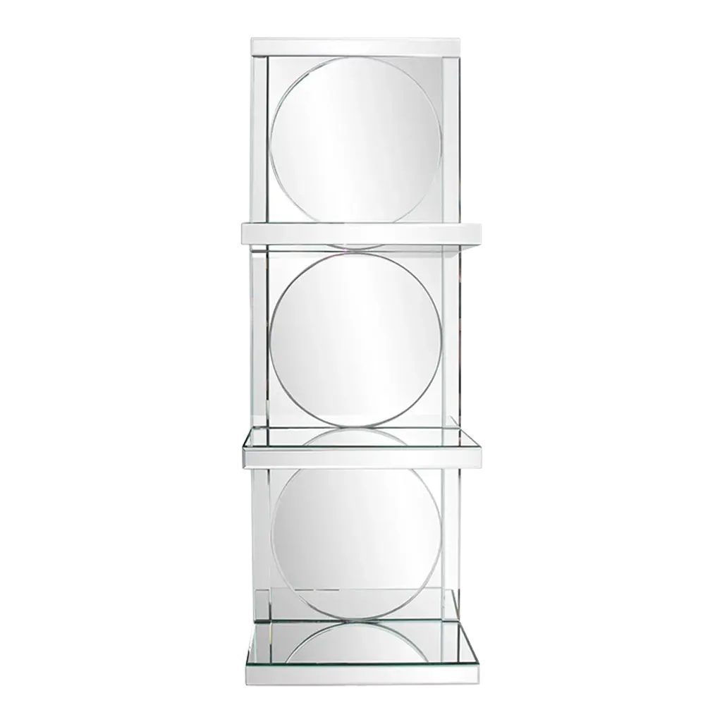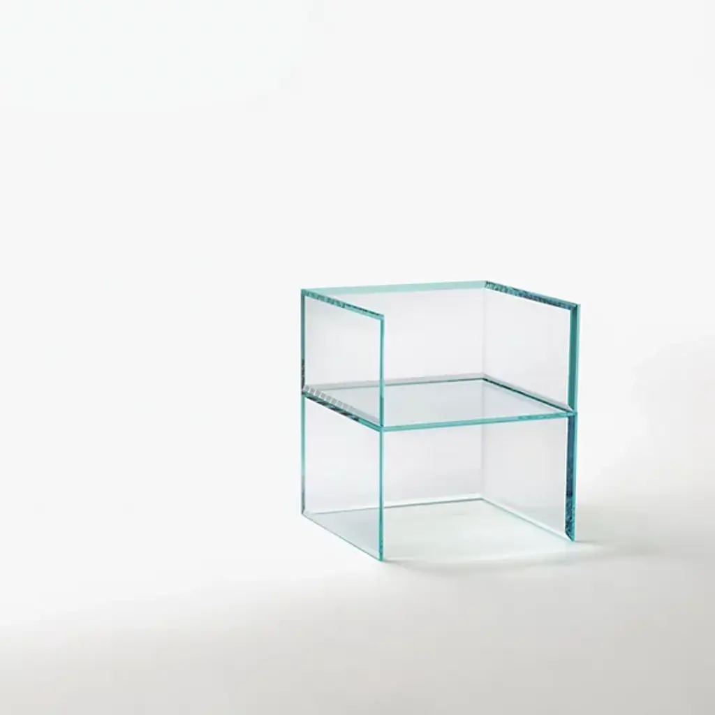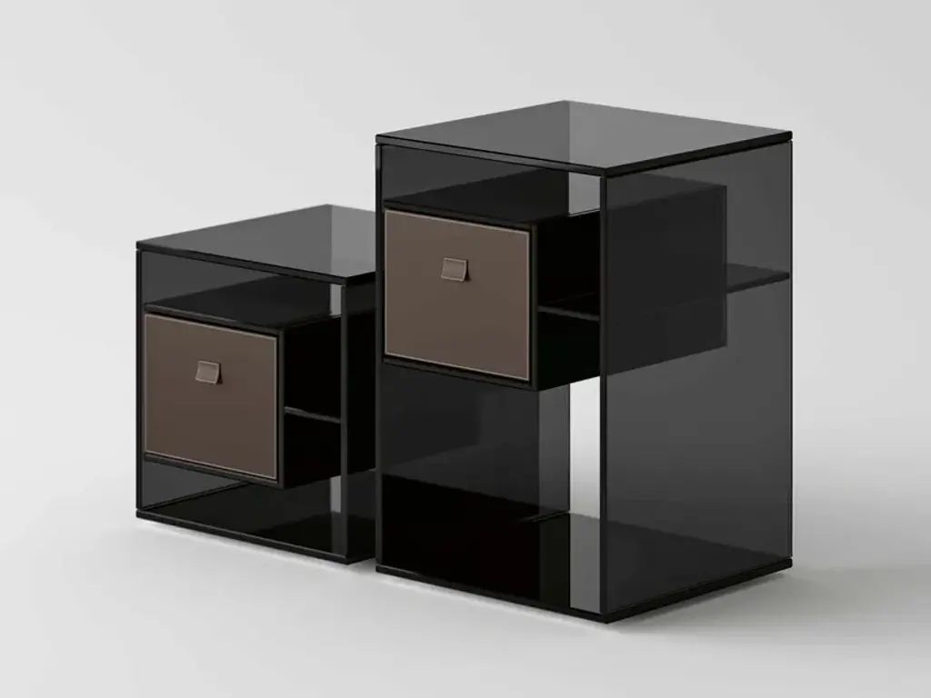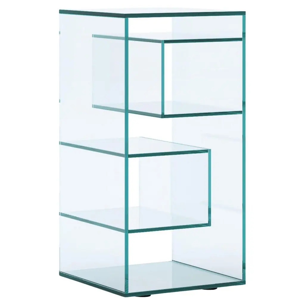 Liber D is an open freestanding double-sided crystal bookcase.Designer Luca Papini created the bookcase Liber in 2013, starting from a sole geometric form which then gave life to the system in transparent, extra clear or smoked glass. The bookcase thus varies and changes in several versatile elements, each with its own function: bookcase with mirrored base, sideboard supported by glass feet and small tables that can be used as bed side tables. The designer bookcase Liber is available with wooden drawers in walnut, matt white or RAL lacquered, or covered in leather.From a single shape, the Liber system becomes many versatile elements, each with its own function: bookcase with mirror base, chest resting on glass feet and table that can be used as bedside table.