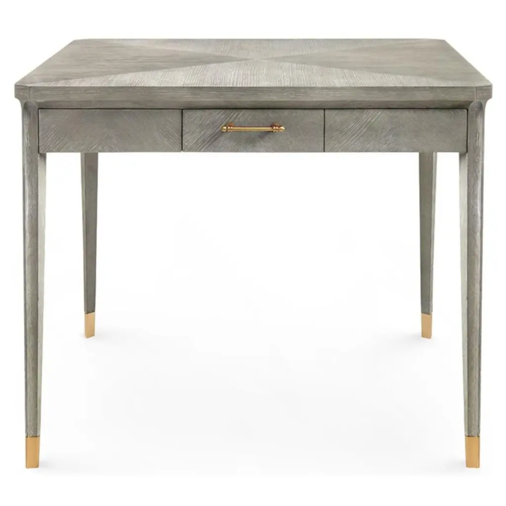 The Lido Drawer Side Table, crafted from Prima Vera veneer in our dark Bistre finish and complimented by a beautifully honed inset Crema Marfil marble stone top, features a sophisticated tapered silhouette and reeded carved details. The custom forged hardware, finished in a dark rubbed bronze, echoes the reeding throughout.