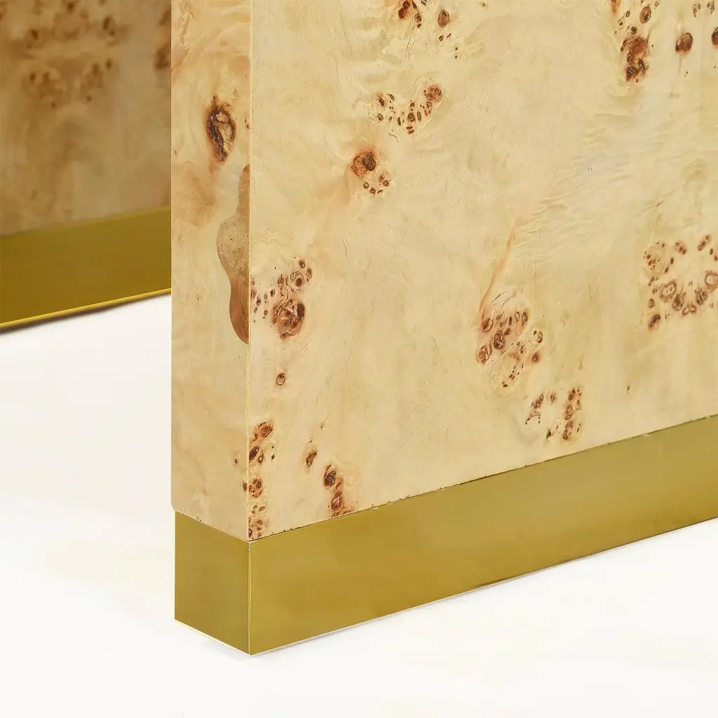 Crafted from luxurious clear polished mappa burl wood veneer, this table showcases its unique grain patterns. The minimalist waterfall design is elevated with brass accents at the base, adding a modern touch to its timeless aesthetic.Perfect for living rooms or bedrooms, this versatile end table serves as a striking accent piece, ideal for displaying decor, holding a lamp, or keeping essentials within reach. Its clean lines and refined details make it a must-have for elegant interiors.Dimensions: 20" W x 20" D x 22" H