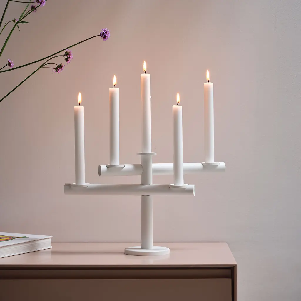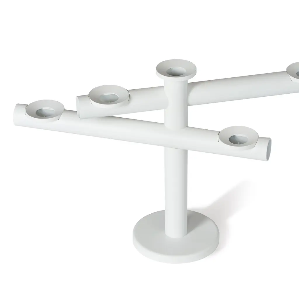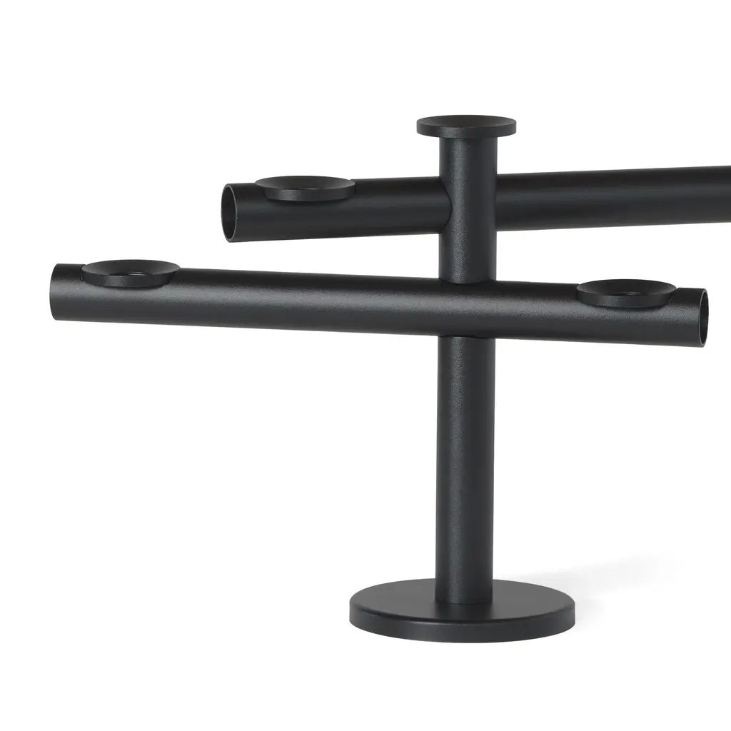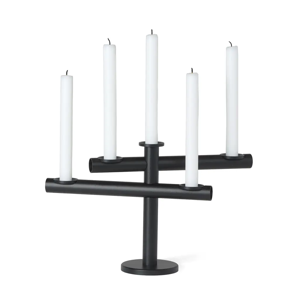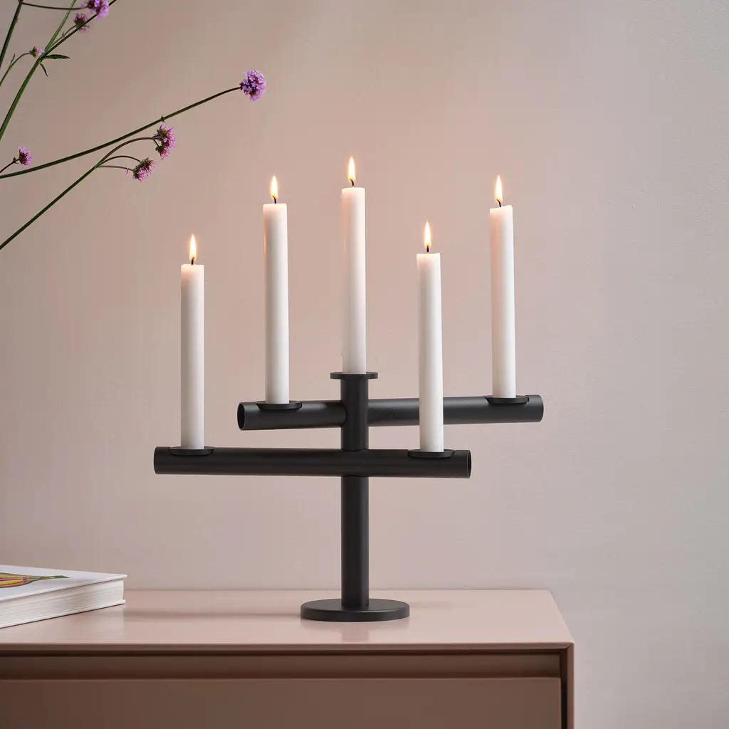 Set the mood and the dining table in style with Light My Fire. Created by Dutch designer Frederik Roijé, this modern candelabra references both the majestic allure of fairy tale candelabras and the warmth of an open flame candle. Made from solid steel with a powder-coated finish, Light My Fire features cylindrical elements that come together in a dynamic composition. The two slightly offset arms merge with the frame and can hold two and three candles, respectively. Drip rings catch the melted wax, so it doesn’t reach the table surface or the body of the candelabra. Perfect as a centerpiece for the dining table, Light My Fire also suits side tables and sideboards. Manufactured responsibly, every Frederik Roijé candelabra is made locally in the Netherlands.