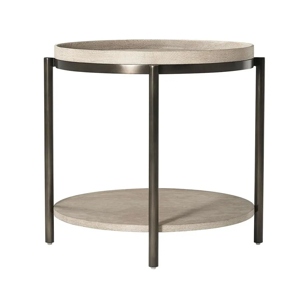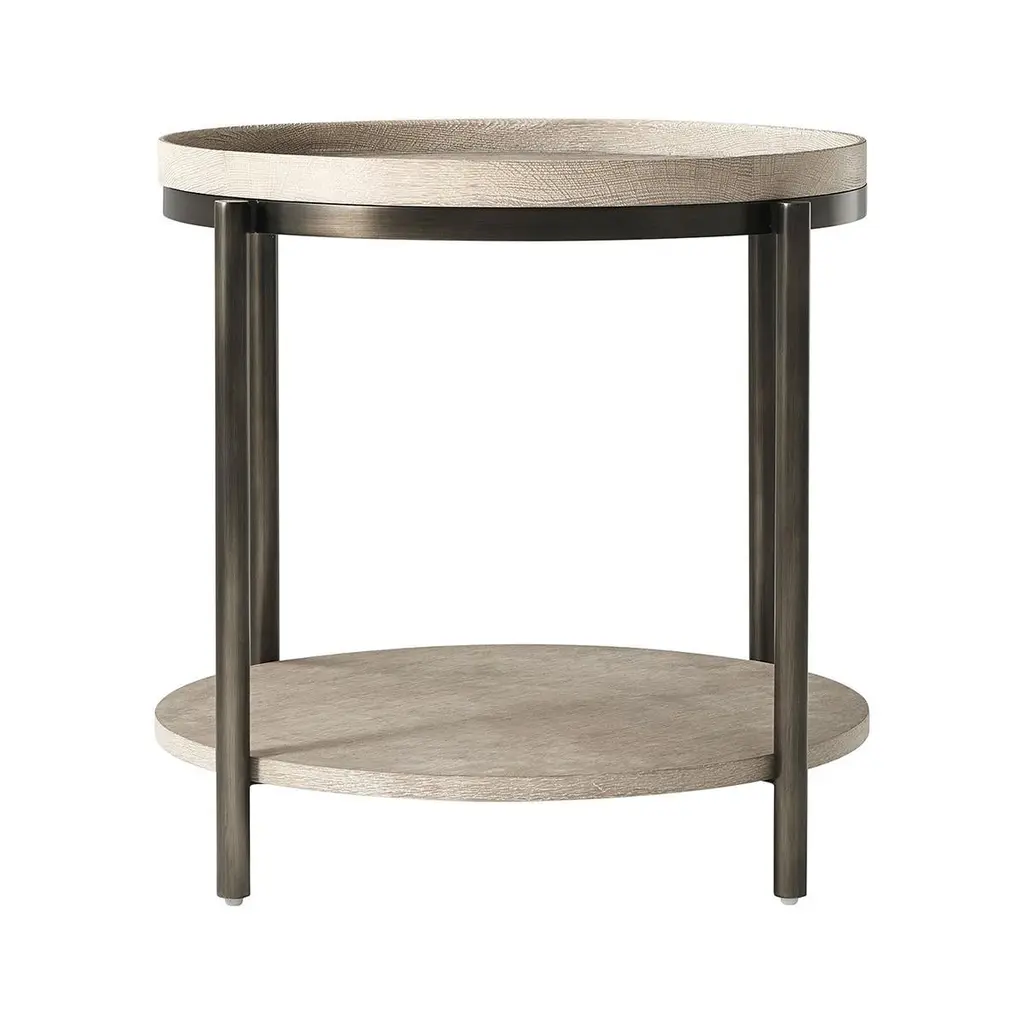 from the oak tray top to the contrasting bronze metal legs, the table adds a little zen to your space. An intensive multi-step hand finish on this piece brings out the natural wood grain of the light greyed oak. An open-air bottom shelf provides a little extra space for extra storage.Dimensions: 24.25" W x 24.25" D x 22" H