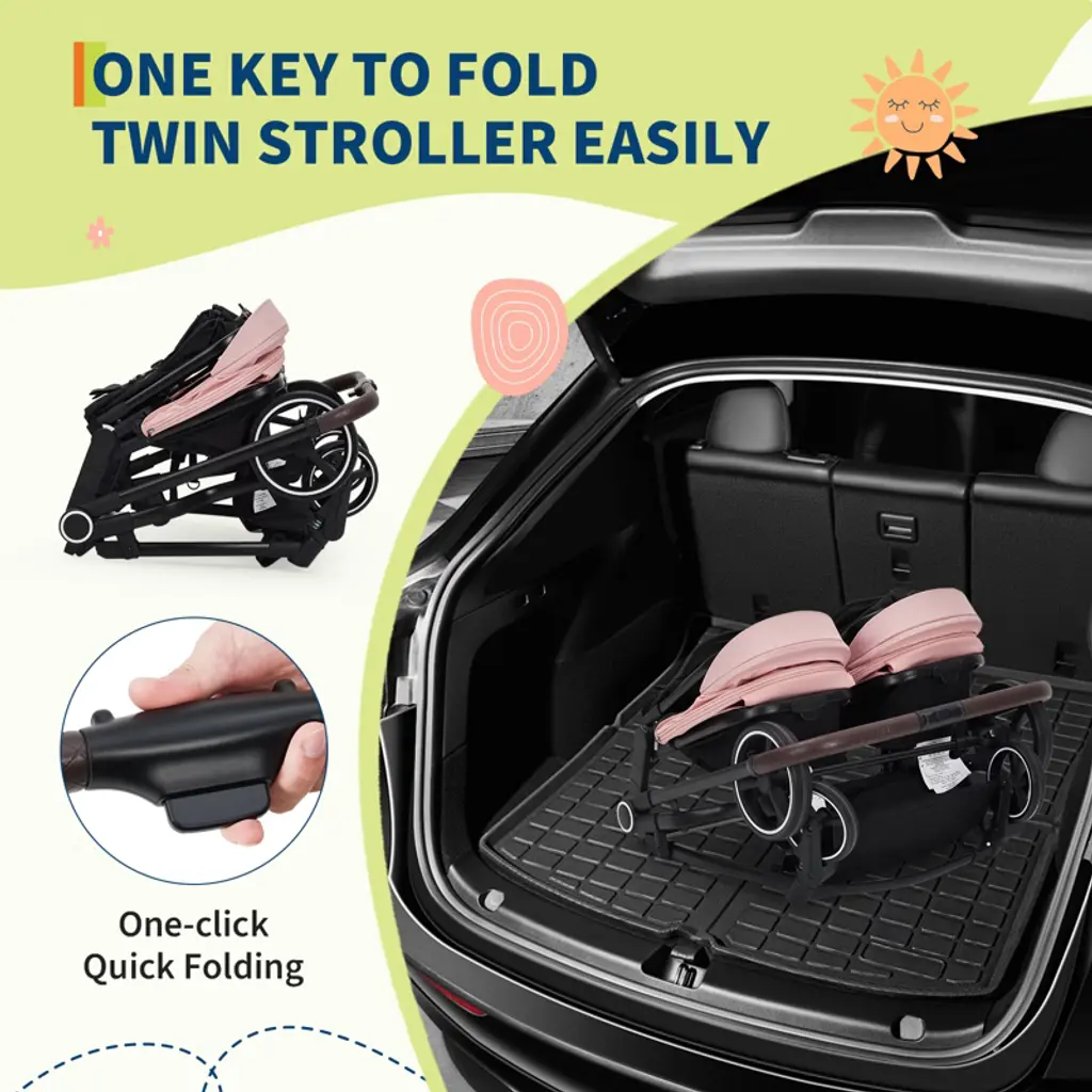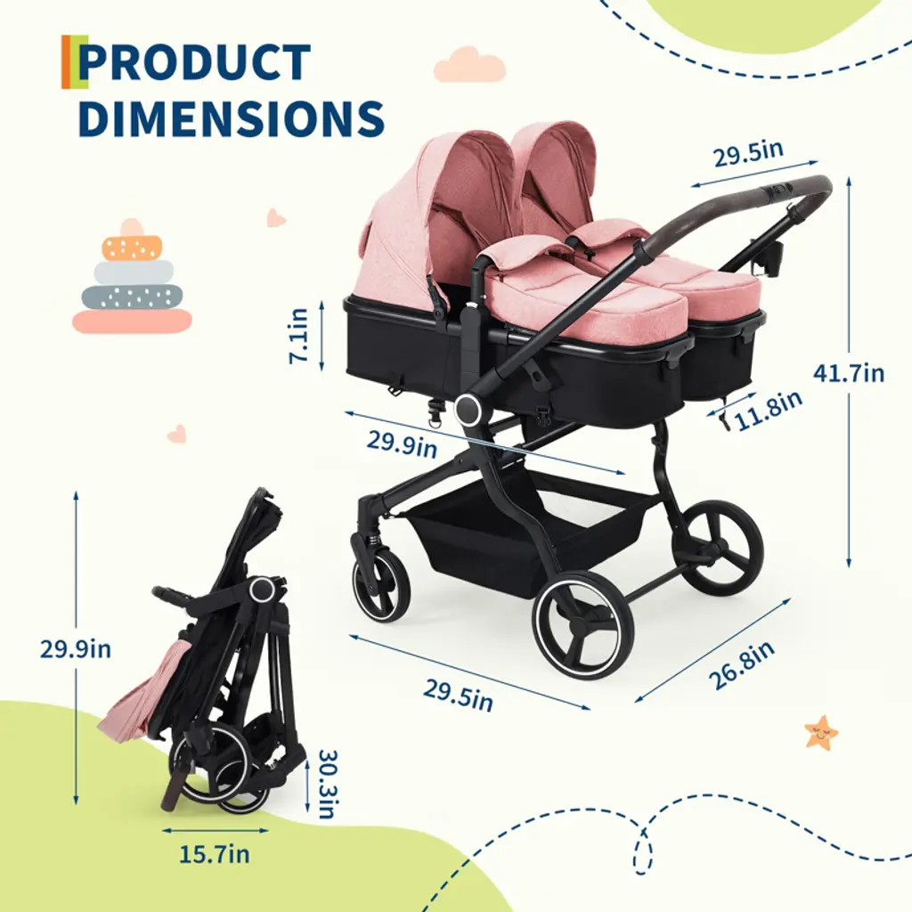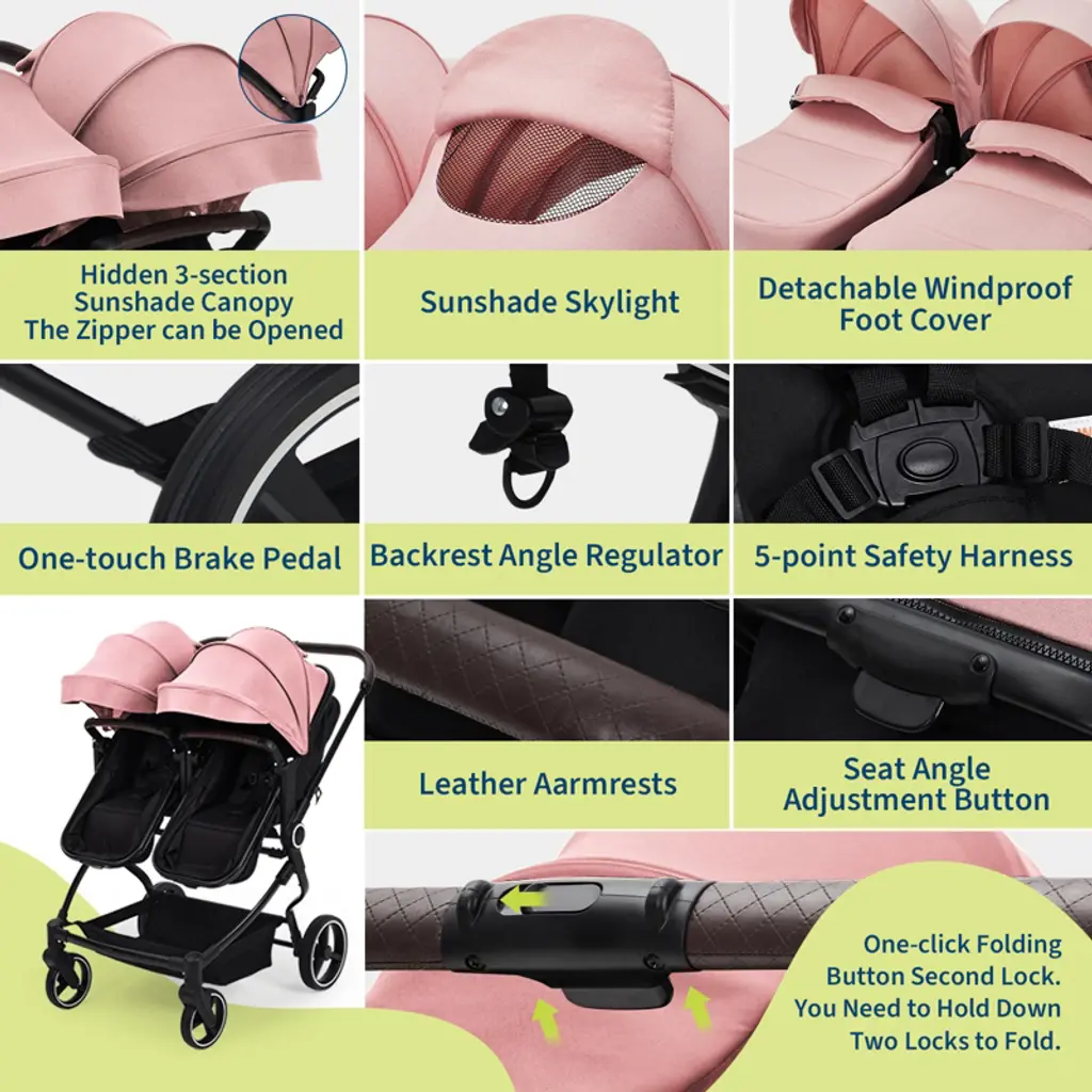 Product DescriptionThis double stroller offers effortless one-click folding with a secure double lock for easy storage and travel. Both seats feature adjustable backrests with multiple recline modes to keep your little ones comfortable at any age. The all-weather canopy includes a hidden sunshade, skylight, and detachable windproof foot cover for protection against sun, wind, and rain. Safety is prioritized with a 5-point harness, leather armrests, and a one-touch brake, while the elevated design keeps kids away from car exhaust and enhances their view. Plus, easily switch seat directions and adjust angles for a customized, convenient ride every time.Product InformationColor: Black/Dark Gray/Light Gray/PinkShape: RectangularFabric Type: FabricFrame Material: AluminumItem Weight: 33.07 PoundsItem Dimensions L x W x H: 29.5"L x 26.8"W x 41.7"H