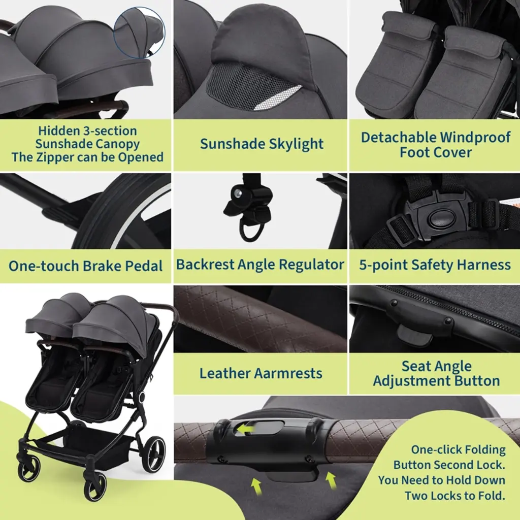 Product DescriptionThis double stroller offers effortless one-click folding with a secure double lock for easy storage and travel. Both seats feature adjustable backrests with multiple recline modes to keep your little ones comfortable at any age. The all-weather canopy includes a hidden sunshade, skylight, and detachable windproof foot cover for protection against sun, wind, and rain. Safety is prioritized with a 5-point harness, leather armrests, and a one-touch brake, while the elevated design keeps kids away from car exhaust and enhances their view. Plus, easily switch seat directions and adjust angles for a customized, convenient ride every time.Product InformationColor: Black/Dark Gray/Light Gray/PinkShape: RectangularFabric Type: FabricFrame Material: AluminumItem Weight: 33.07 PoundsItem Dimensions L x W x H: 29.5"L x 26.8"W x 41.7"H