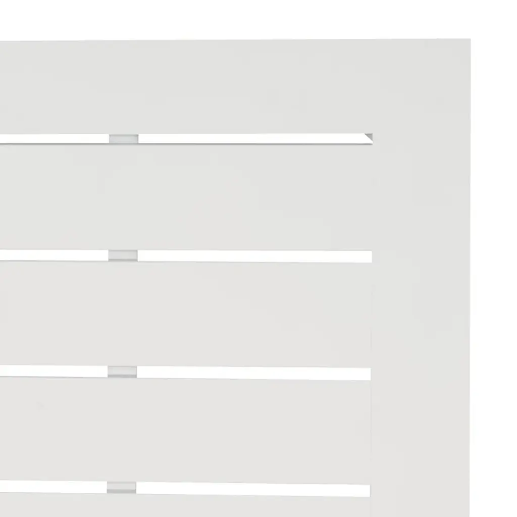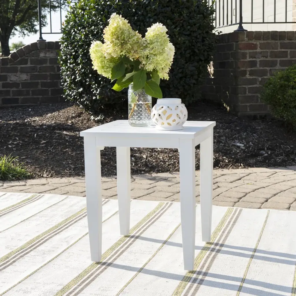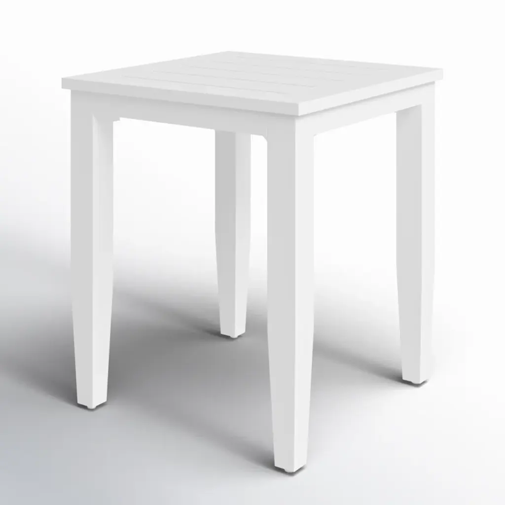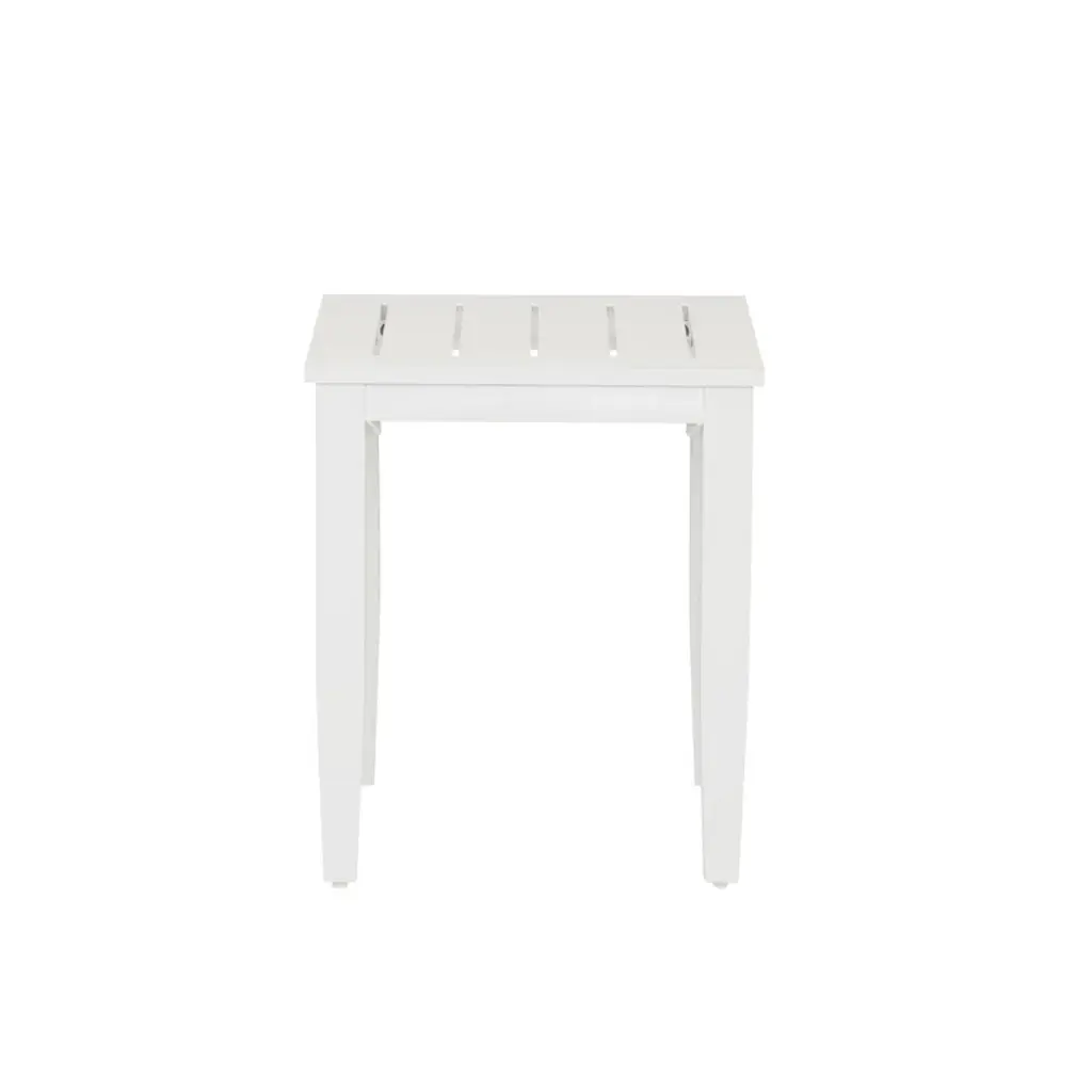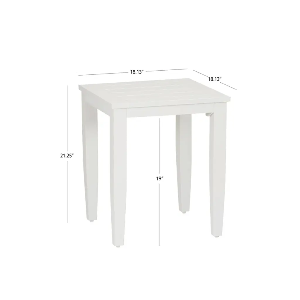 Introducing our Outdoor Aluminum White Side Table, a harmonious blend of style and resilience for your open air haven. Crafted with enduring aluminum and adorned with a pristine white powder coated finish, this side table effortlessly enhances your outdoor space with modern elegance. Revel in the outdoors with a side table that effortlessly withstands the elements. Its compact dimensions (18.125"L x 18.125"D x 21.25"H) make it a versatile addition, perfect for holding drinks, books, or potted plants. With a robust weight capacity of 150lbs, this outdoor side table brings both functionality and enduring beauty to your alfresco moments.