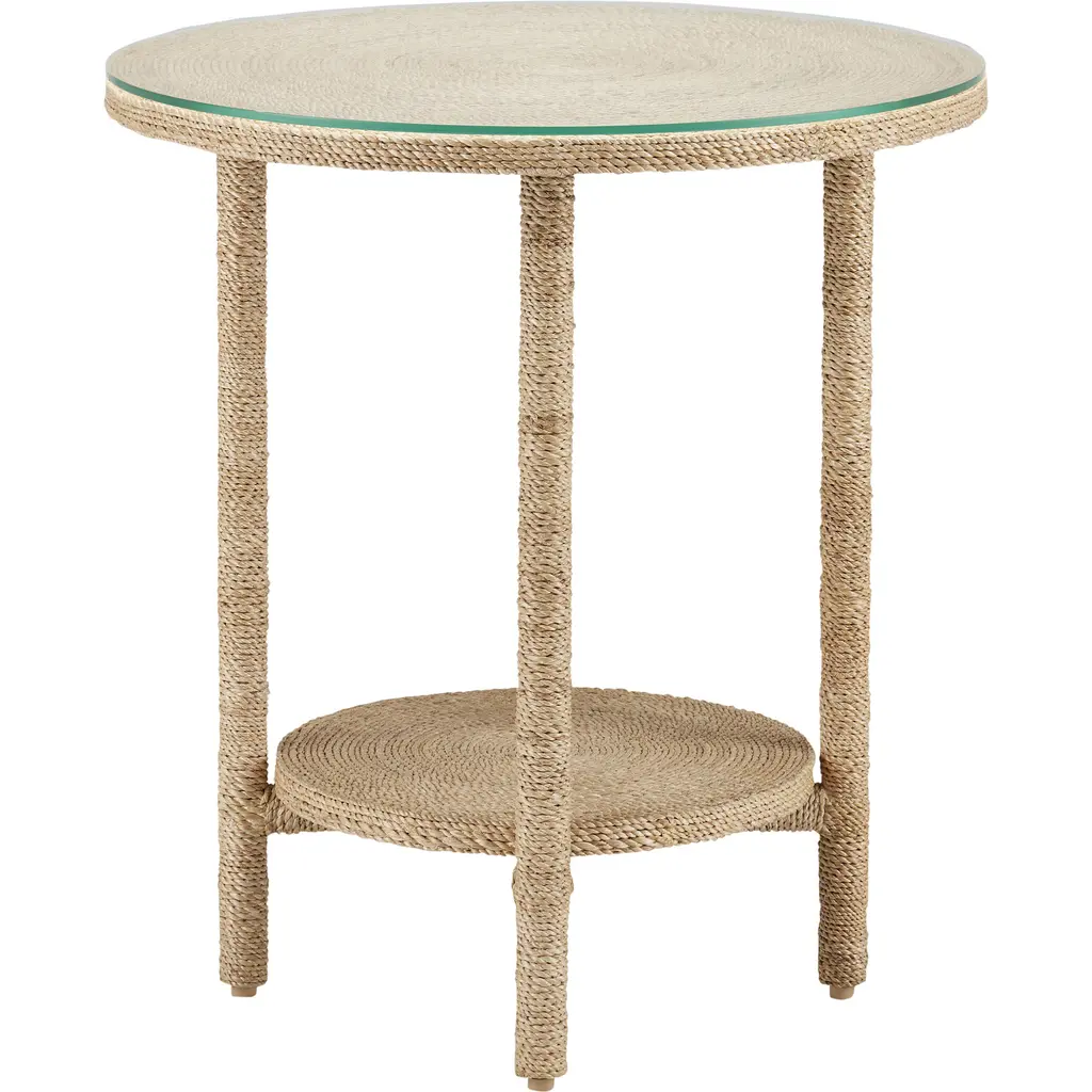 The wrought iron and wood frame of the Limay Accent Table is wrapped in natural abaca rope. The precision with which artisans cover the vertical and horizontal lines and the disk elements on the rope accent table is accomplished with a painstaking focus that is a hallmark of refined handicrafts. The Limay is topped with a clear piece of glass to keep the top free from stains.