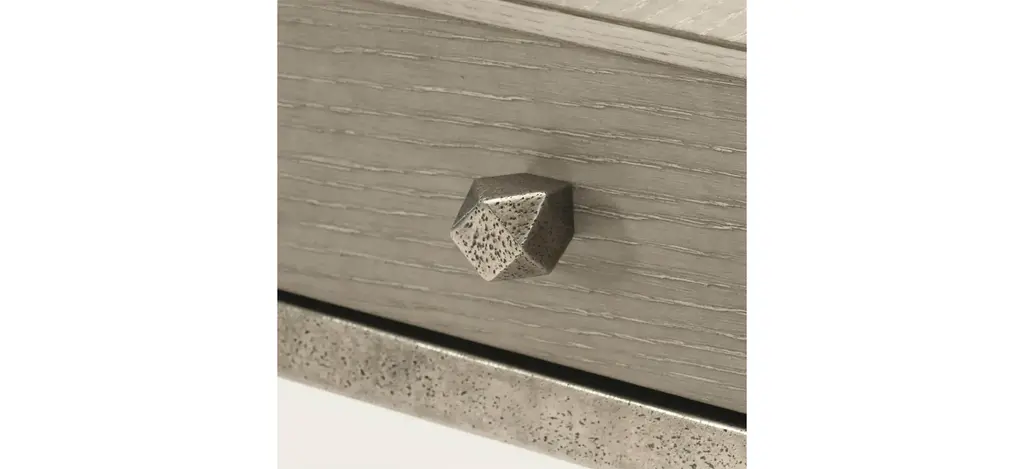 Linea end table, the drama lies in the contrast between the unique finishes and materials. Wire-brushed oak veneers in a Cerused Greige finish add subtle textures while leaving a white hang-up in the grain. The rustic look partners elegantly with the sleek cast aluminum base in a complex Textured Graphite finish. A faceted metal knob adds a jewelry-like feel to this sophisticated piece.