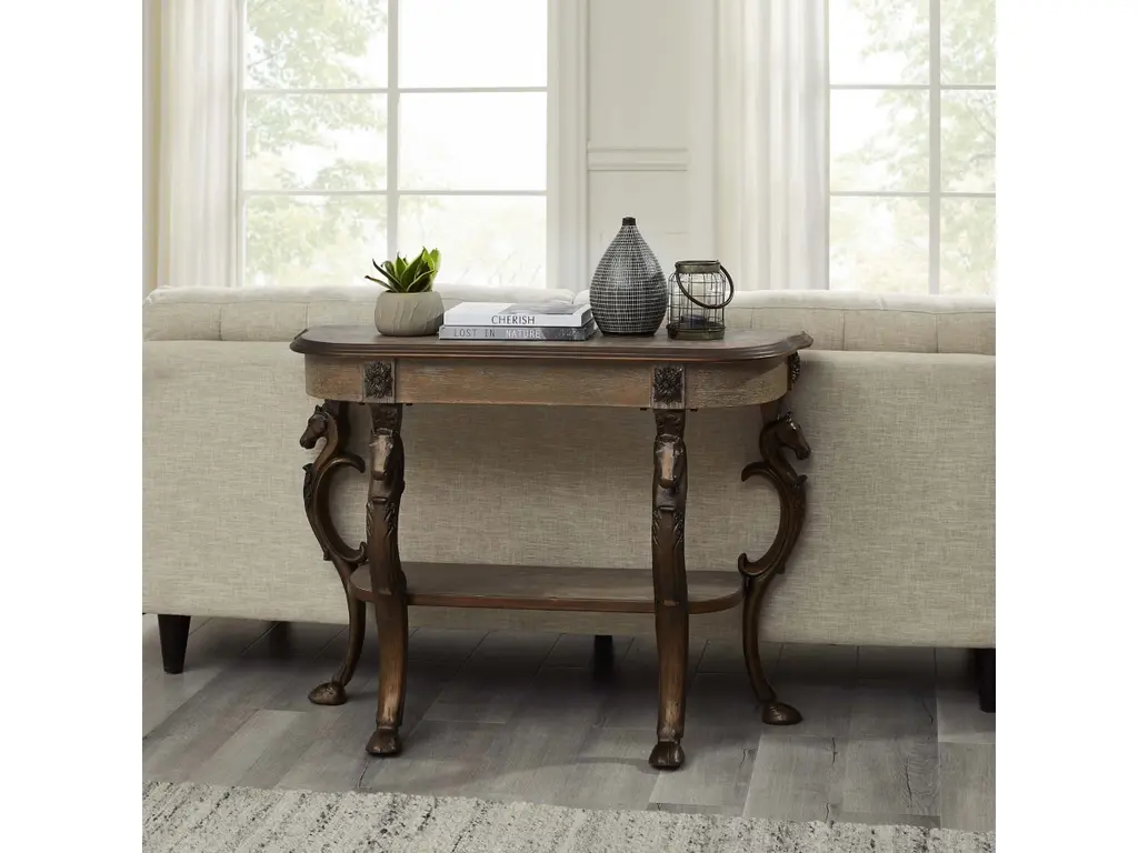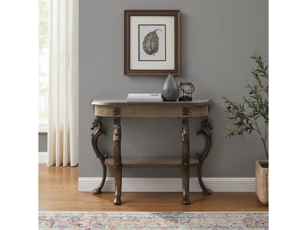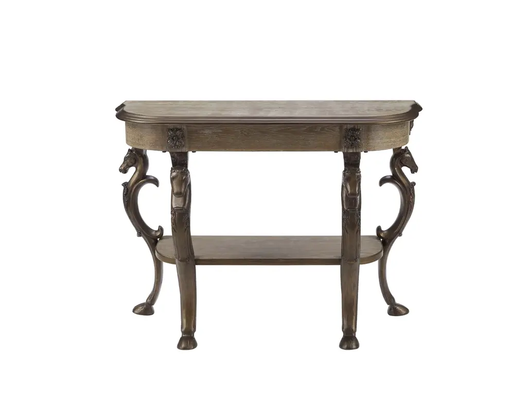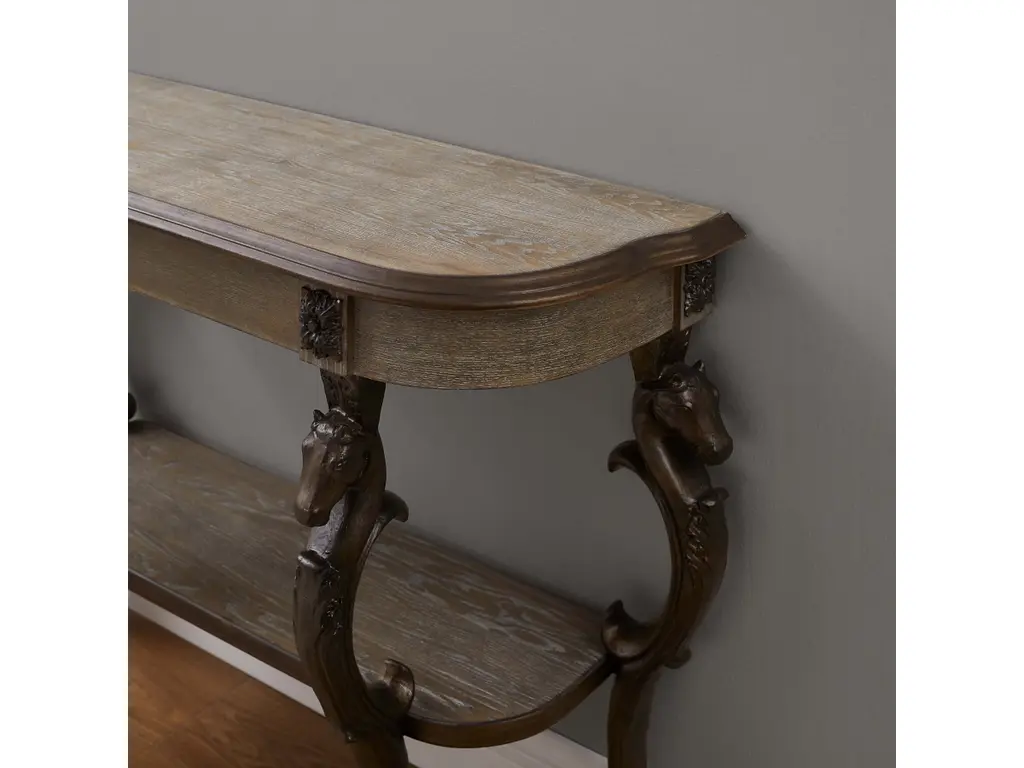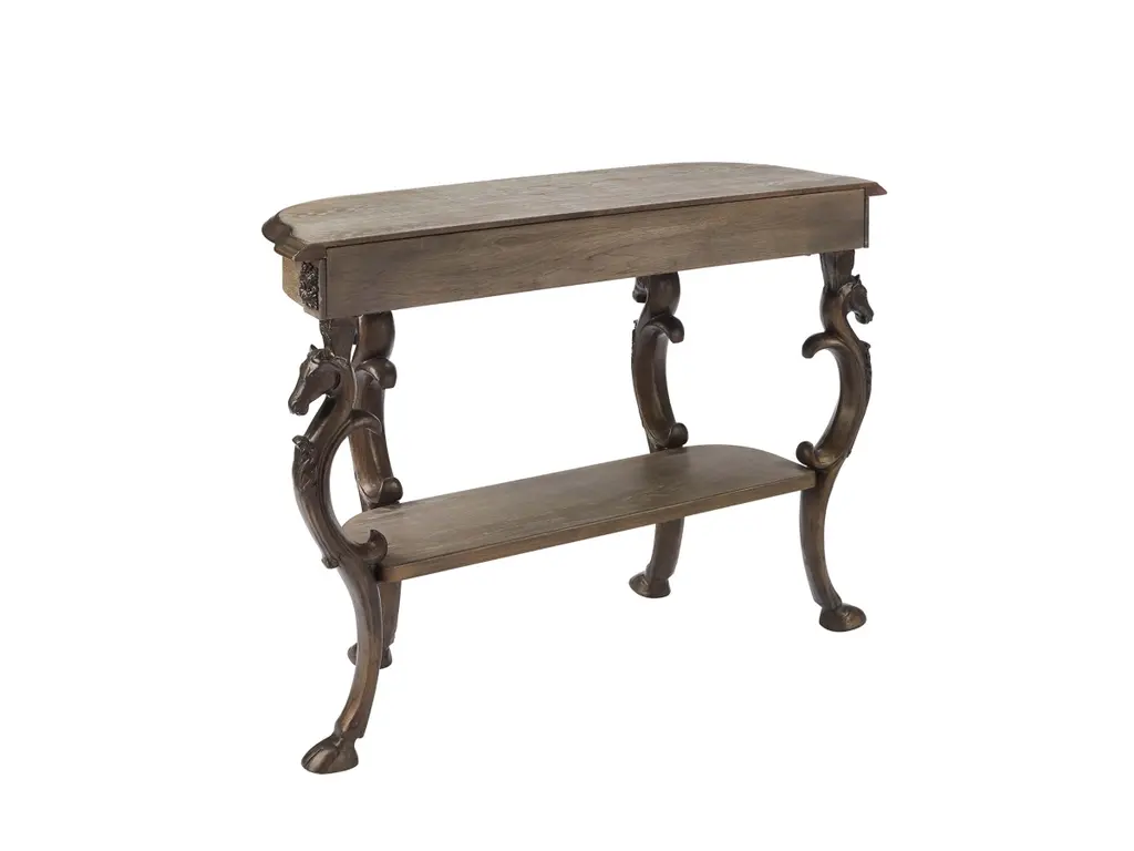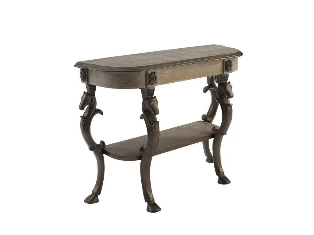 For entryways and living quarters of traditional leanings, this antique-style console offers a timeworn sensibility. Horse heads emerge from the tops of the four iron cast legs in a pewter-tone finish, supported by hooves at the base of the structure. The wooden shelves are covered in a gray wash coating that looks as though it’s been around for decades. The flat backside is made to be placed against a wall, making this piece an ideal console, bedside table or entryway surface.